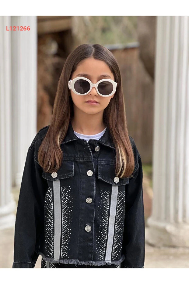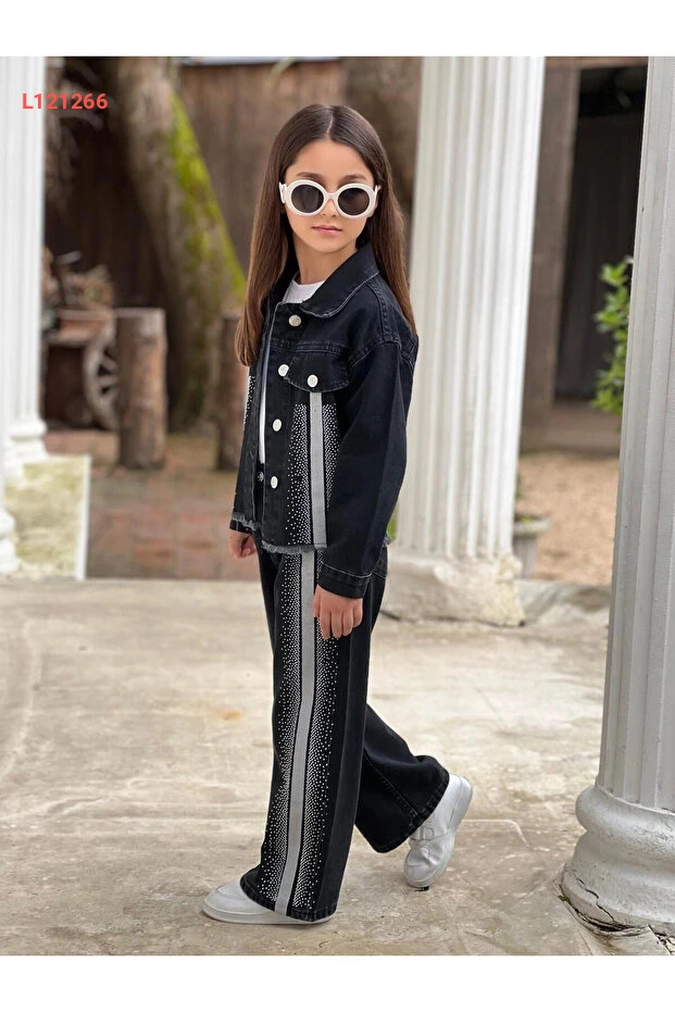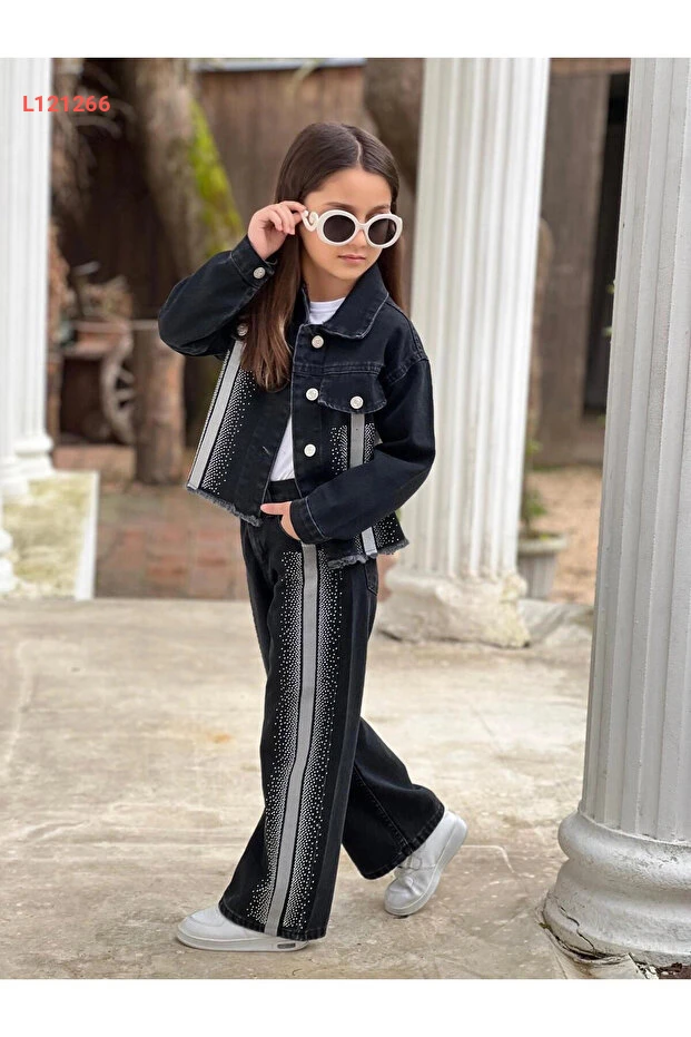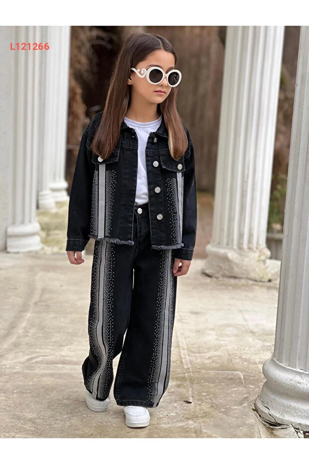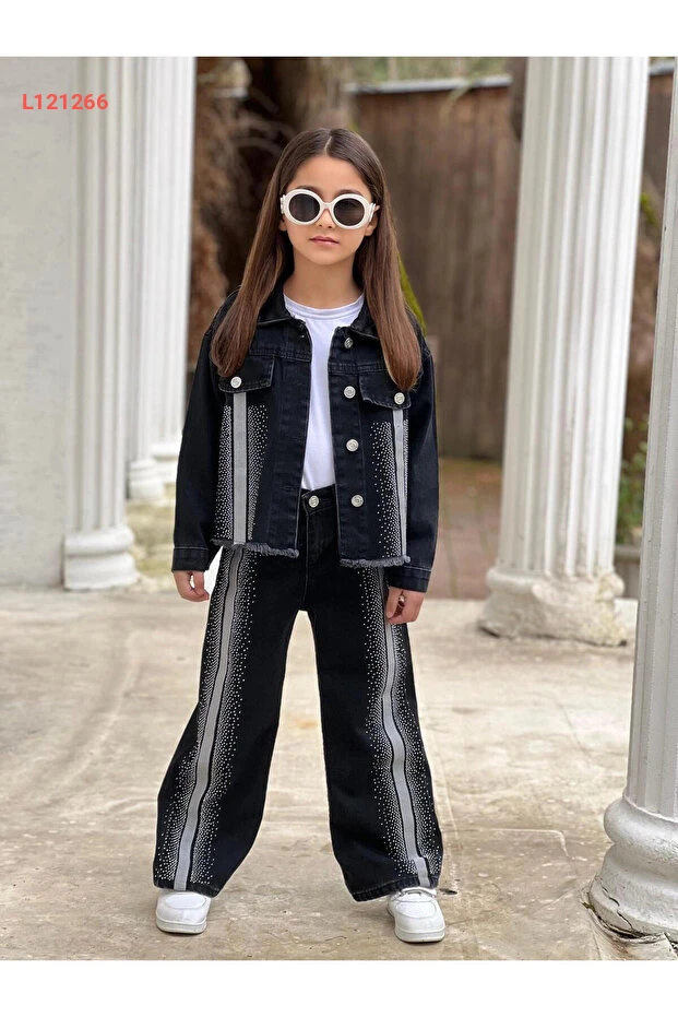 طقم بنطال جينز وسترة أطفال بناتي مزخرفة بالحبّات بلون أسود - للعيد