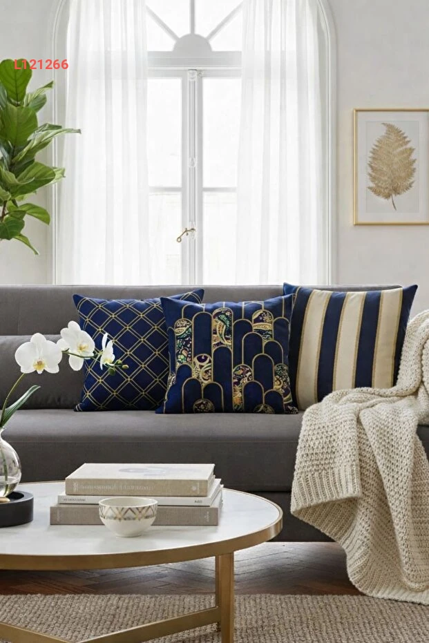 طقم أغطية وسائد ثلاثي - تصميم فني ديكو حديث باللون الأزرق الداكن مع لمسة ذهبية