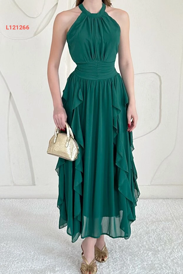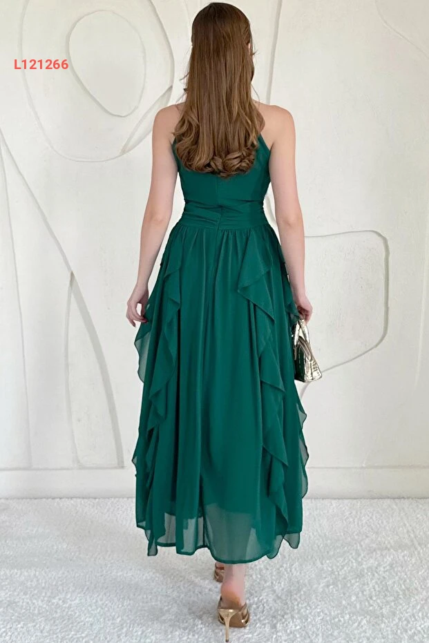 فستان نسائي زمرّدي بتصميم هالة مع بطانة من إلبي فاشن