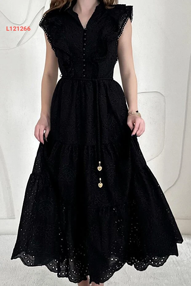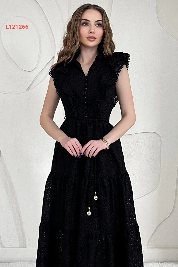 Elbee Fashion Woman Siyah Fırfırlı Düğmeli Elbise