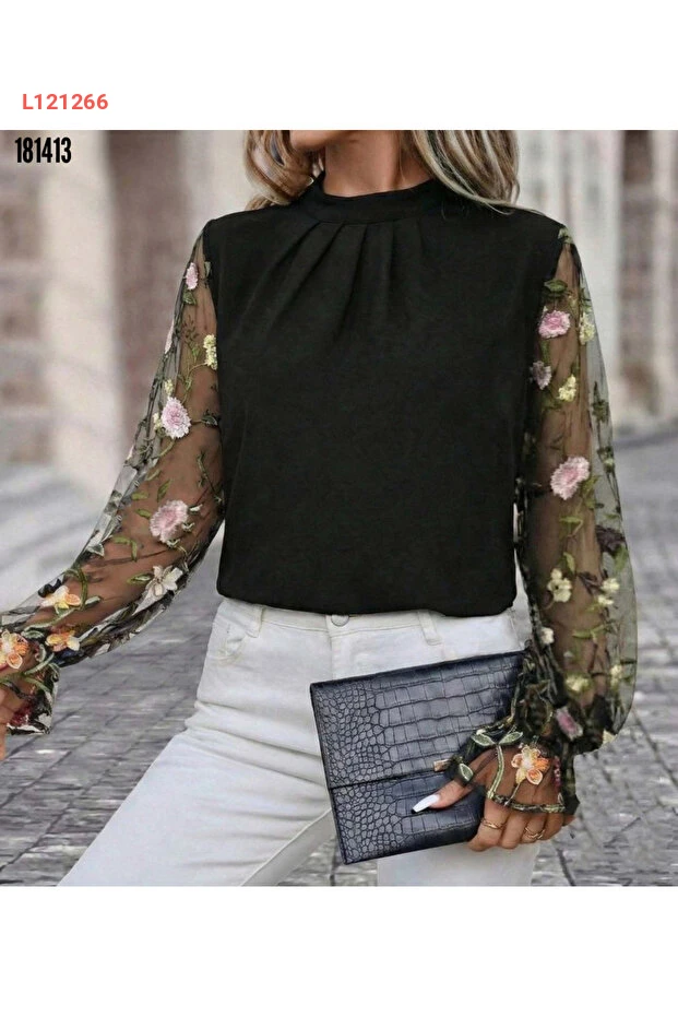 بلوزة كريب أنيقة للنساء برقبة نصف غولف مع تفاصيل تول وأكمام طويلة