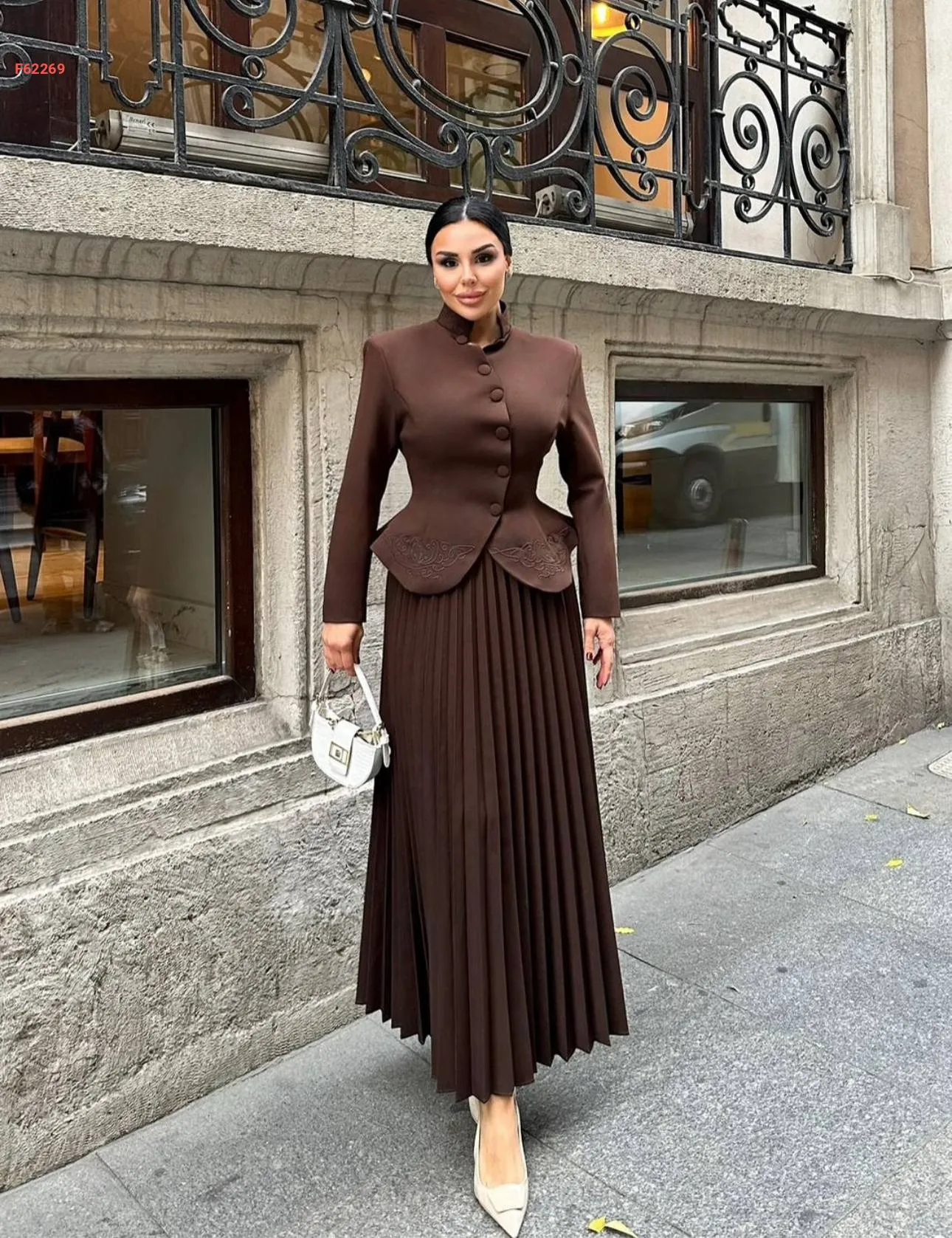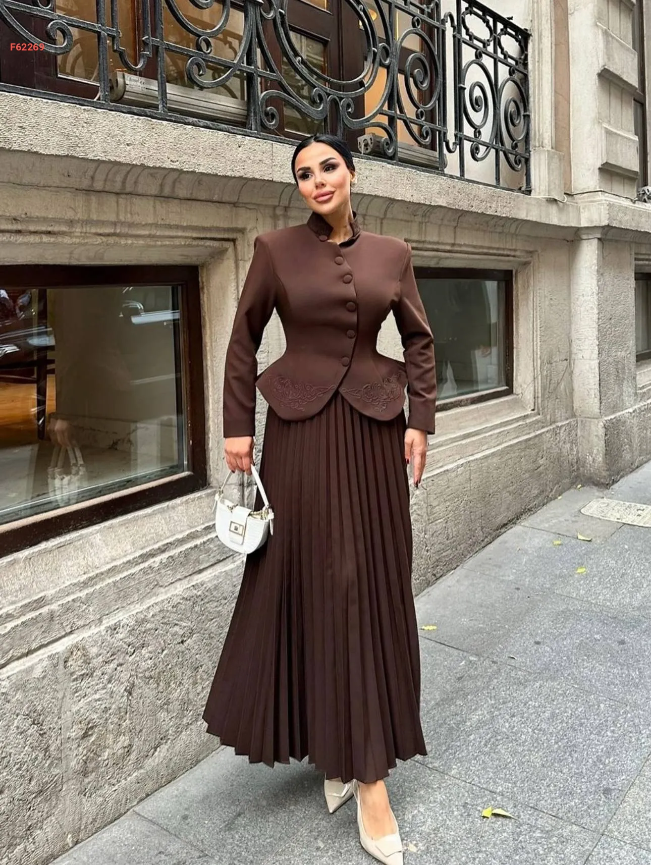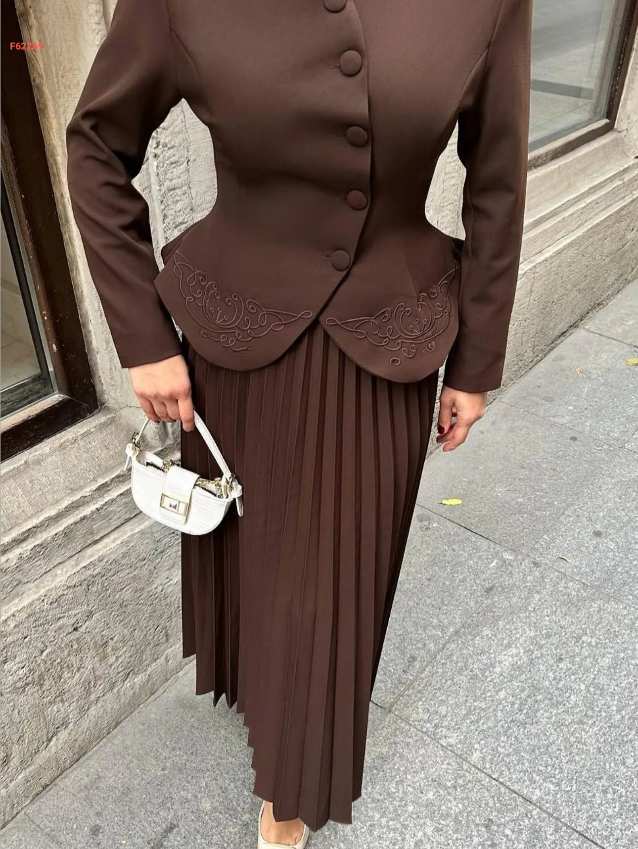 طقم جاكيت انيق مع تنورة مكسرة لون بني