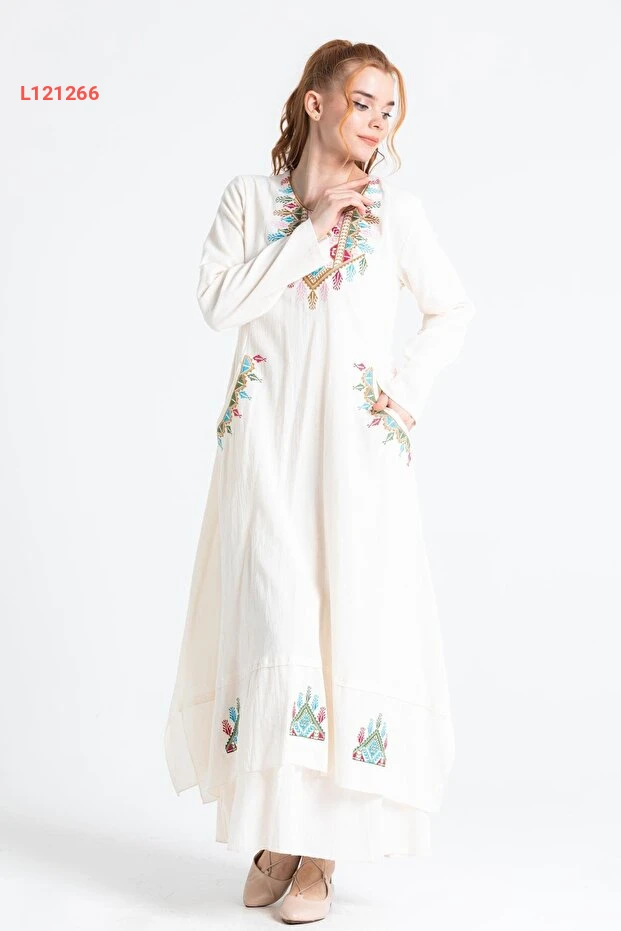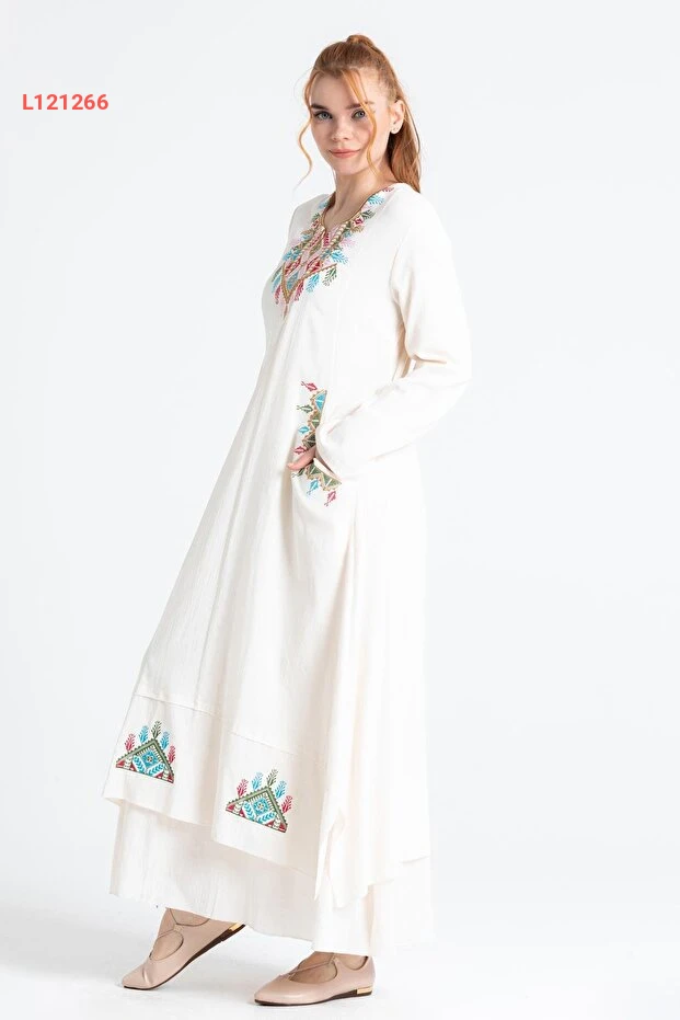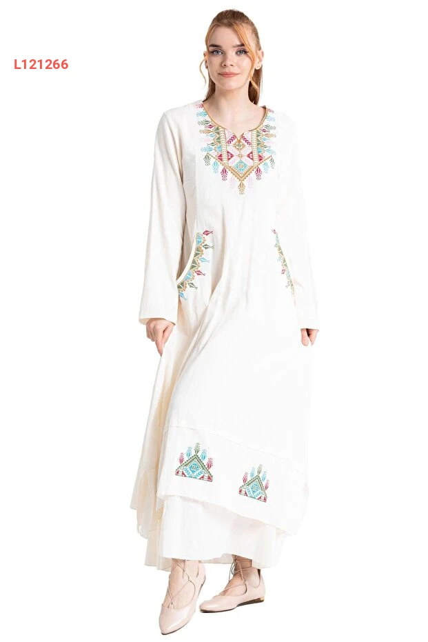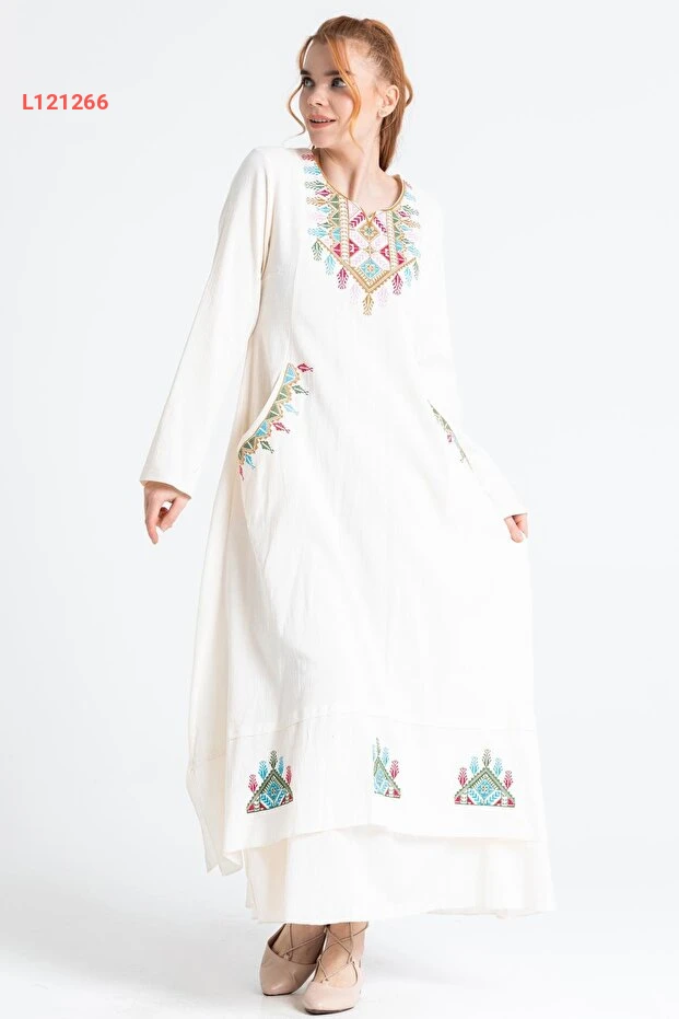 فستان تونك شيلة مزين بالنقوش القديمة بكم طويل كريمي
