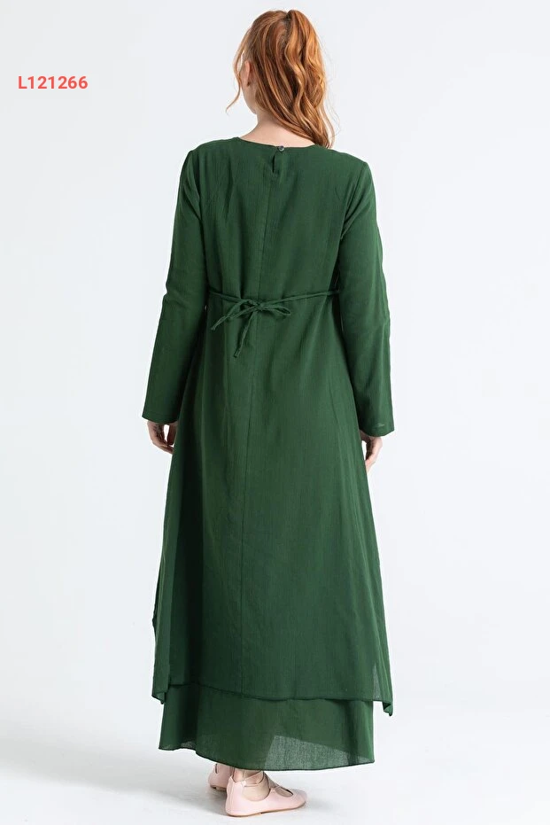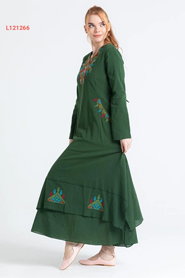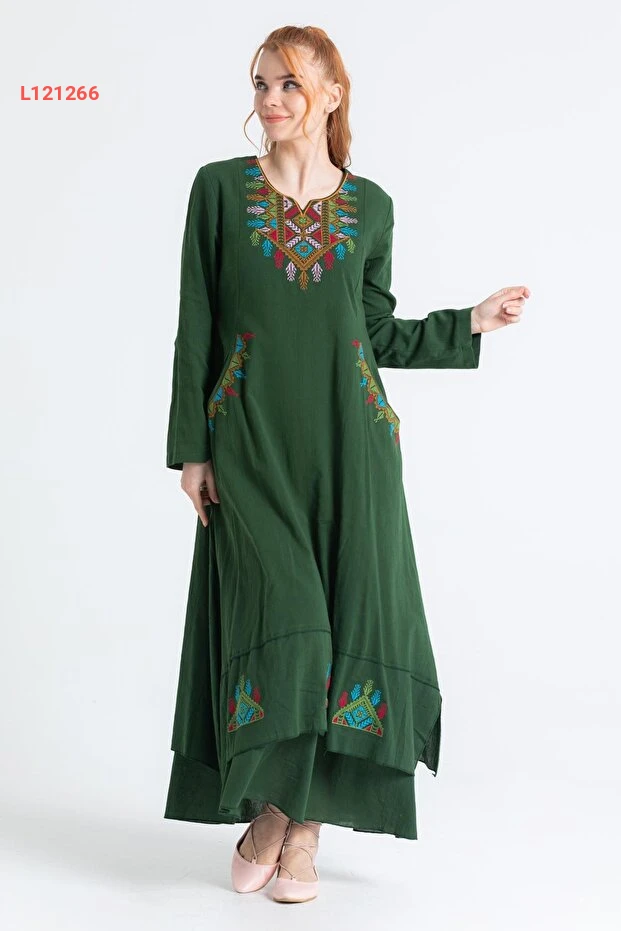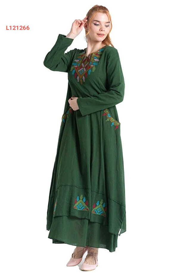 فستان تسريحات شيلة الأنيق بأكمام طويلة ومطرز بالأخضر