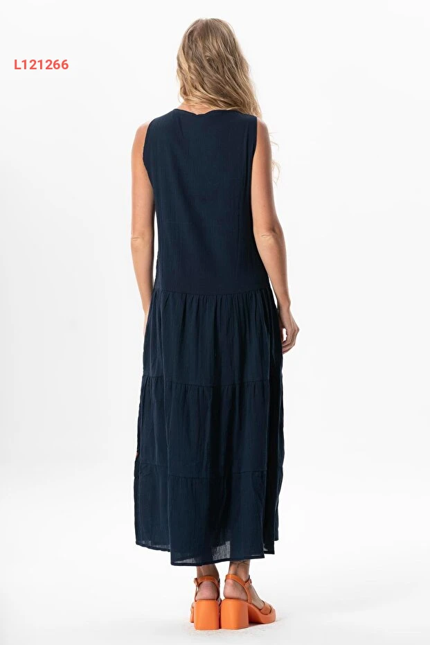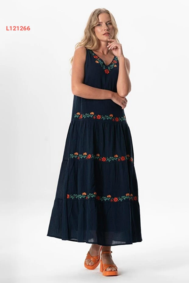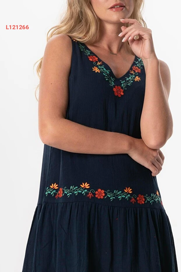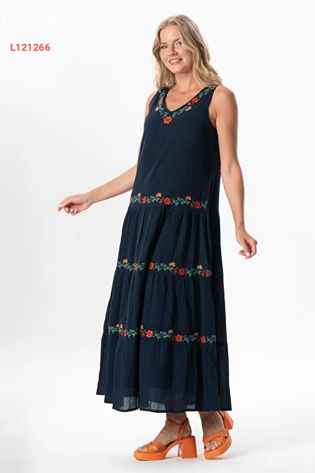 فستان صيفي طويل بدون أكمام بتصميم في على شكل حرف V مزين بالتطريز بلون navy