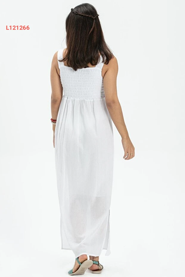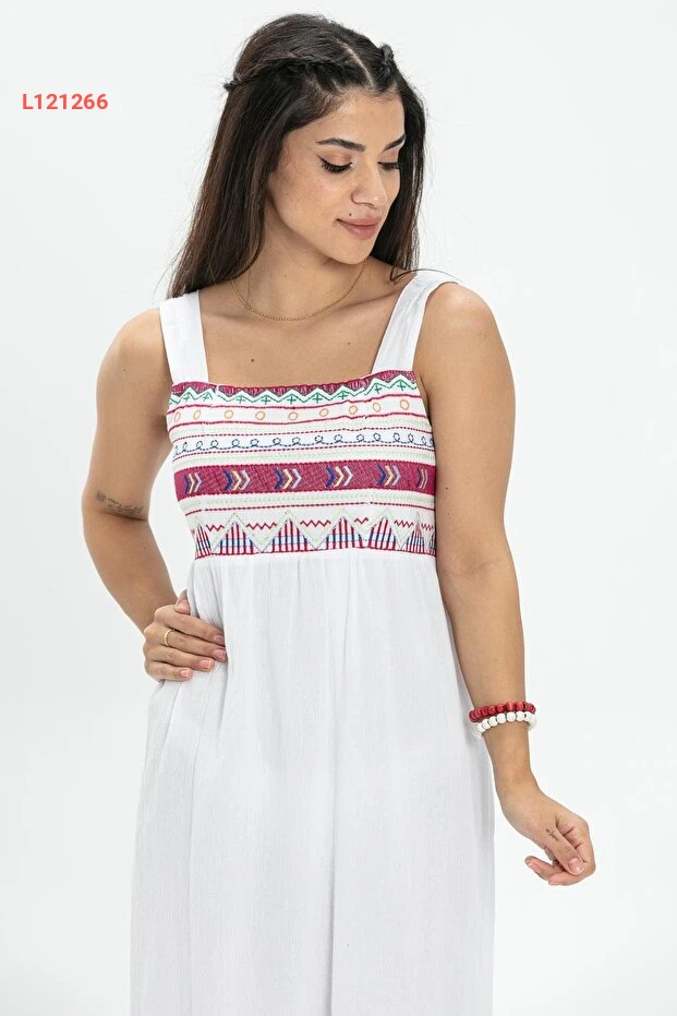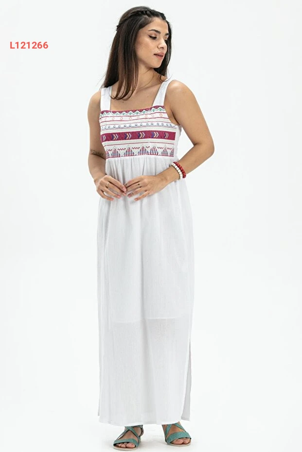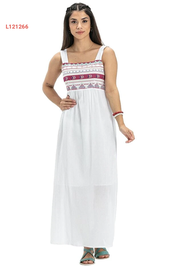 فستان صيفي طويل من قماش شيلي برسومات عصرية لون أبيض