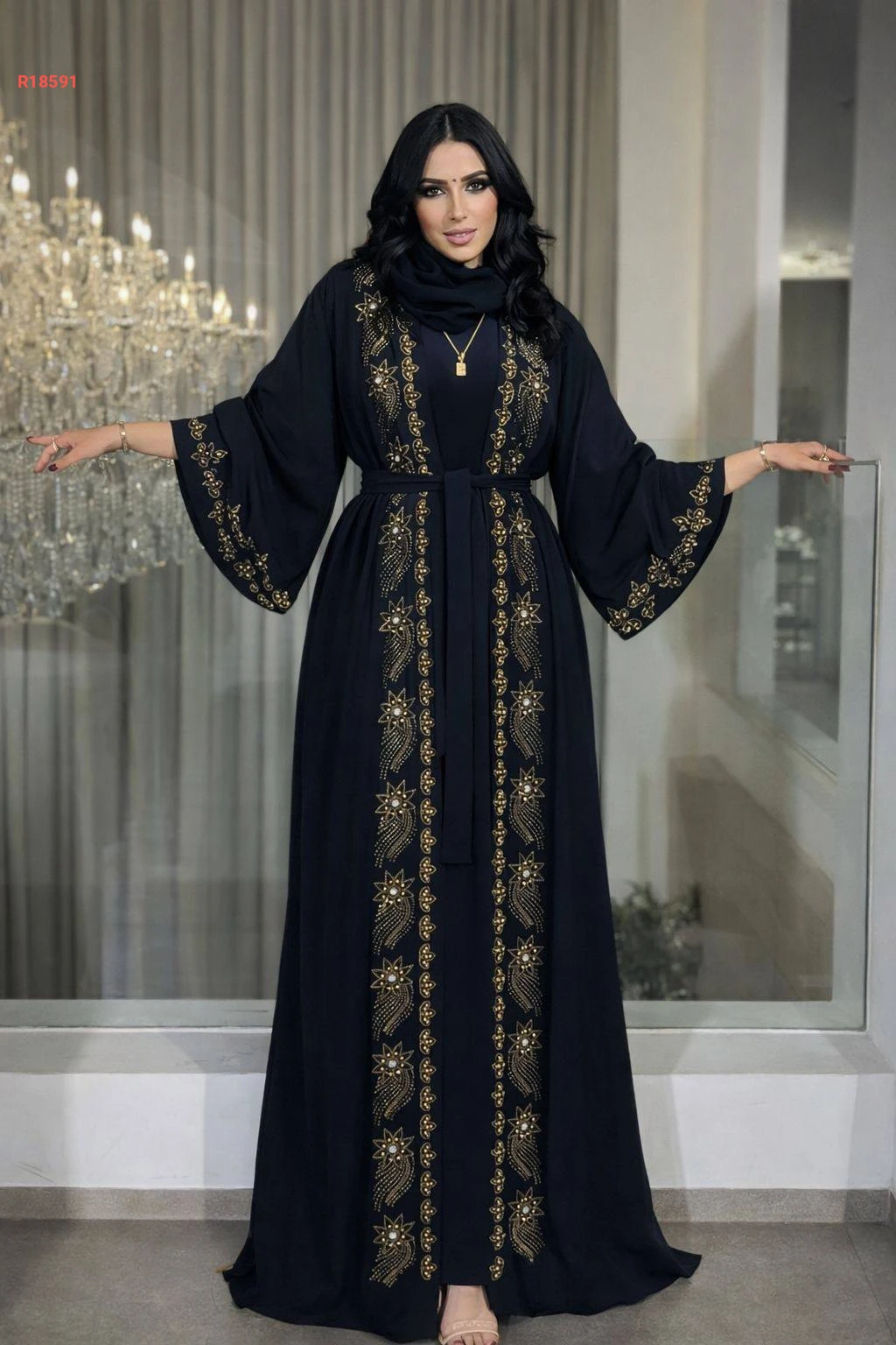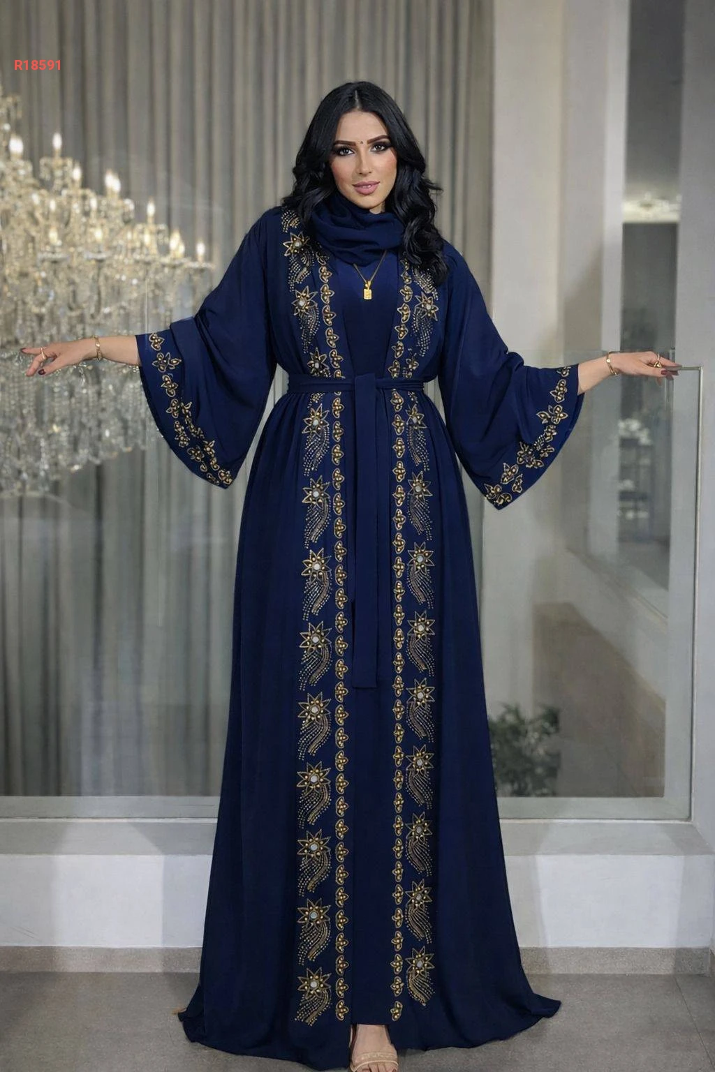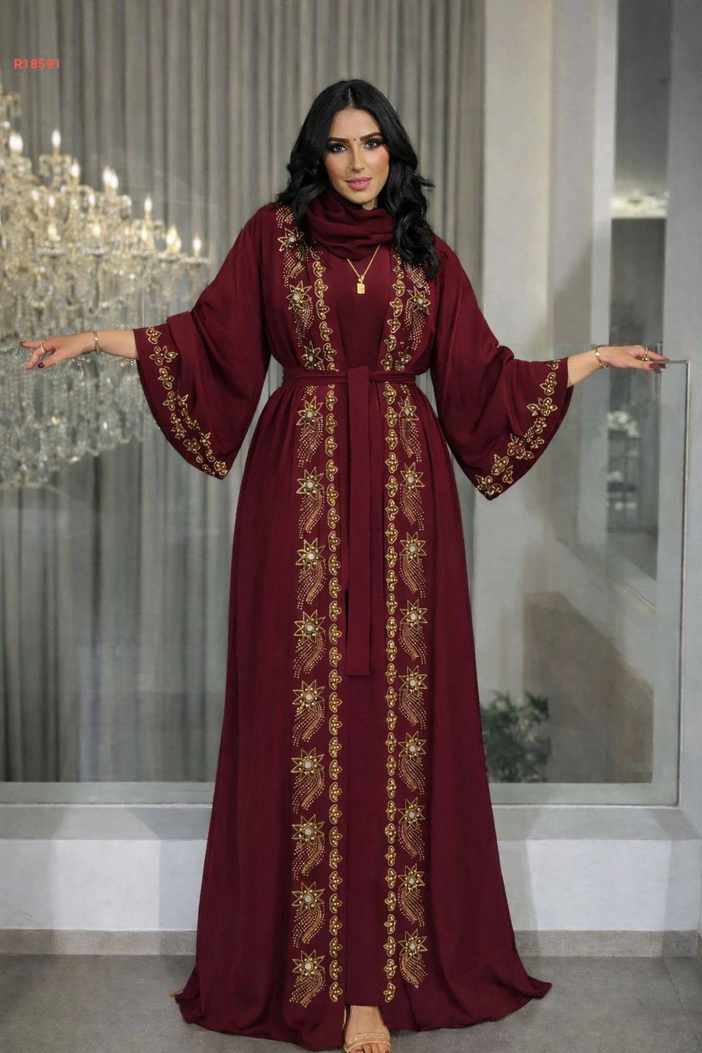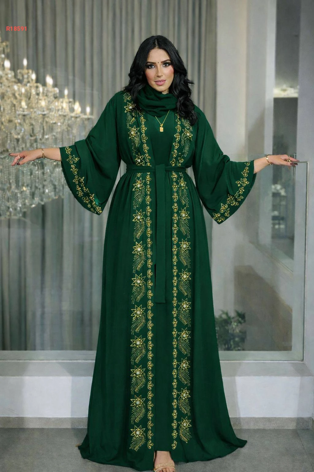 طقم عباية مرصعة بالستراس مع فستان وحزام