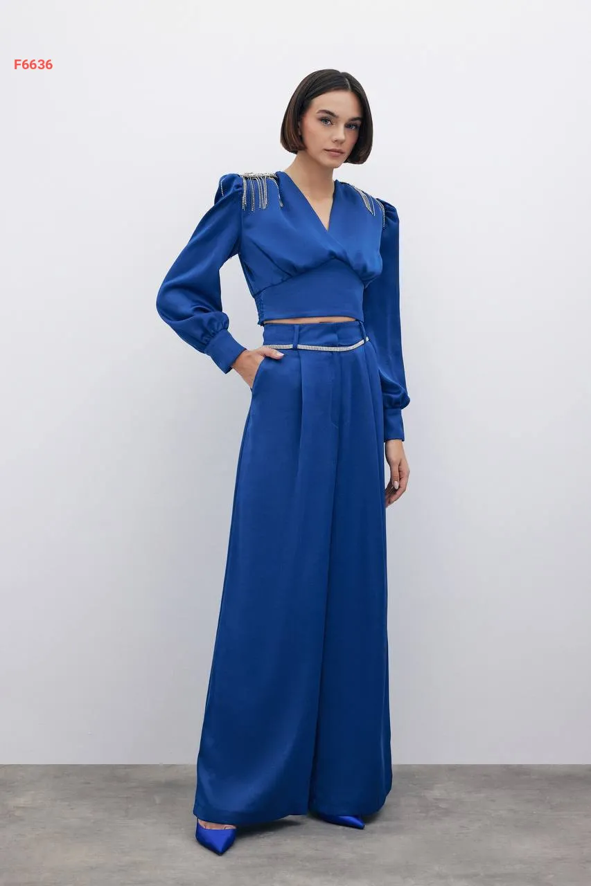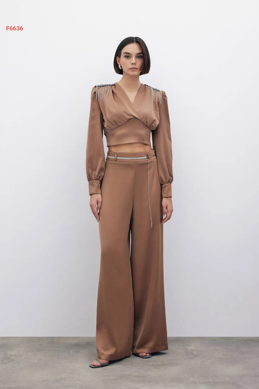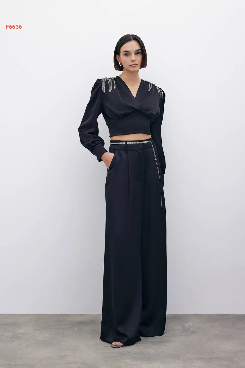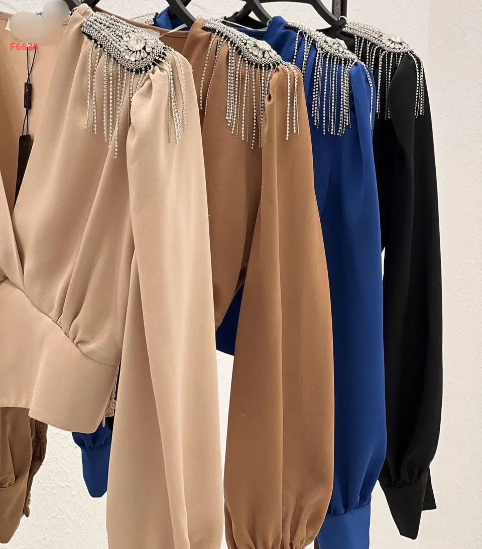 بلوزة مزينة أحجار وسلاسل عالكتف