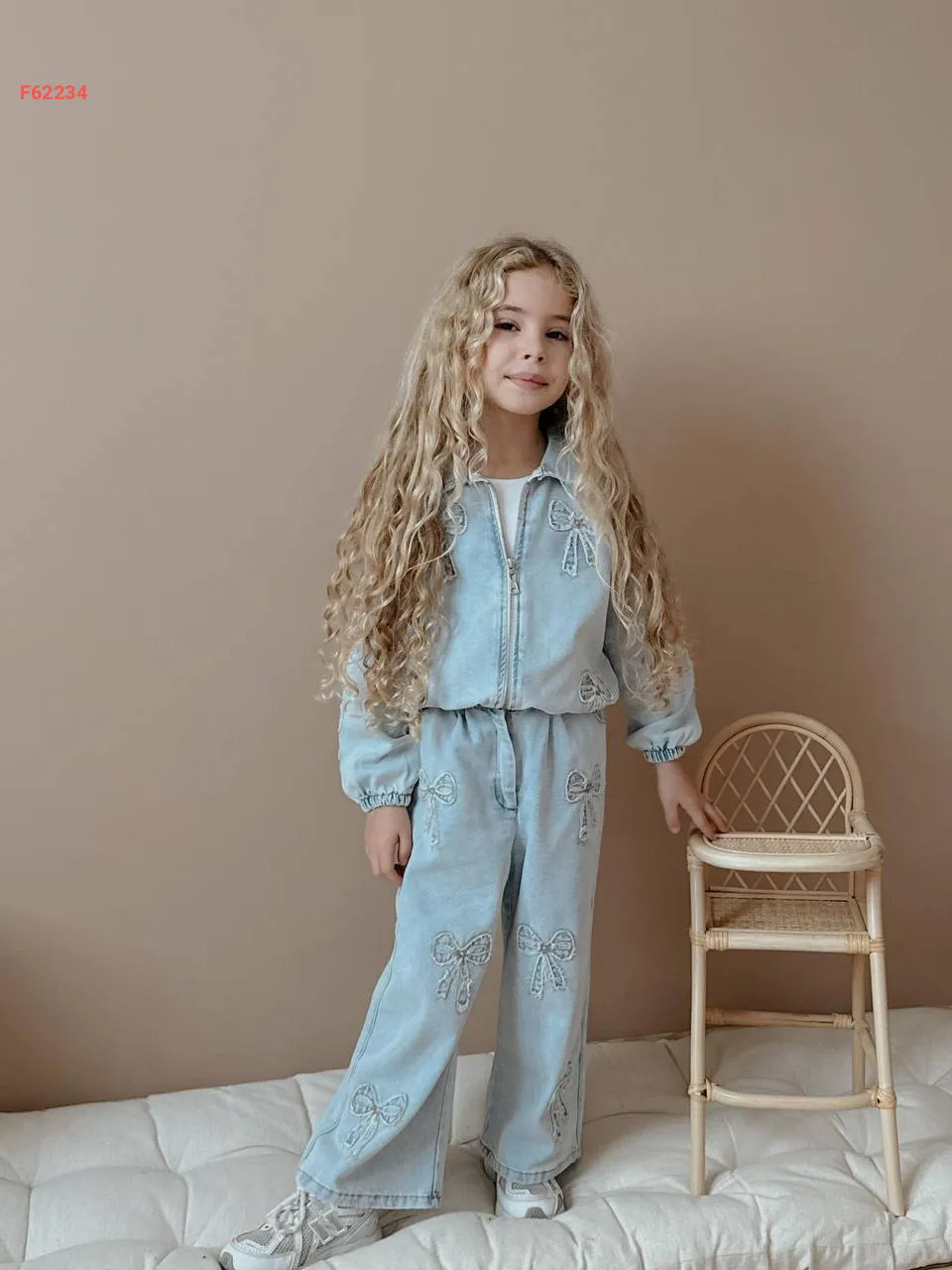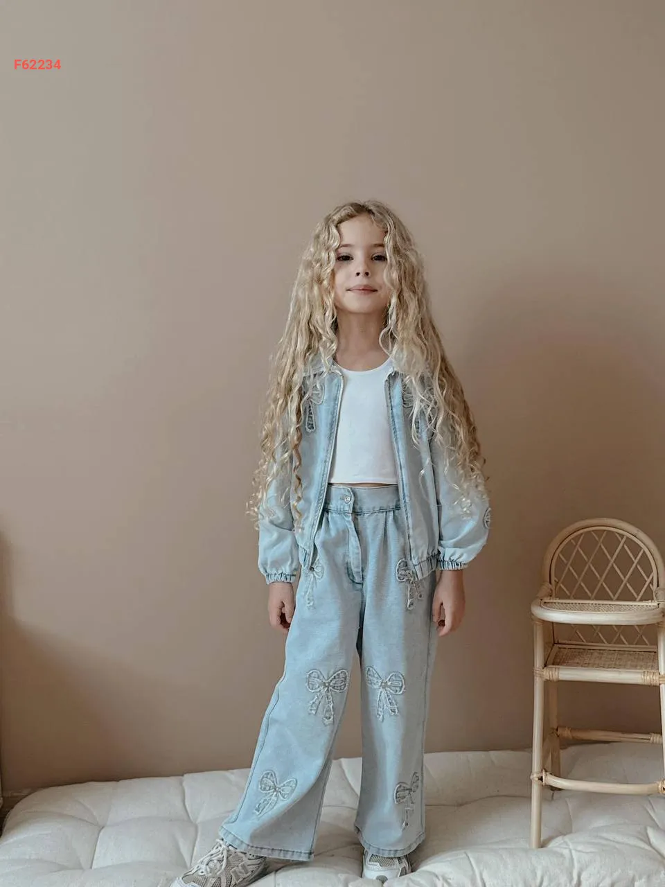 طقم بنطال جينز بناتي مطرز فيونكات