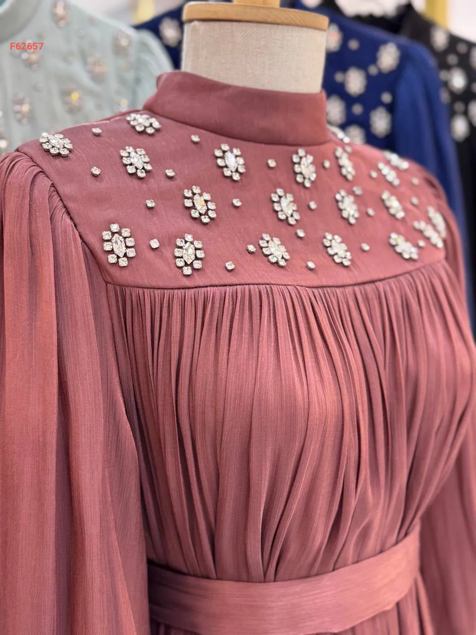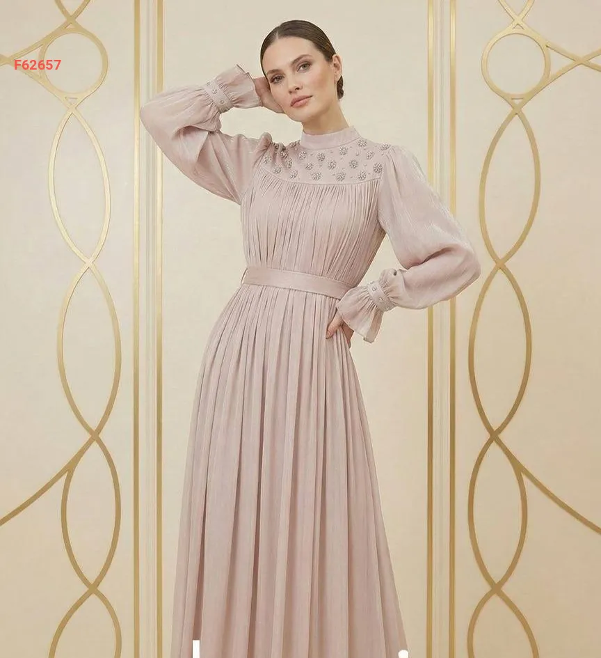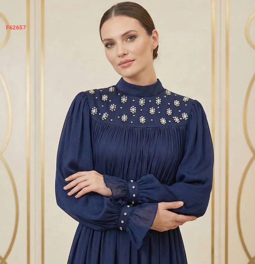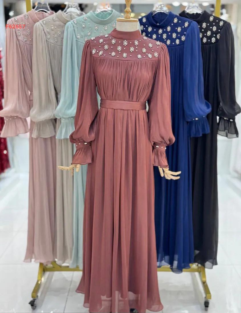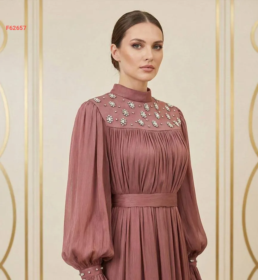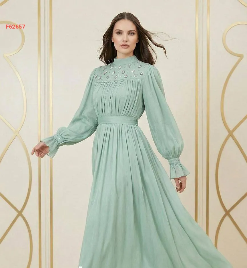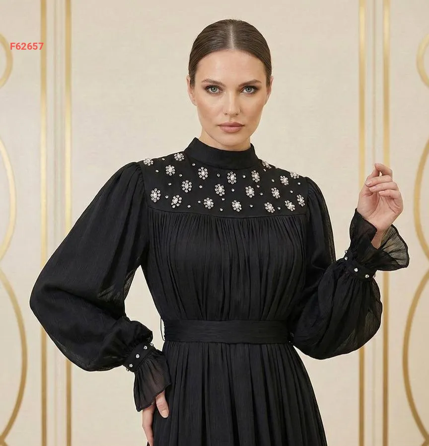 فستان طويل شيفون مطرز أحجار