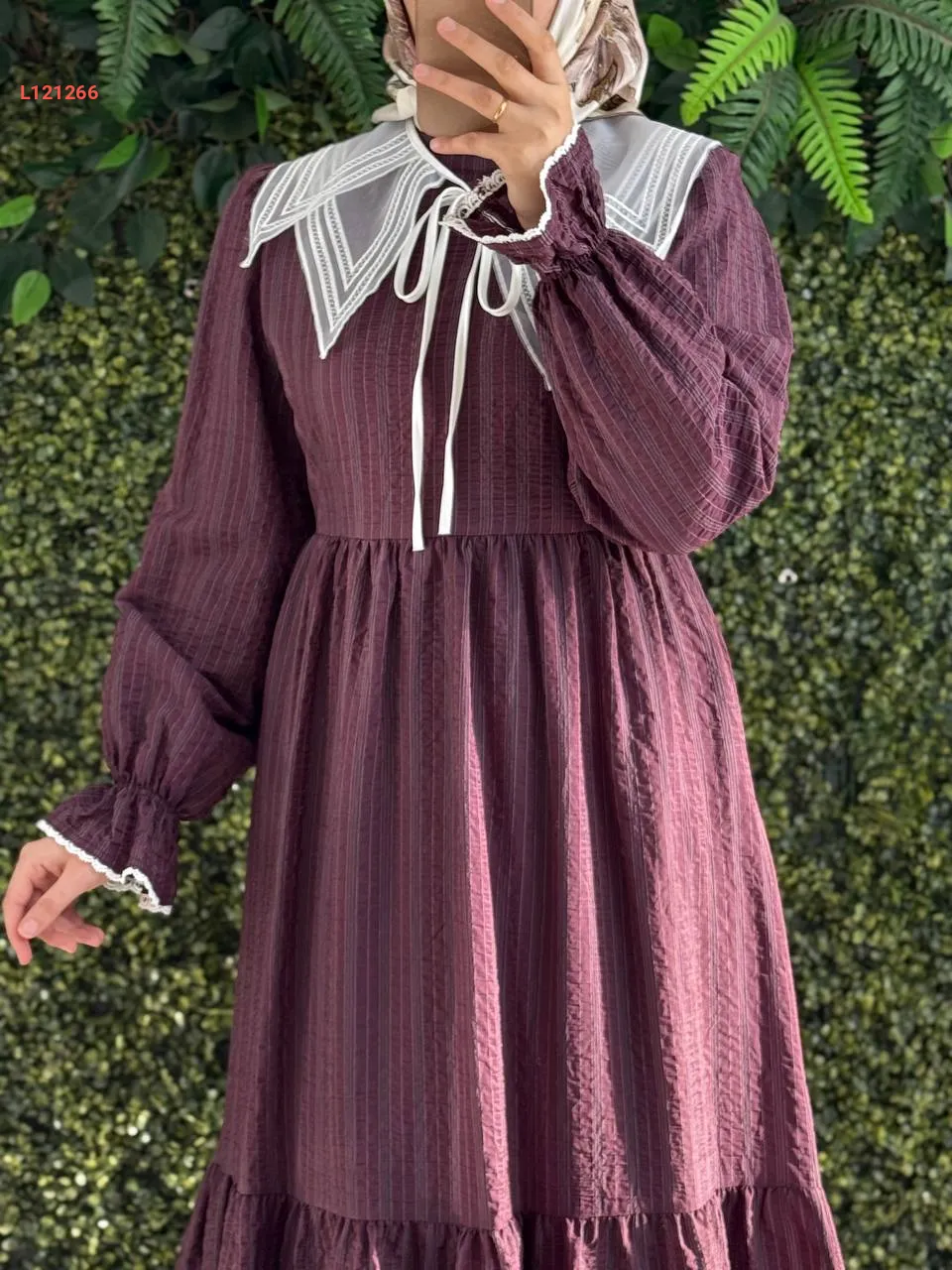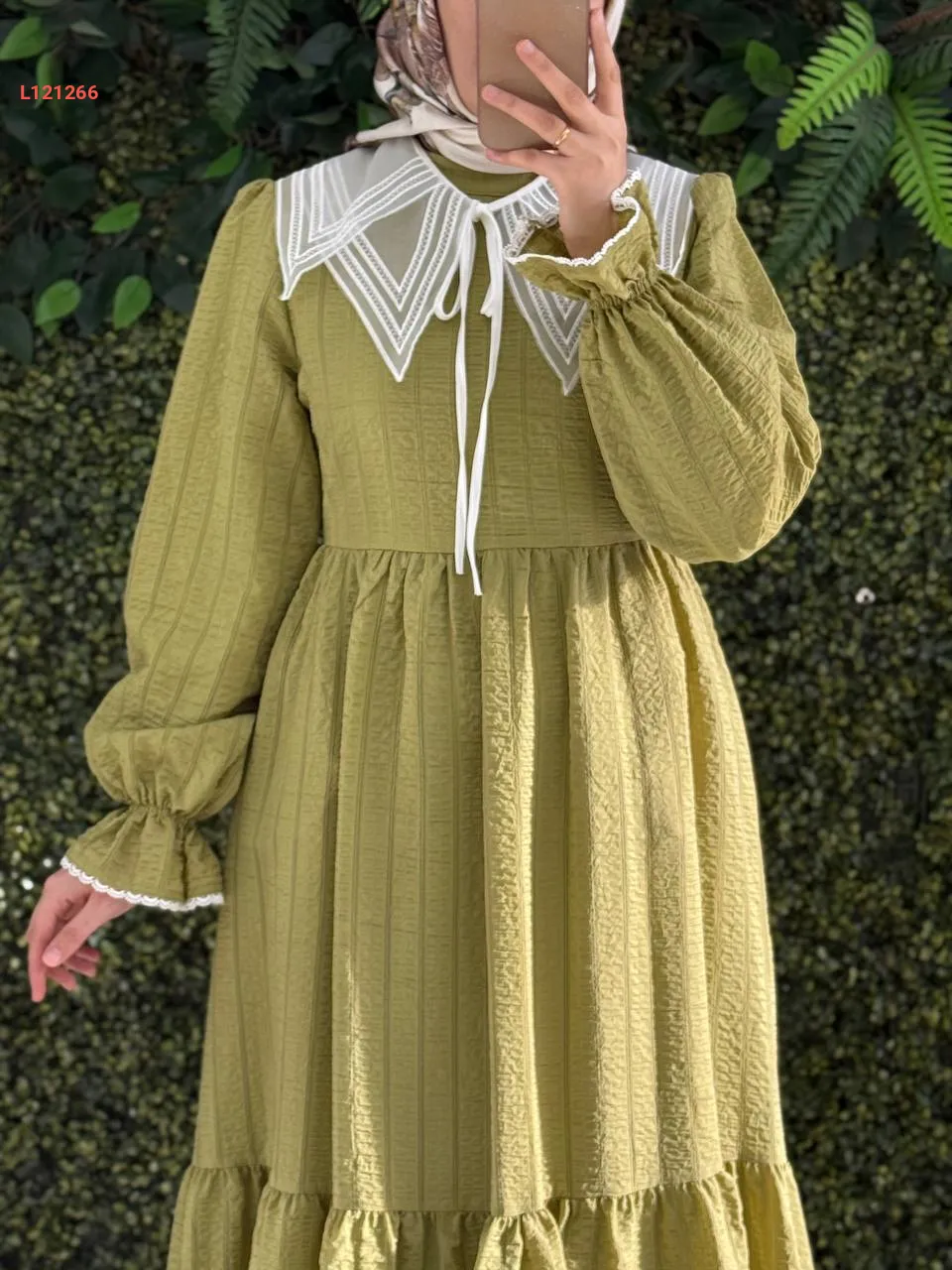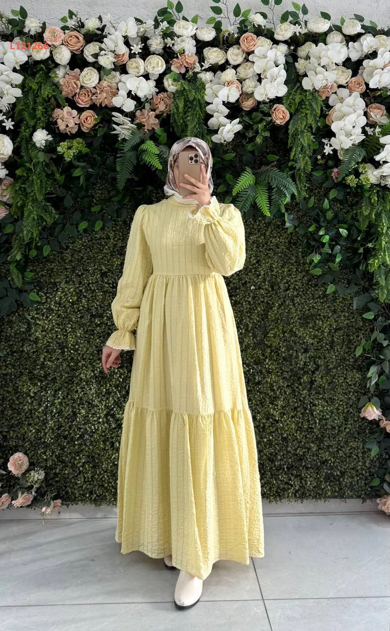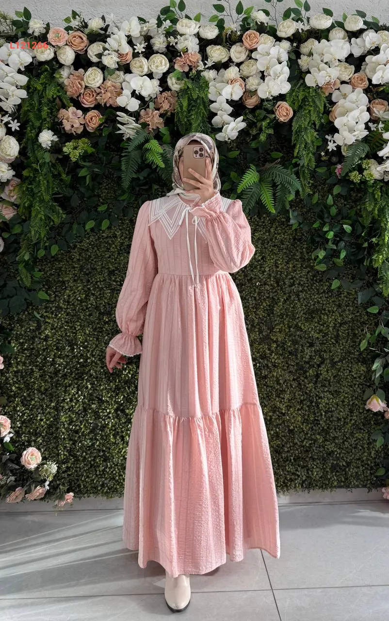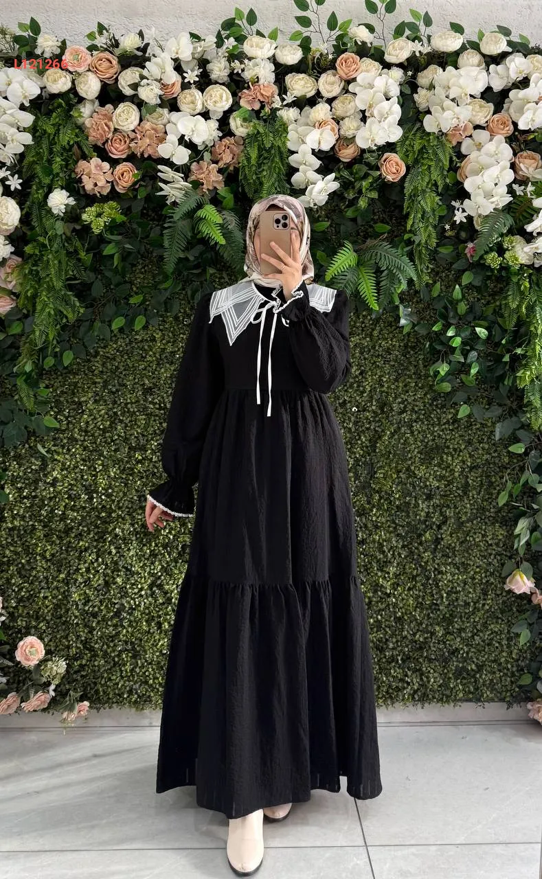فستان طويل قطن كتان بياقة مطرزة