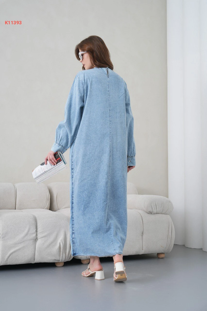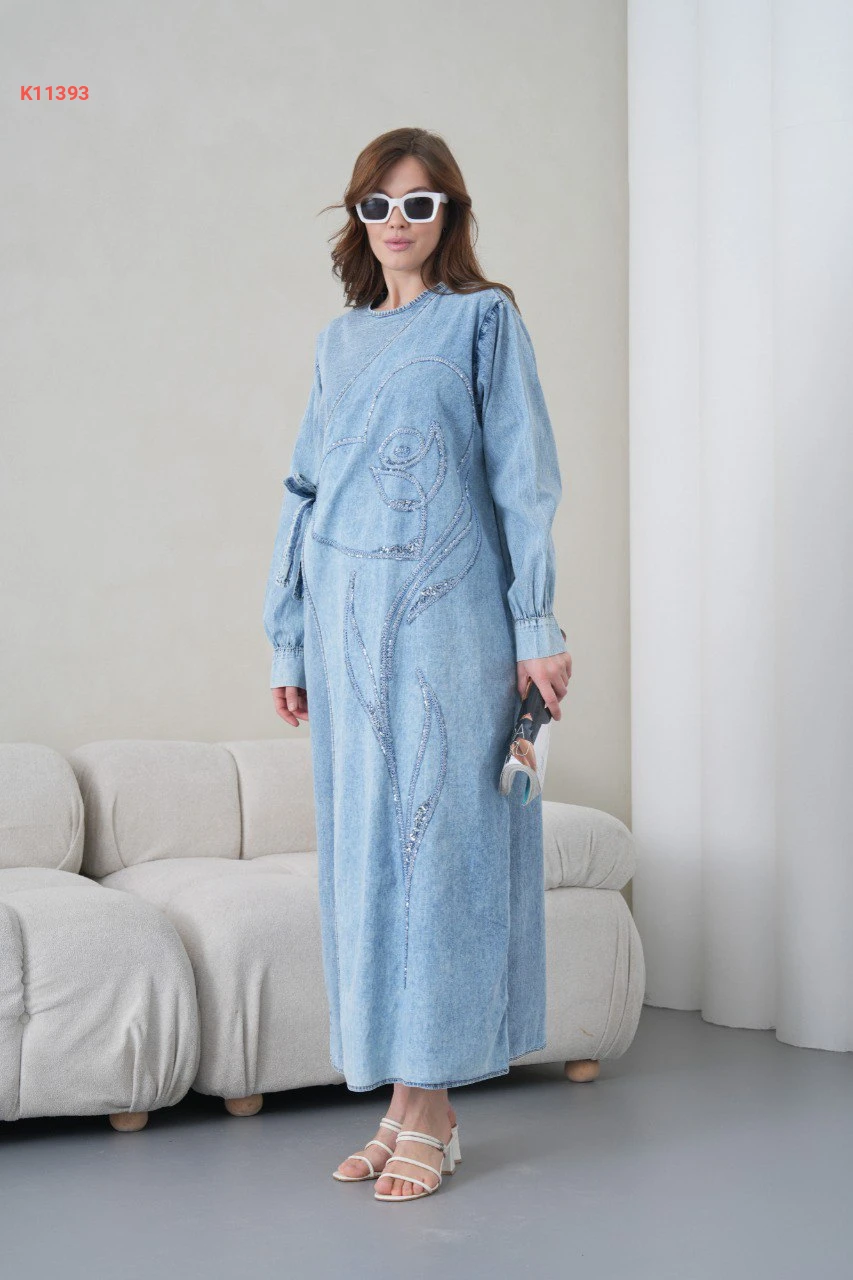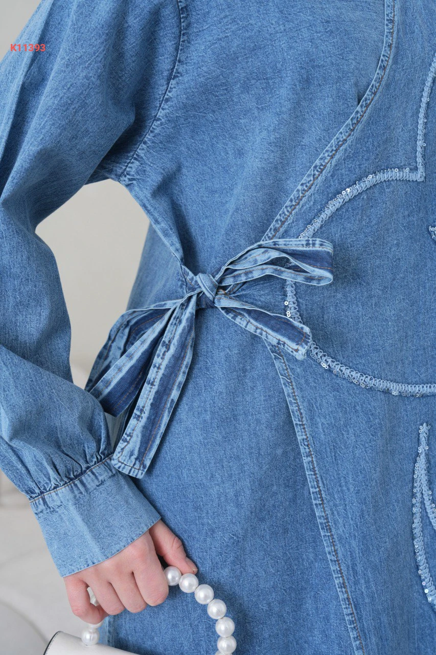 فستان جينز مطرز بربطة جانبية