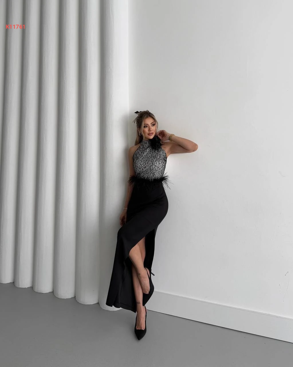 فستان مطرز بالترتر مع ريش وفتحة جانبية