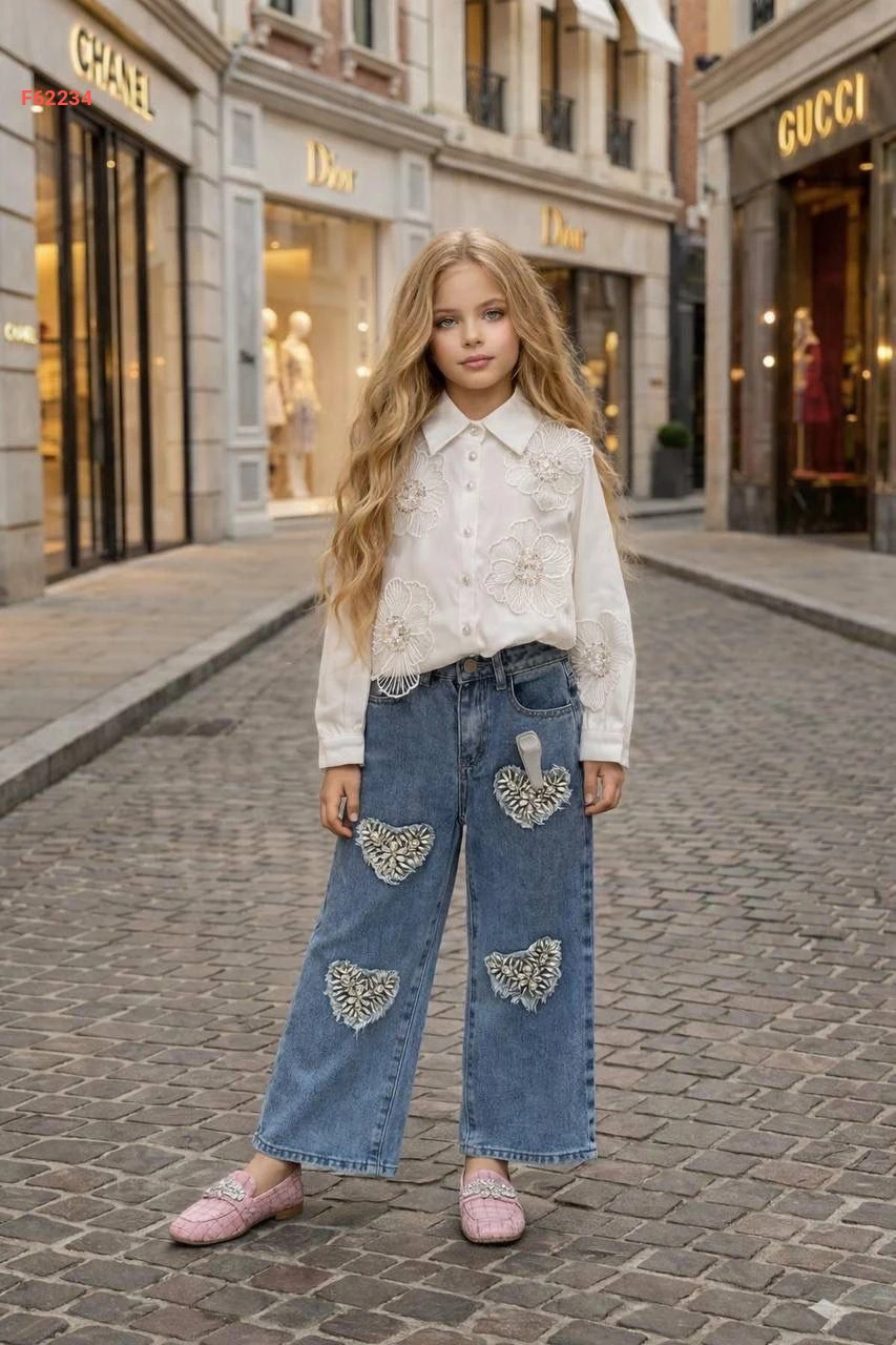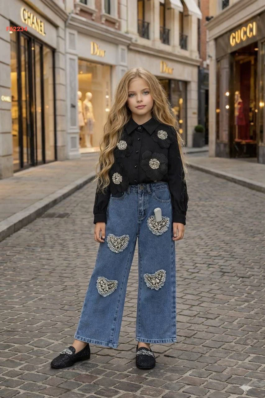 طقم جينز بناتي مطرز مع قميص مزين ورد