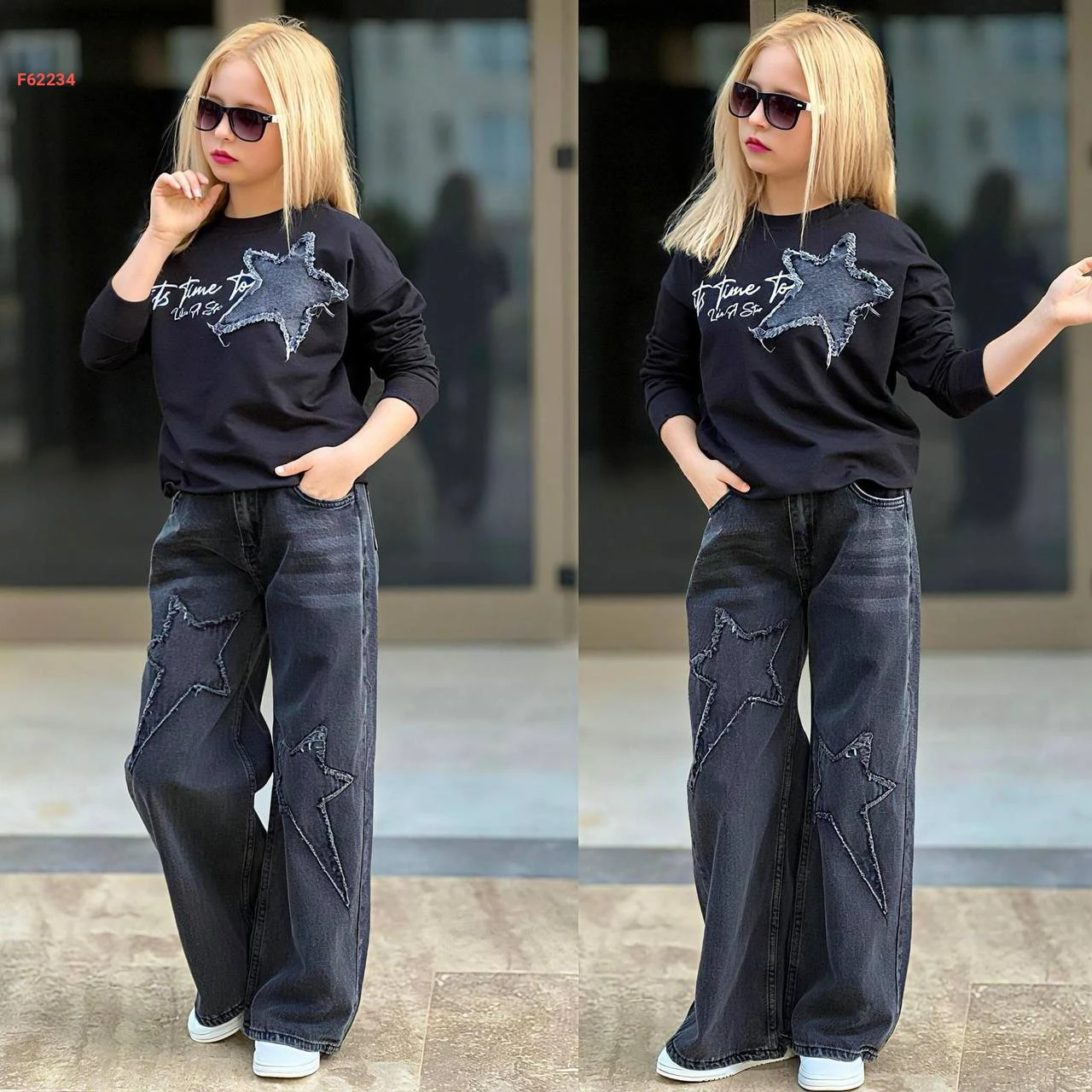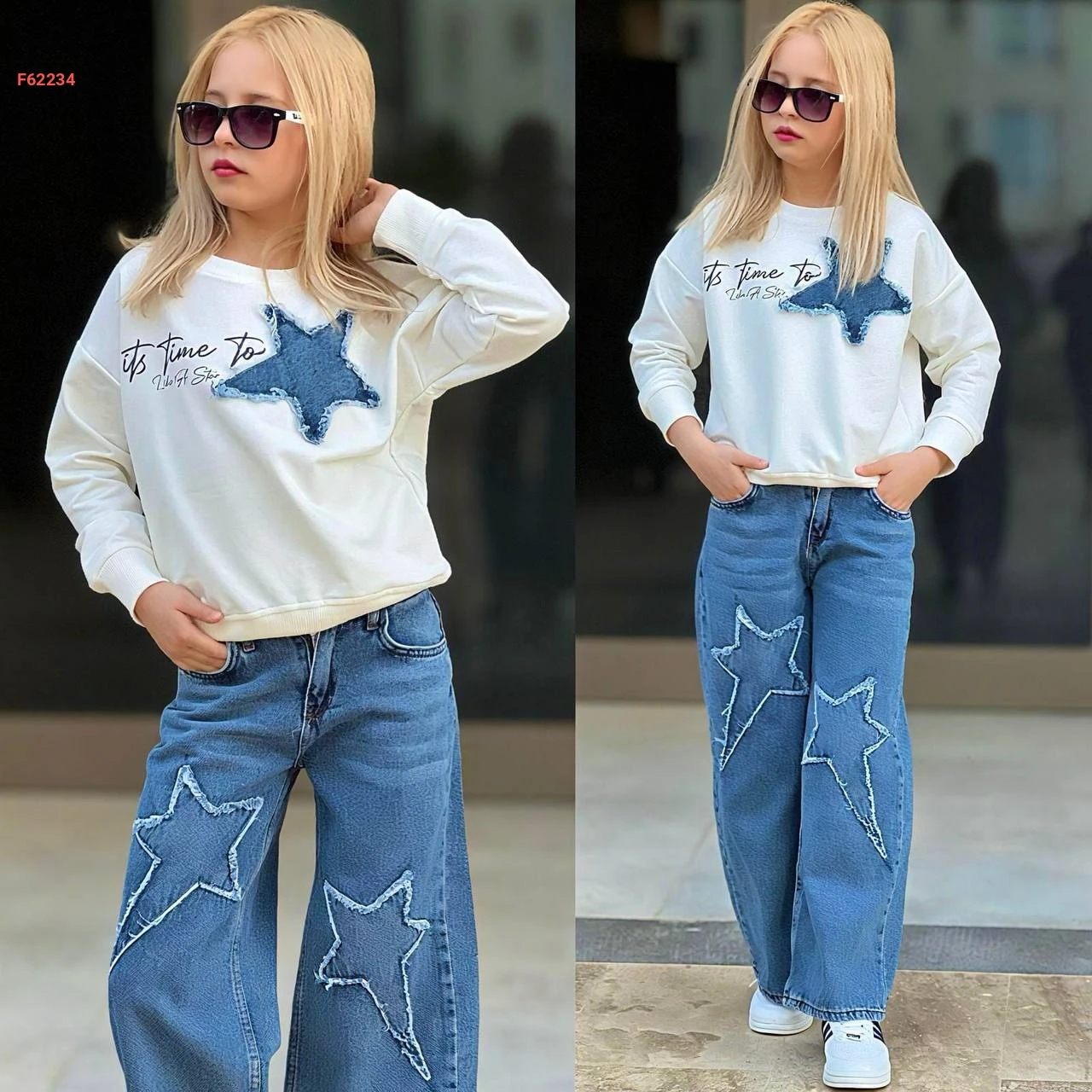 طقم جينز بناتي مطرز وكنزة كم
