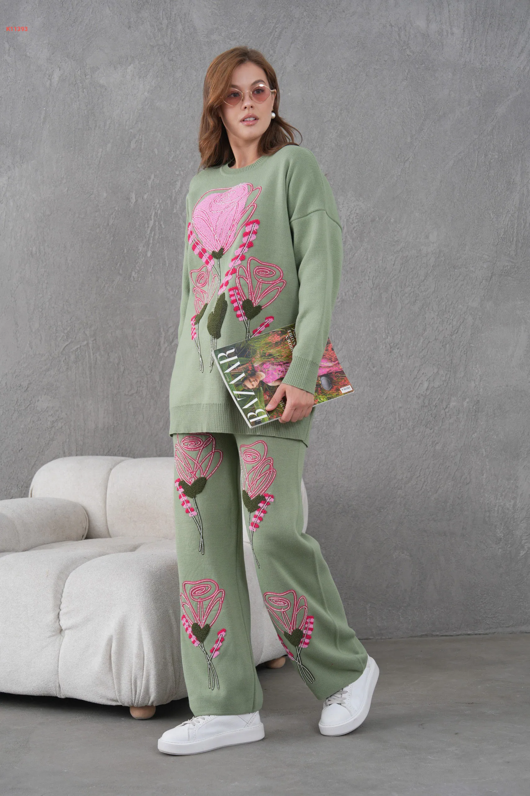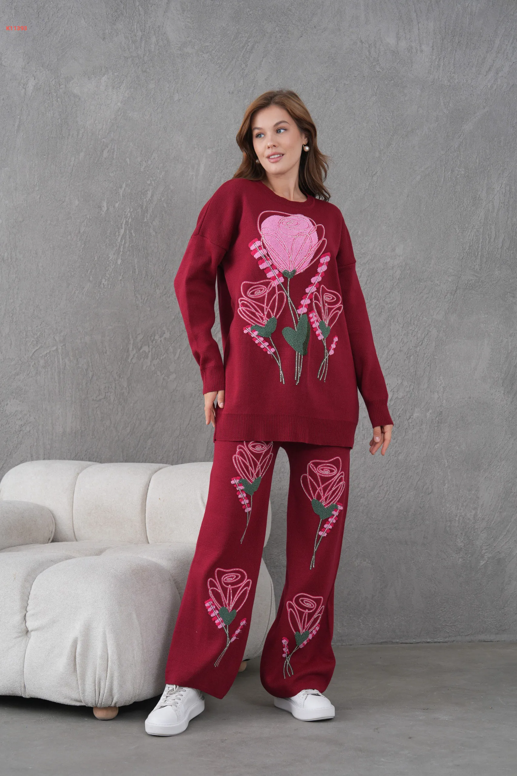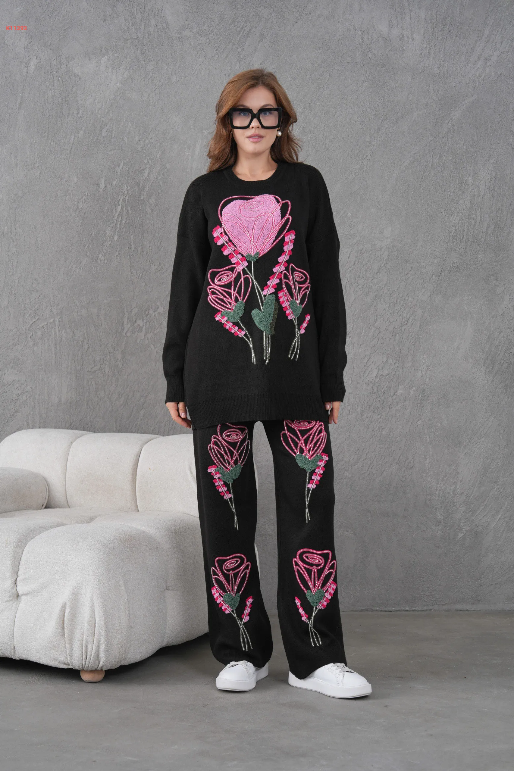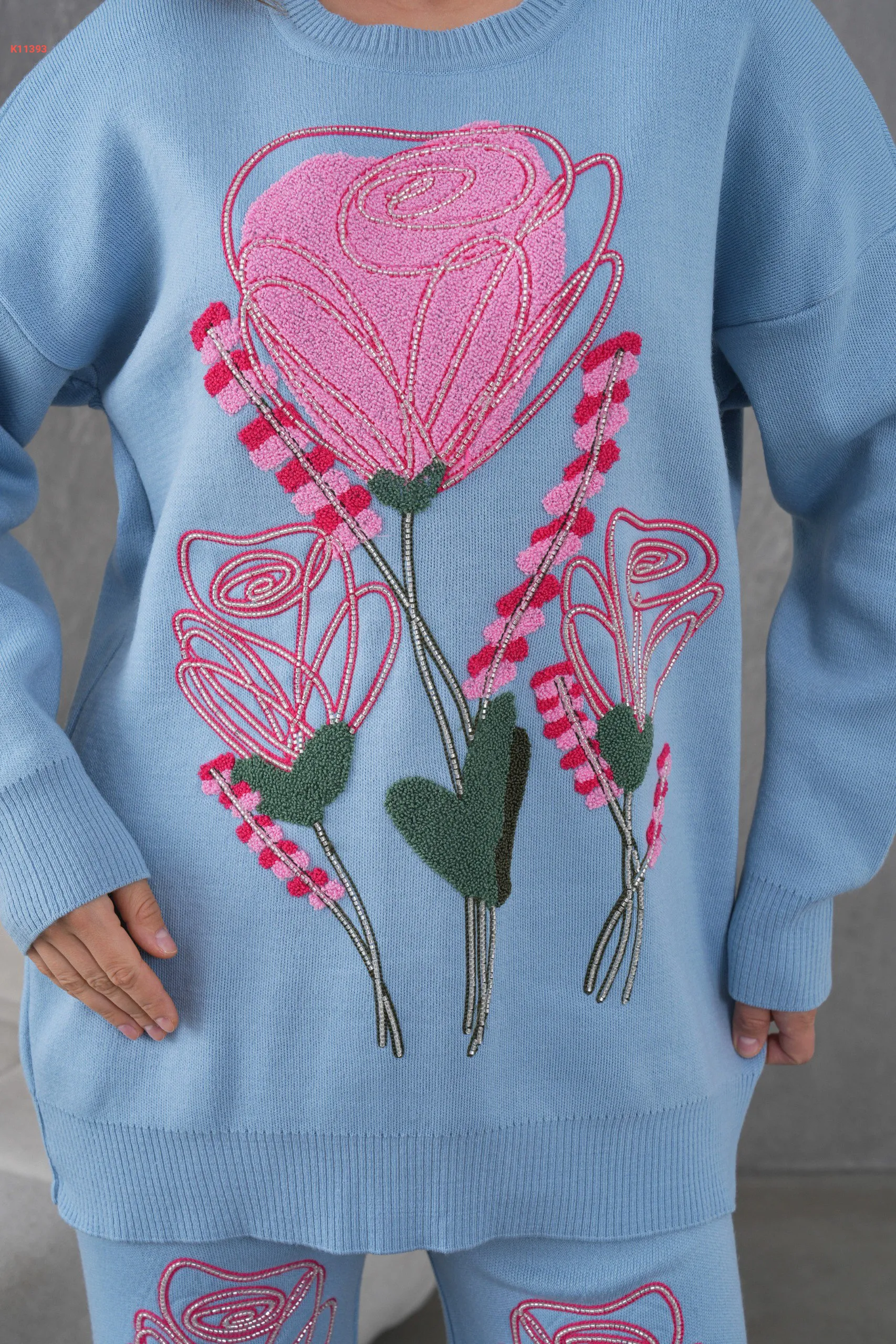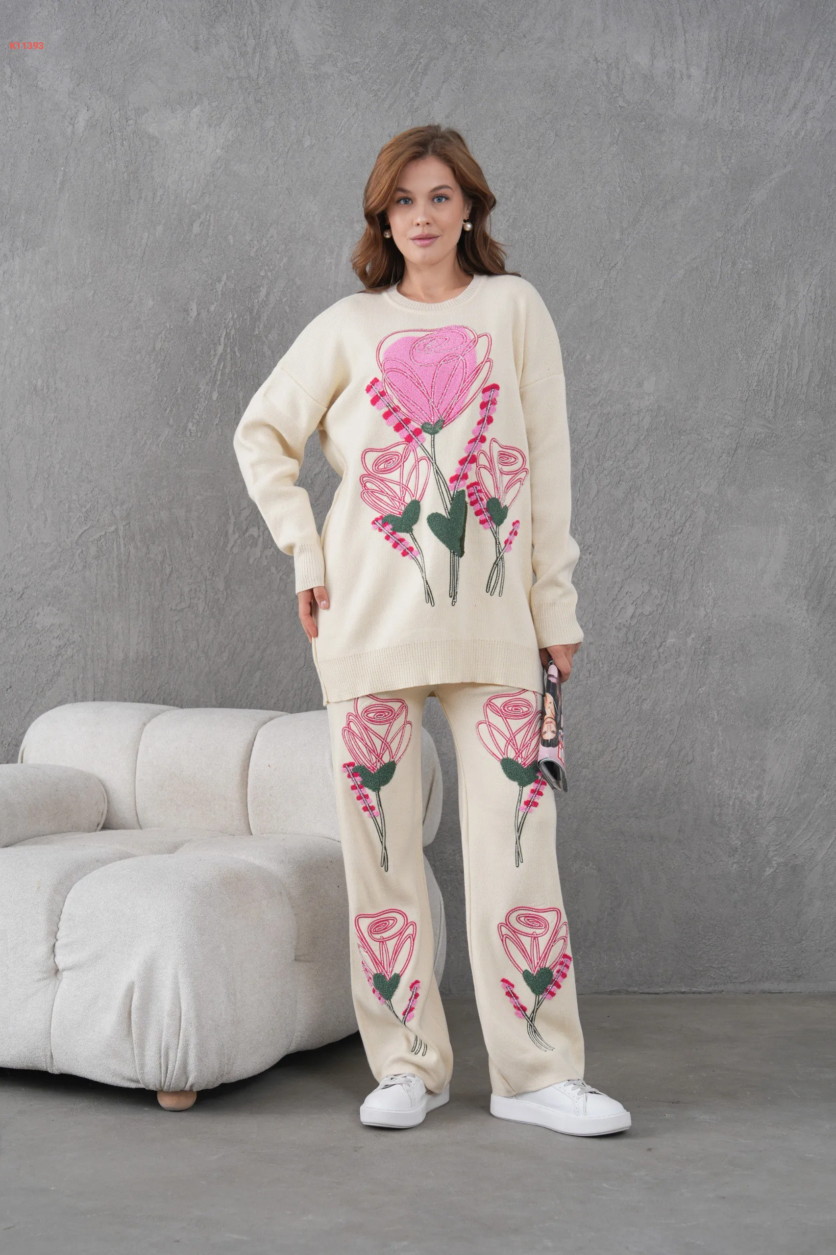 طقم بنطال تريكو مطرز مع تونيك