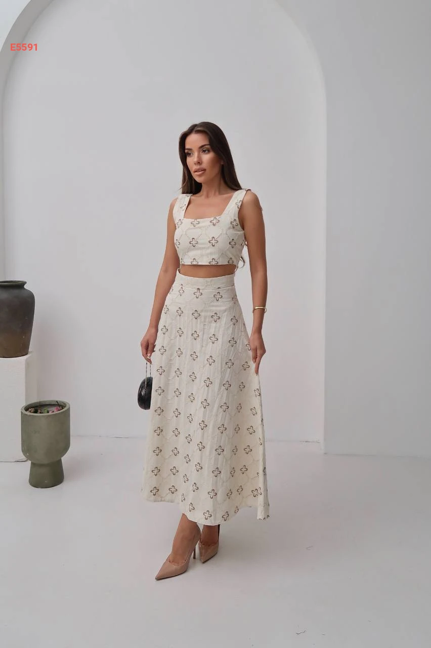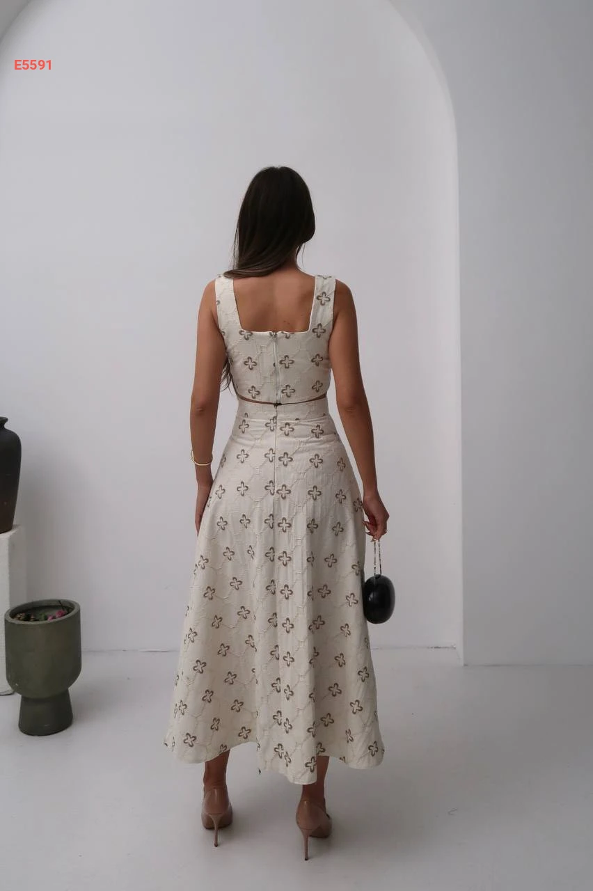 طقم تنورة كتان مطرز