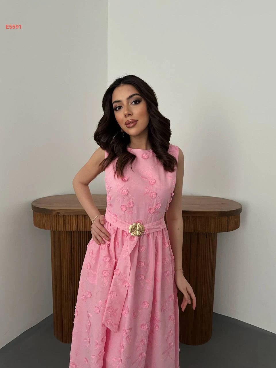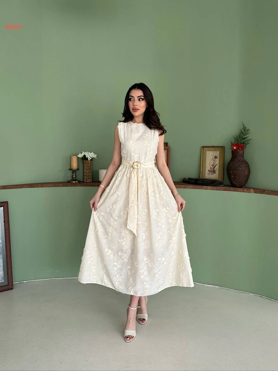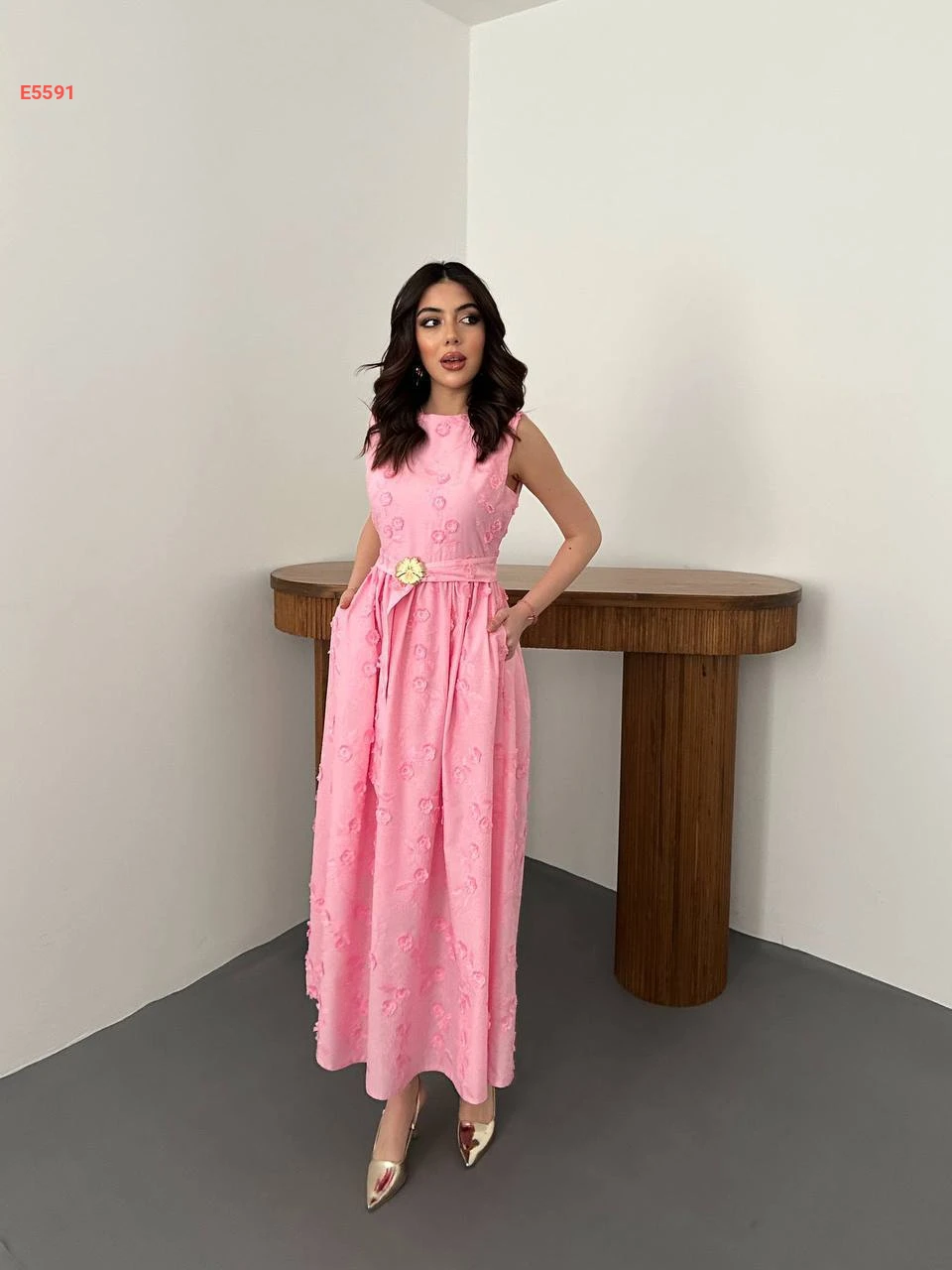 فستان طويل حفر مطرز مع زنار وبروش