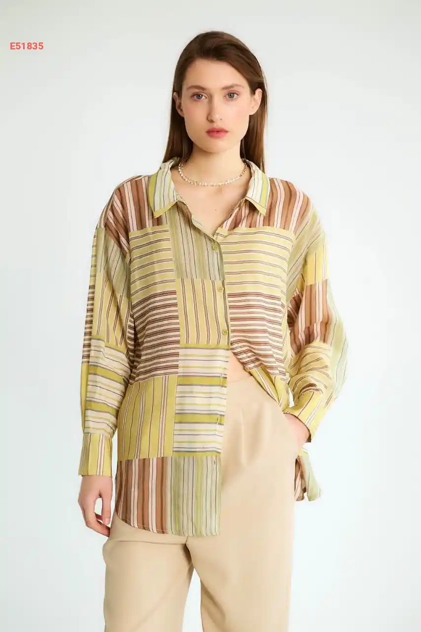 قميص كم طويل بتفاصيل مخططة
