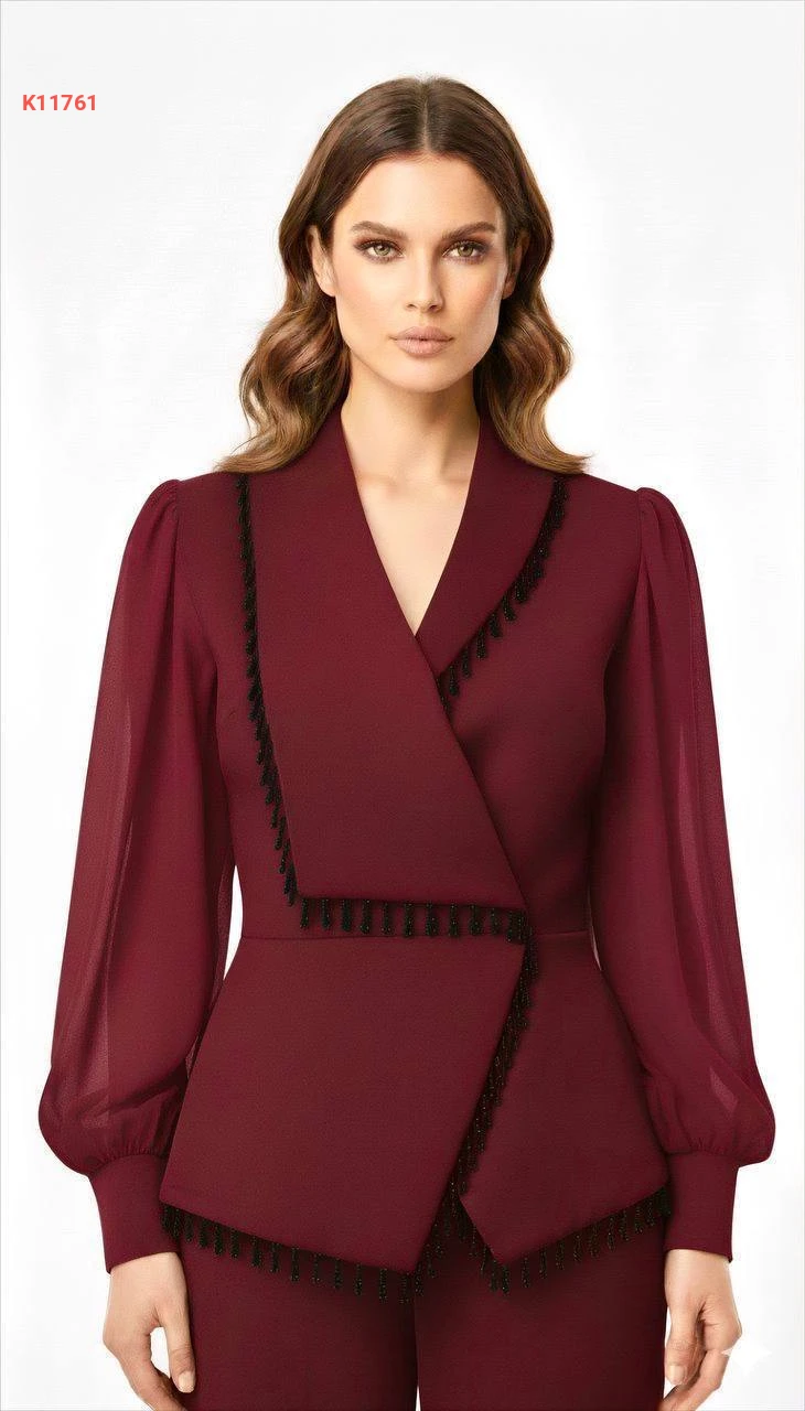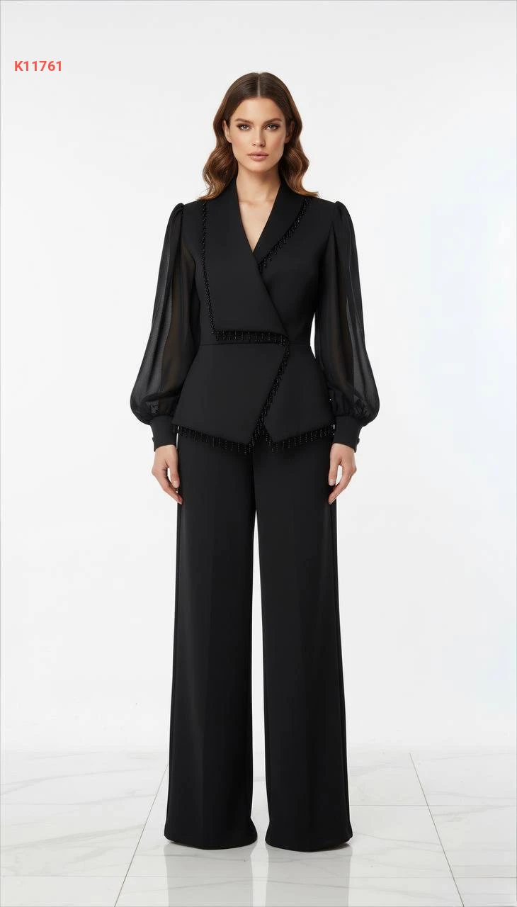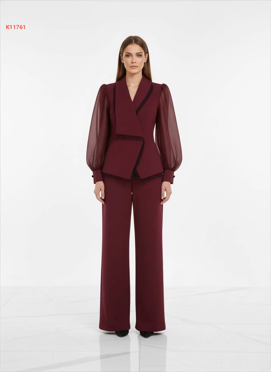 طقم بنطال وجاكيت مطرز بأكمام شيفون