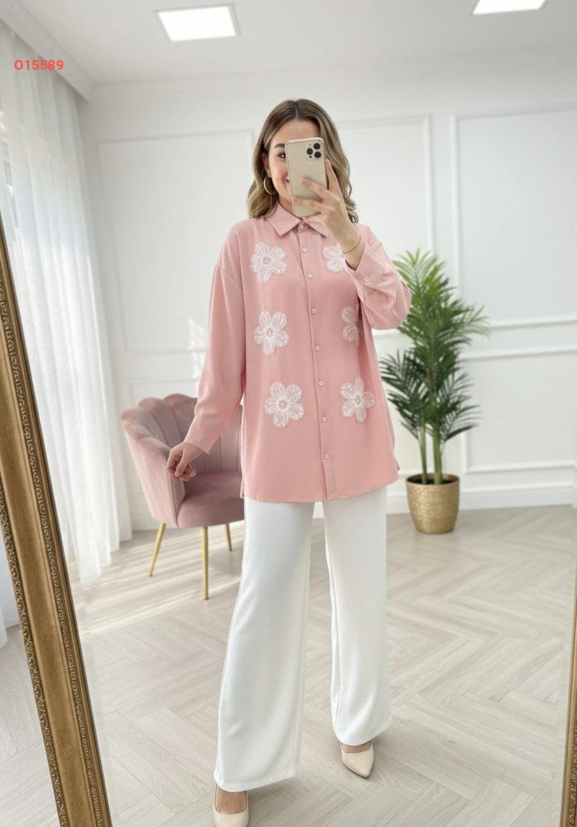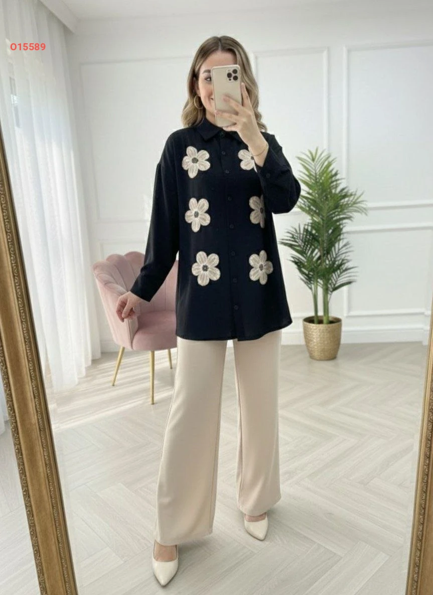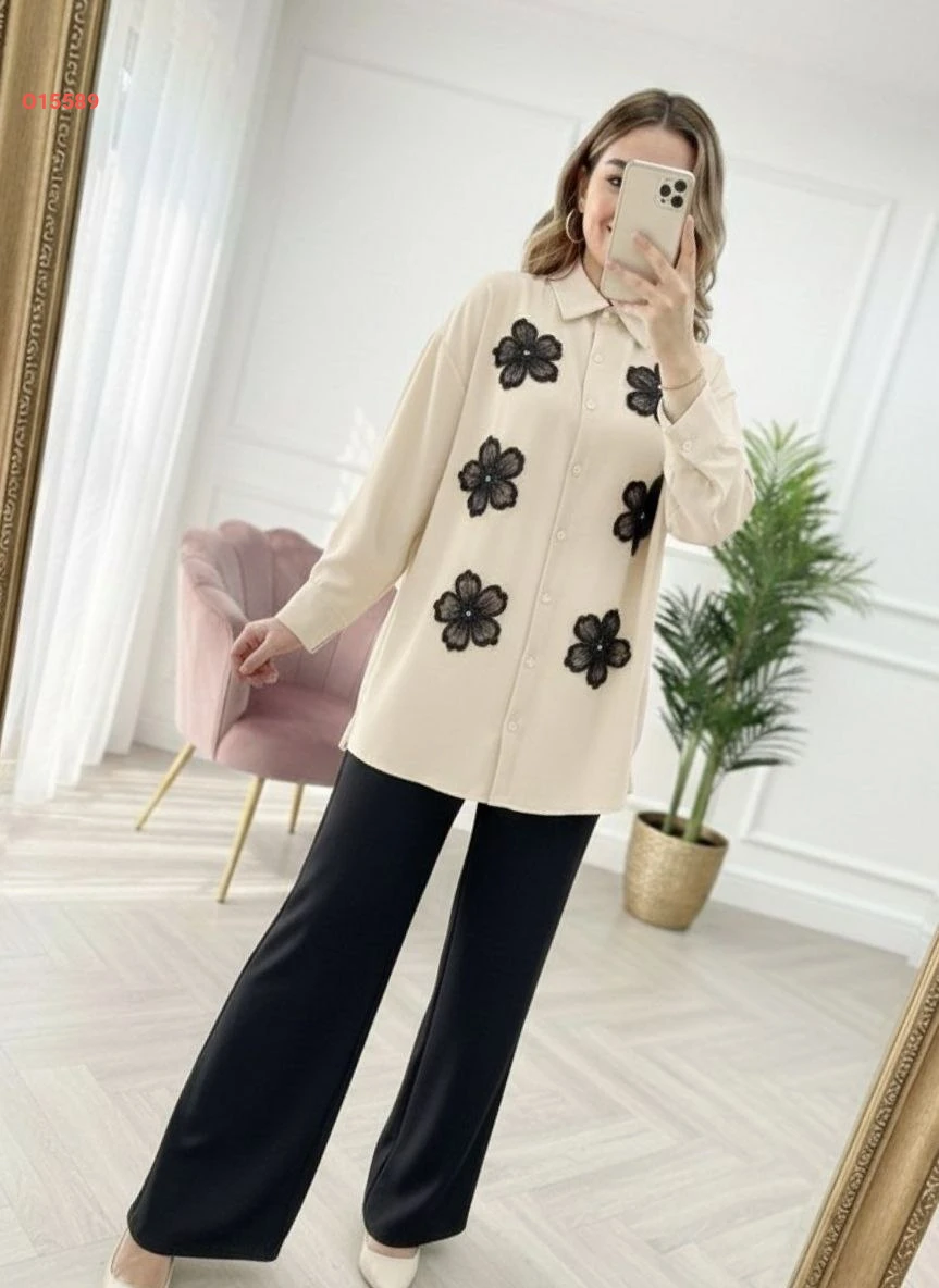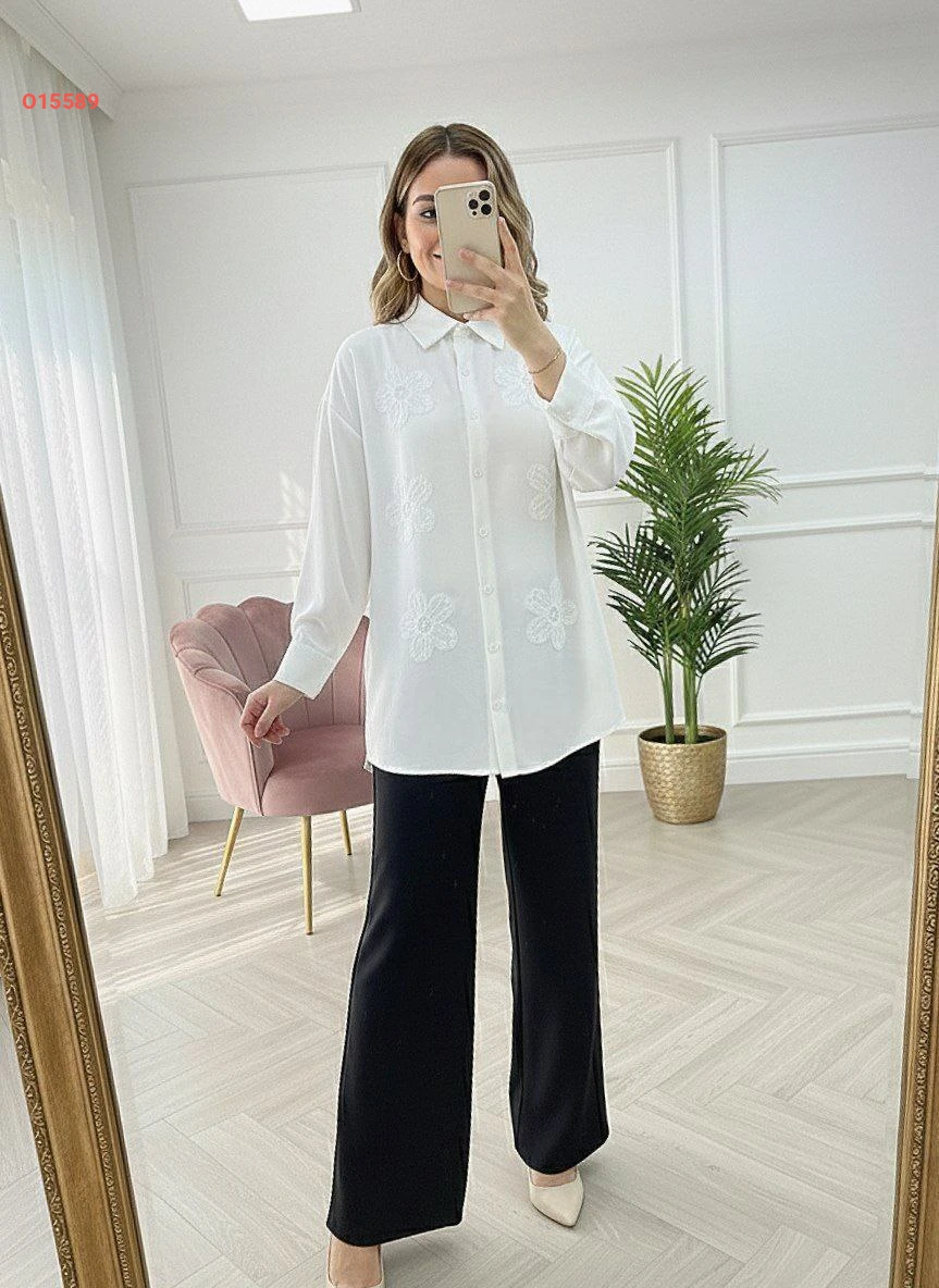 طقم بنطال وقميص مطرز ورد