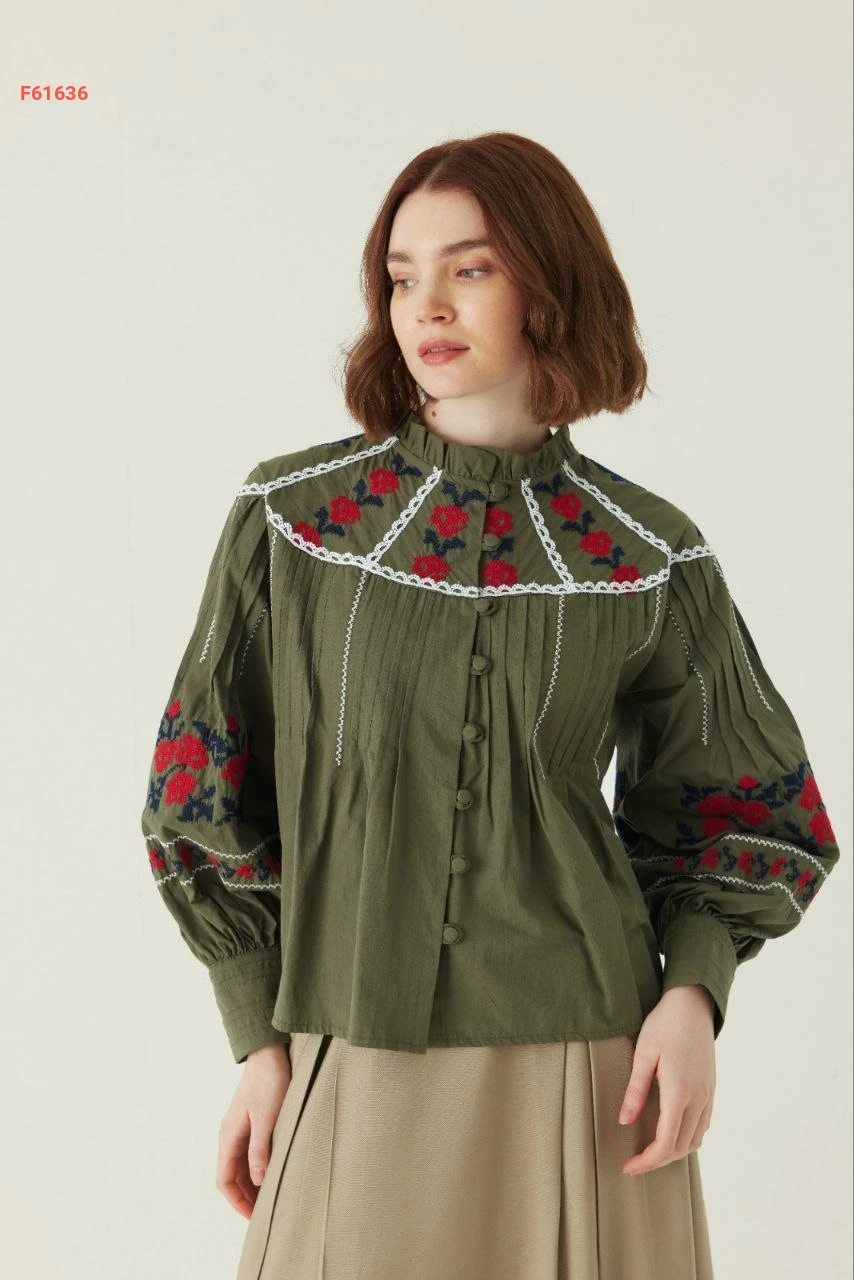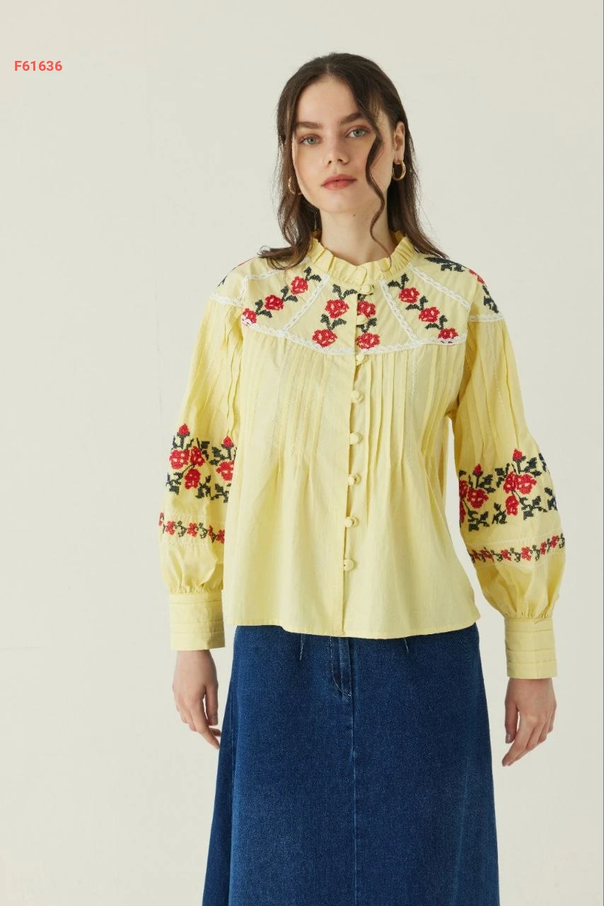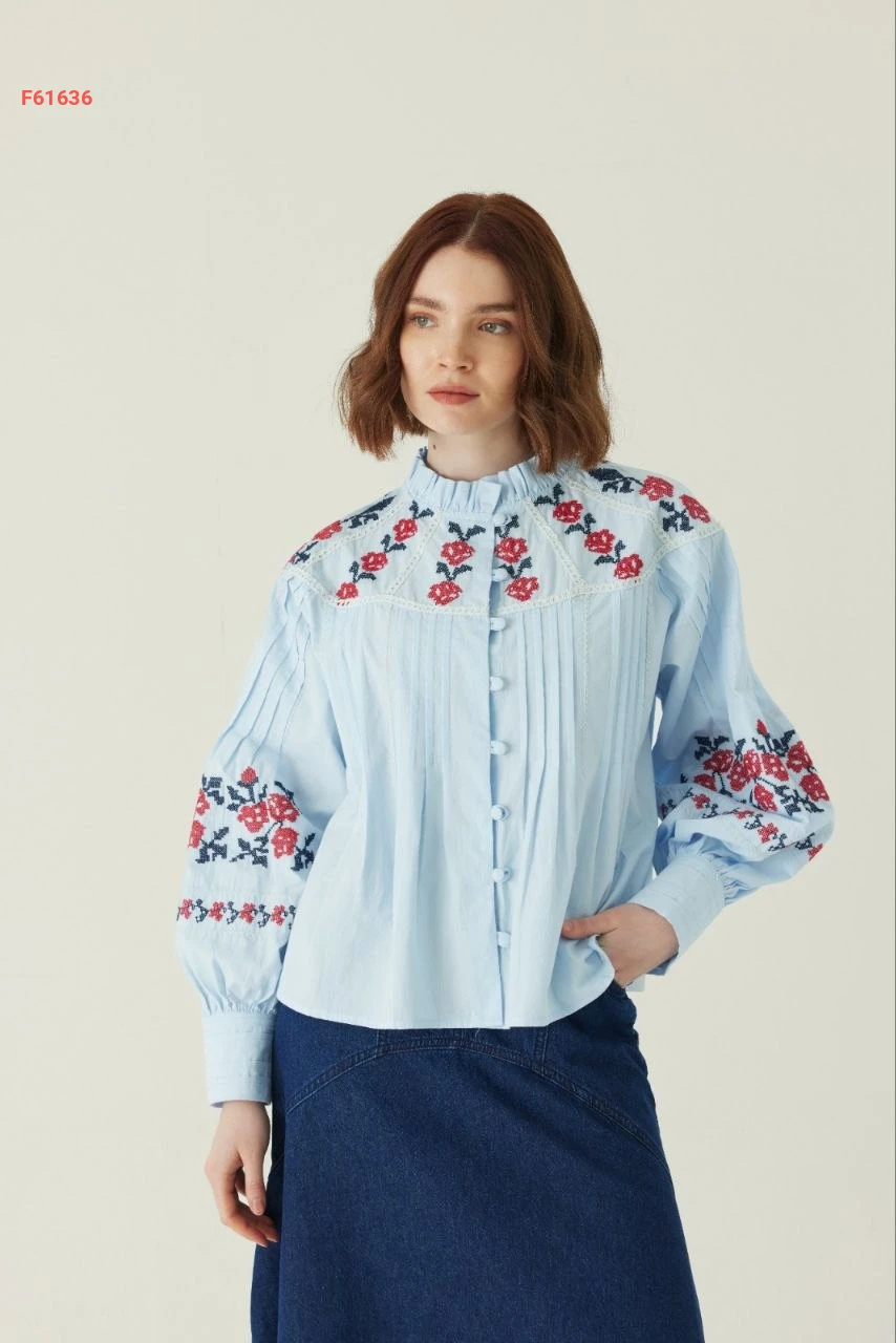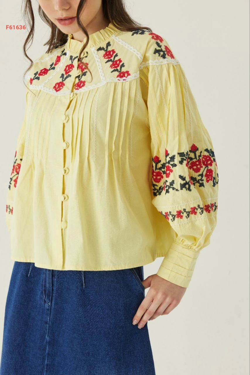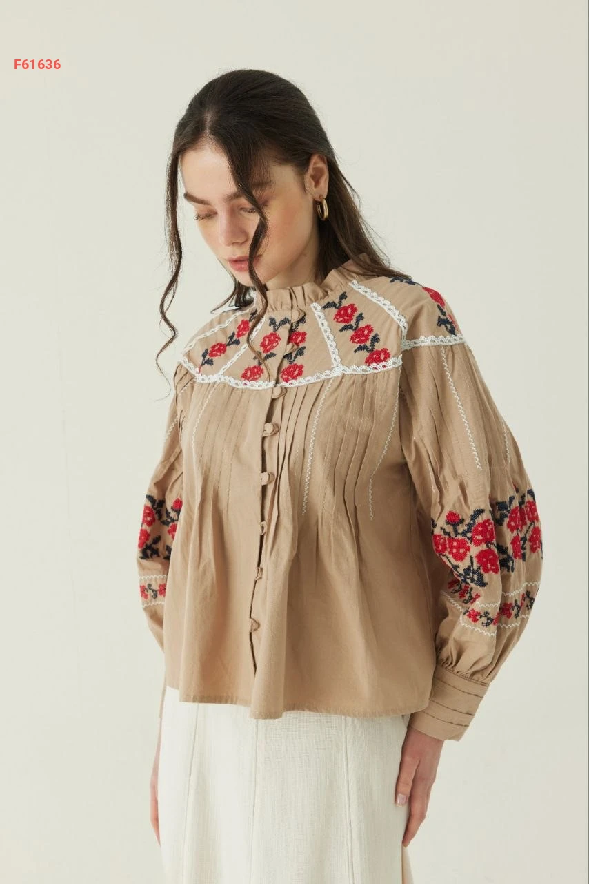 قميص مطرز ورد بأزرار، ياقة دائرية ، بأكمام منفوخة