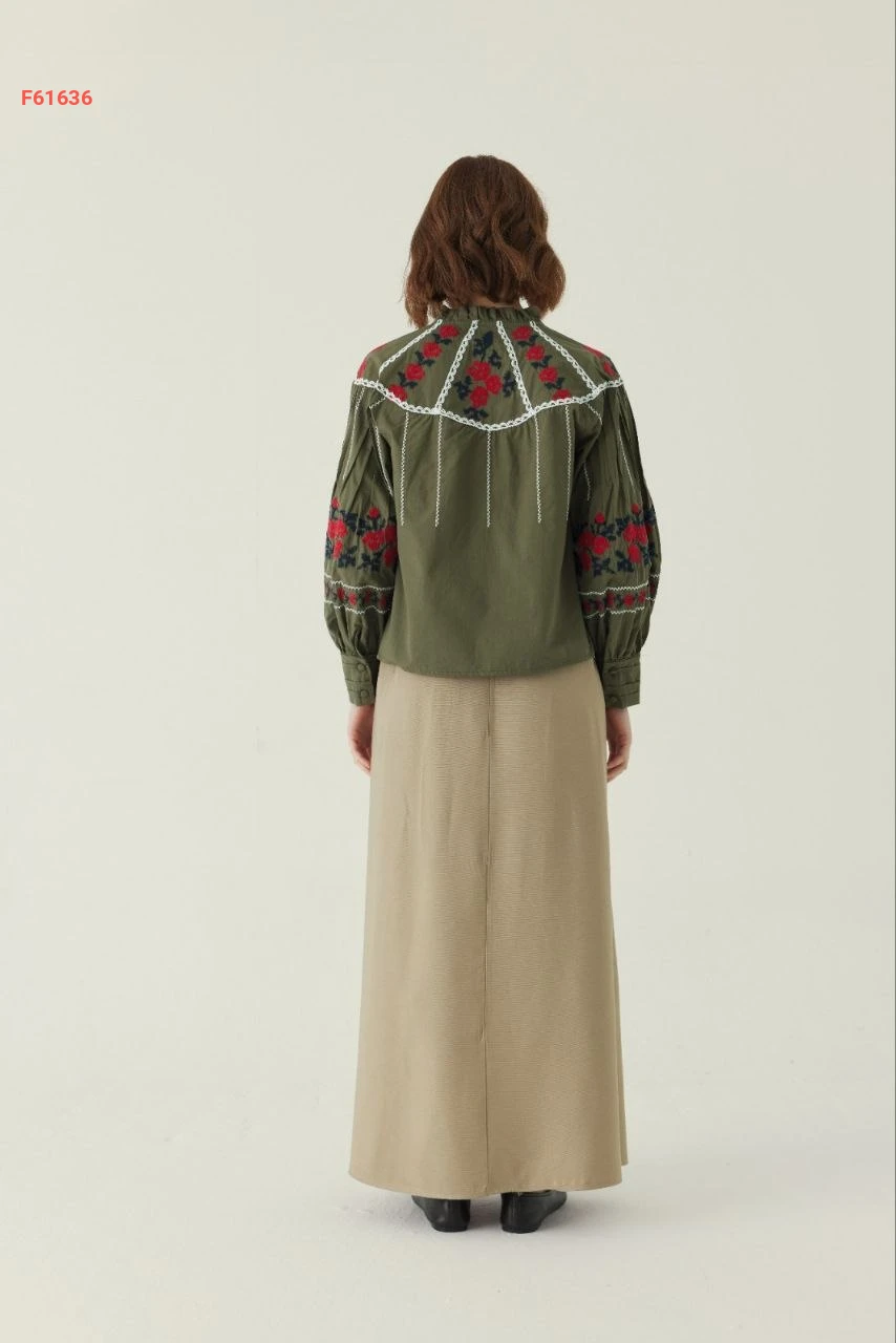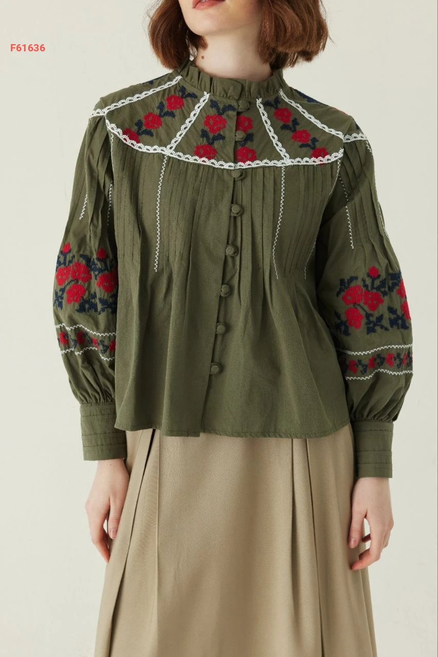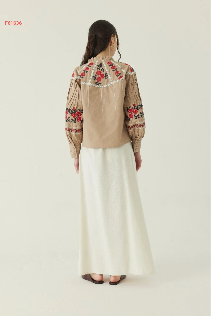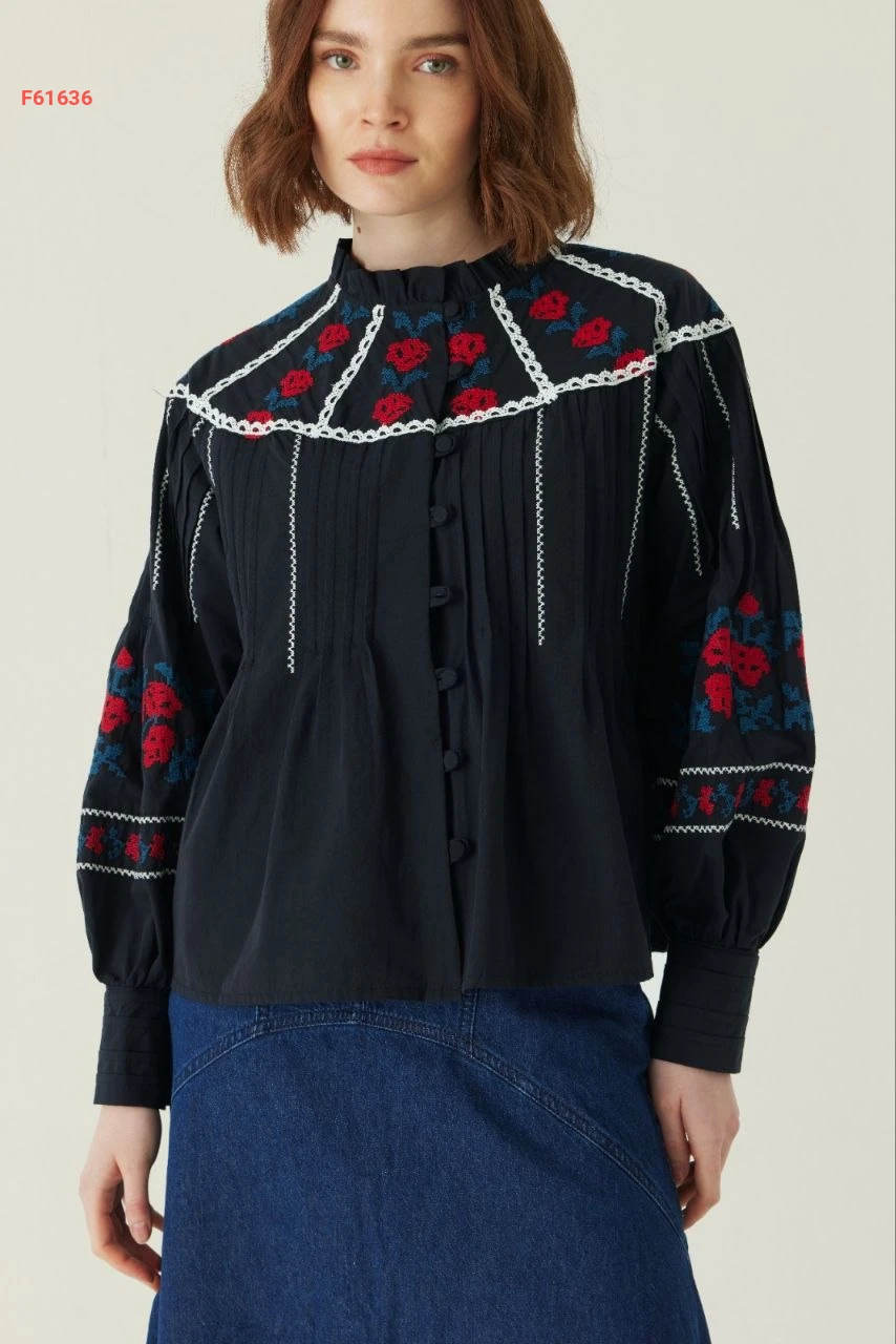 قميص مطرز ورد بأزرار، ياقة دائرية ، بأكمام منفوخة