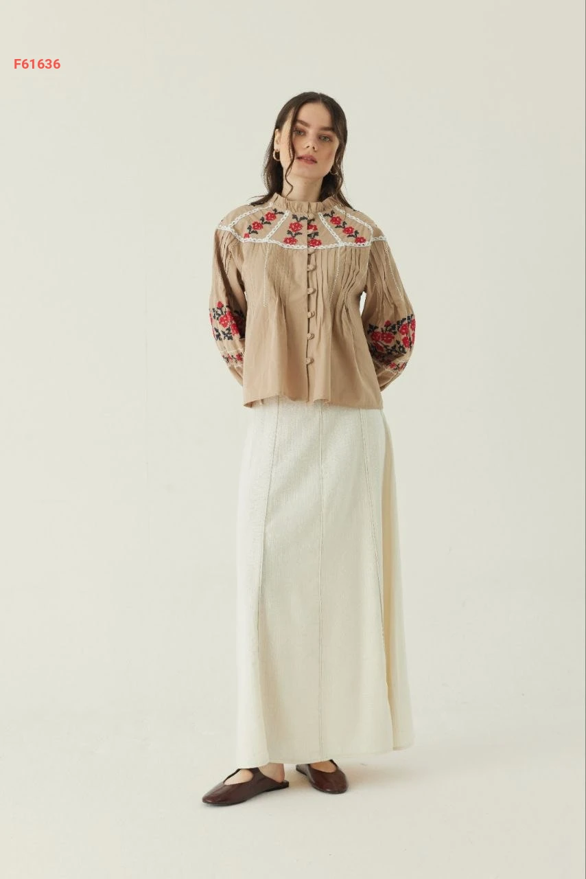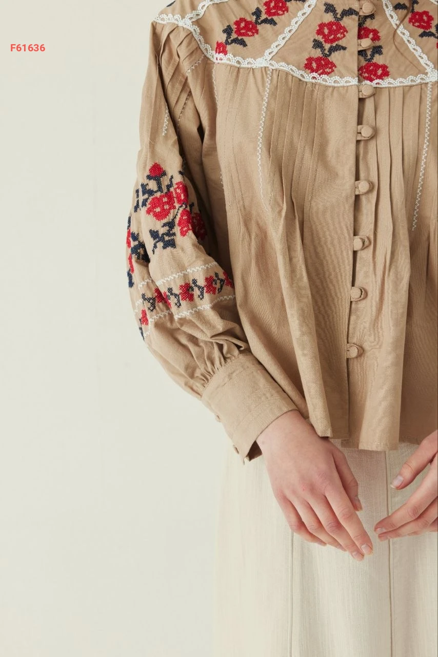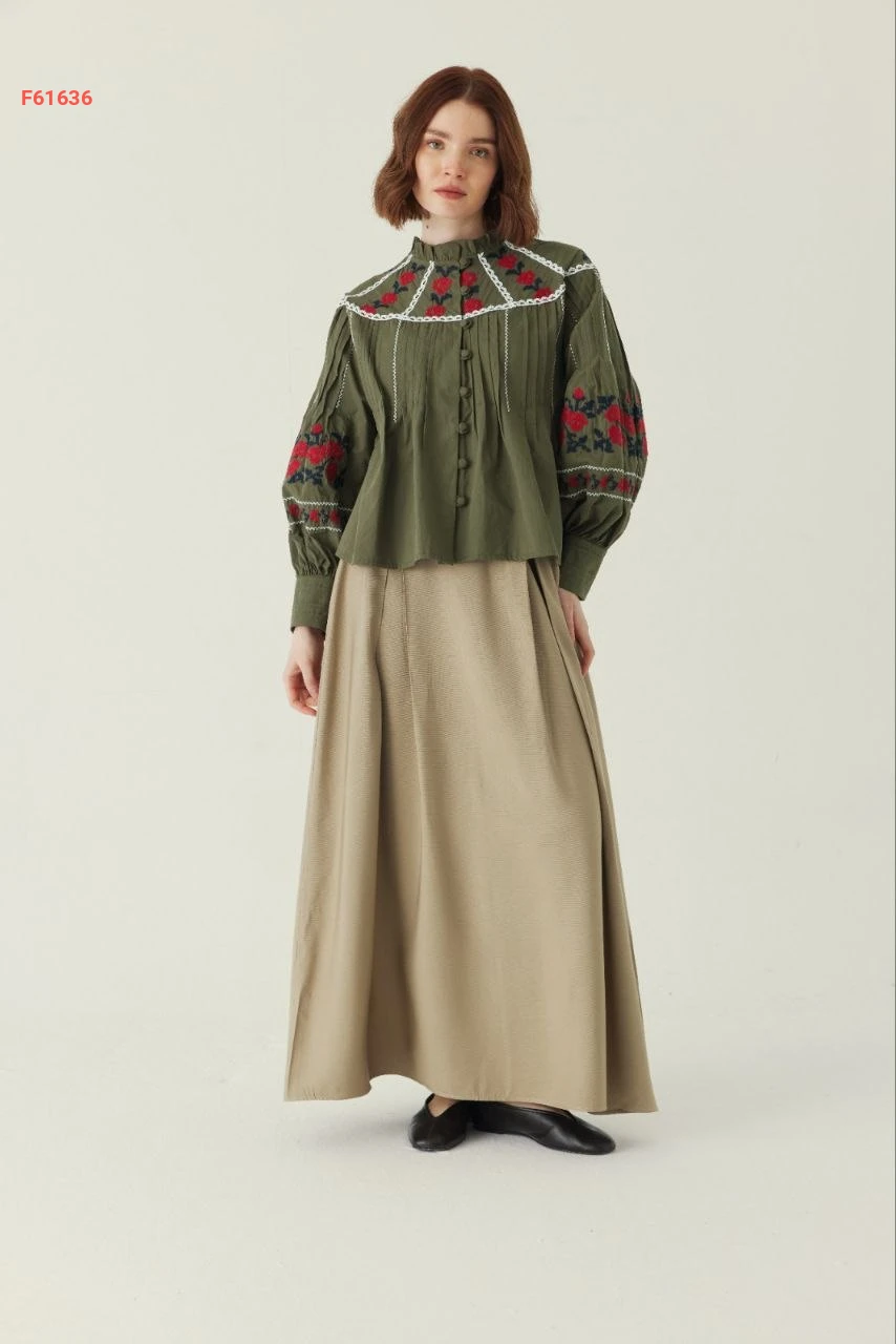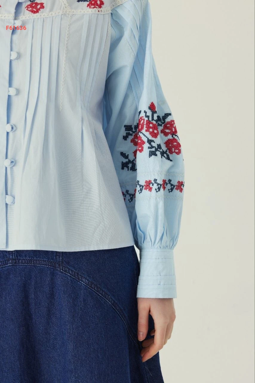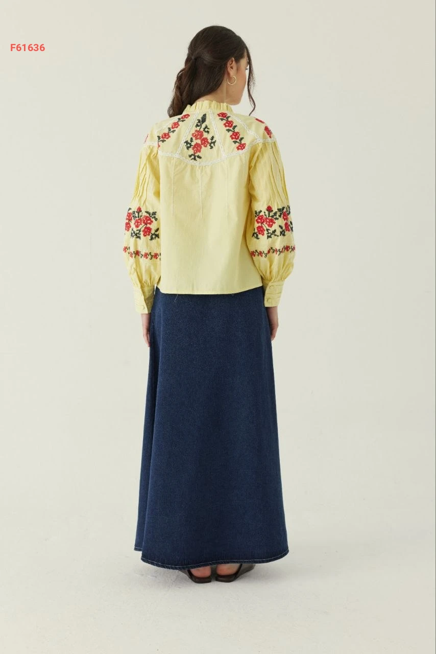 قميص مطرز ورد بأزرار، ياقة دائرية ، بأكمام منفوخة