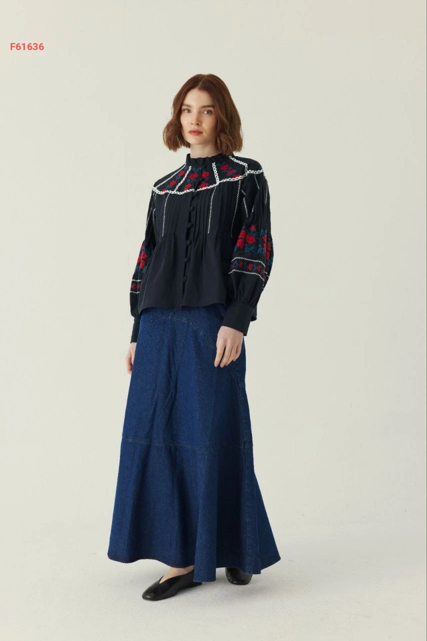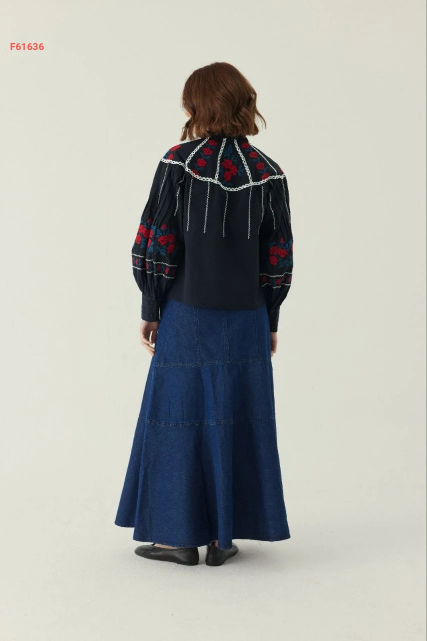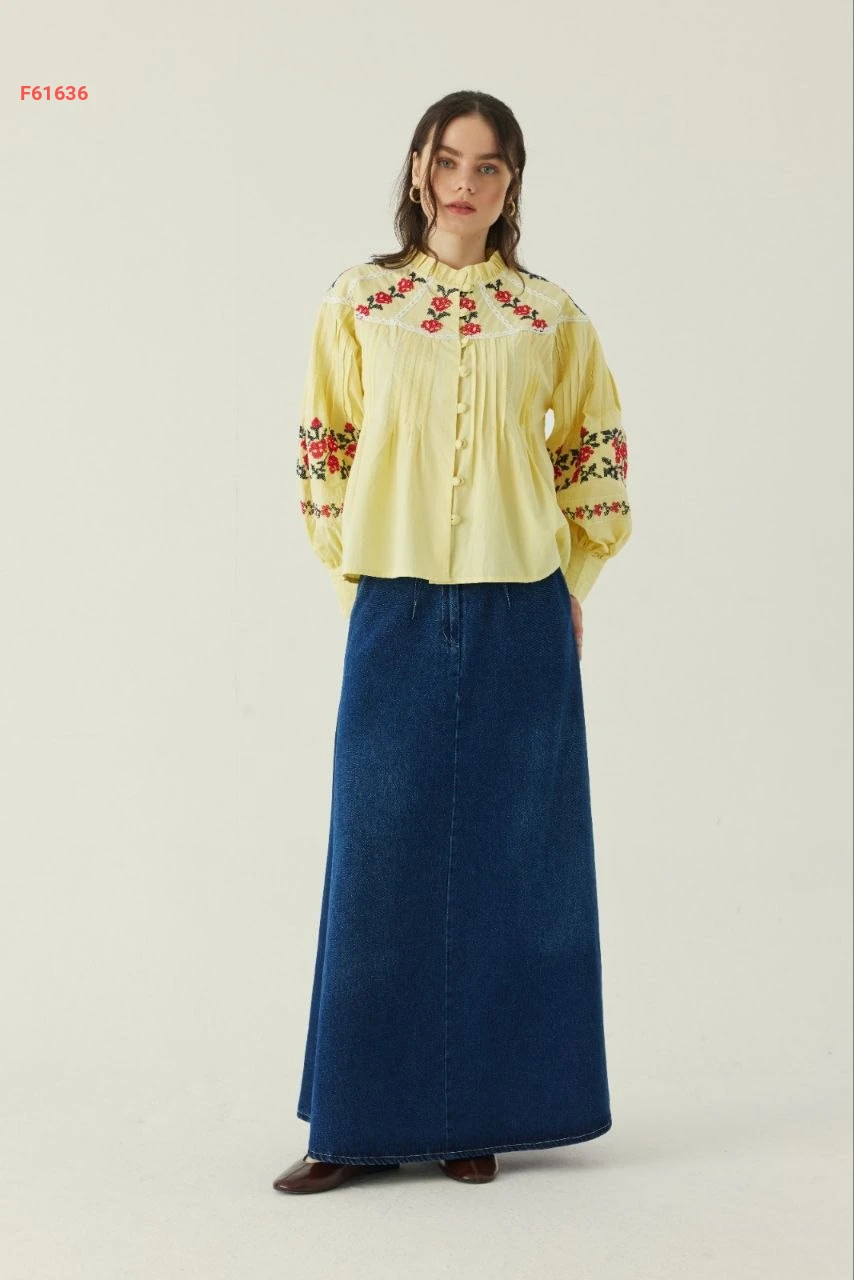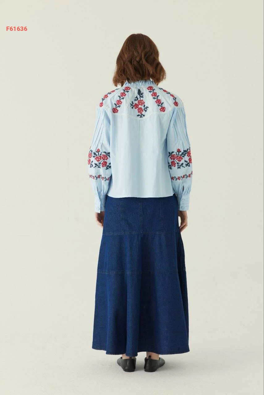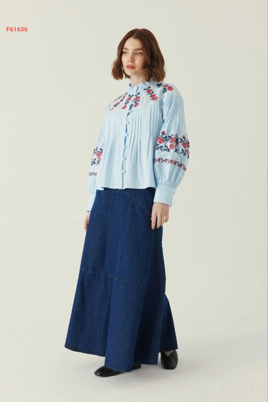 قميص مطرز ورد بأزرار، ياقة دائرية ، بأكمام منفوخة