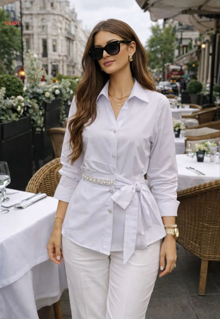 قميص بوبلين مع زنار مطرز أحجار