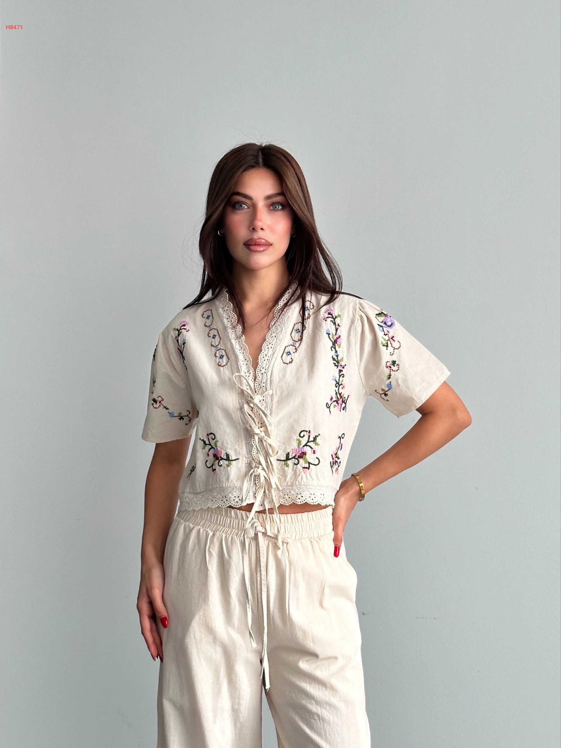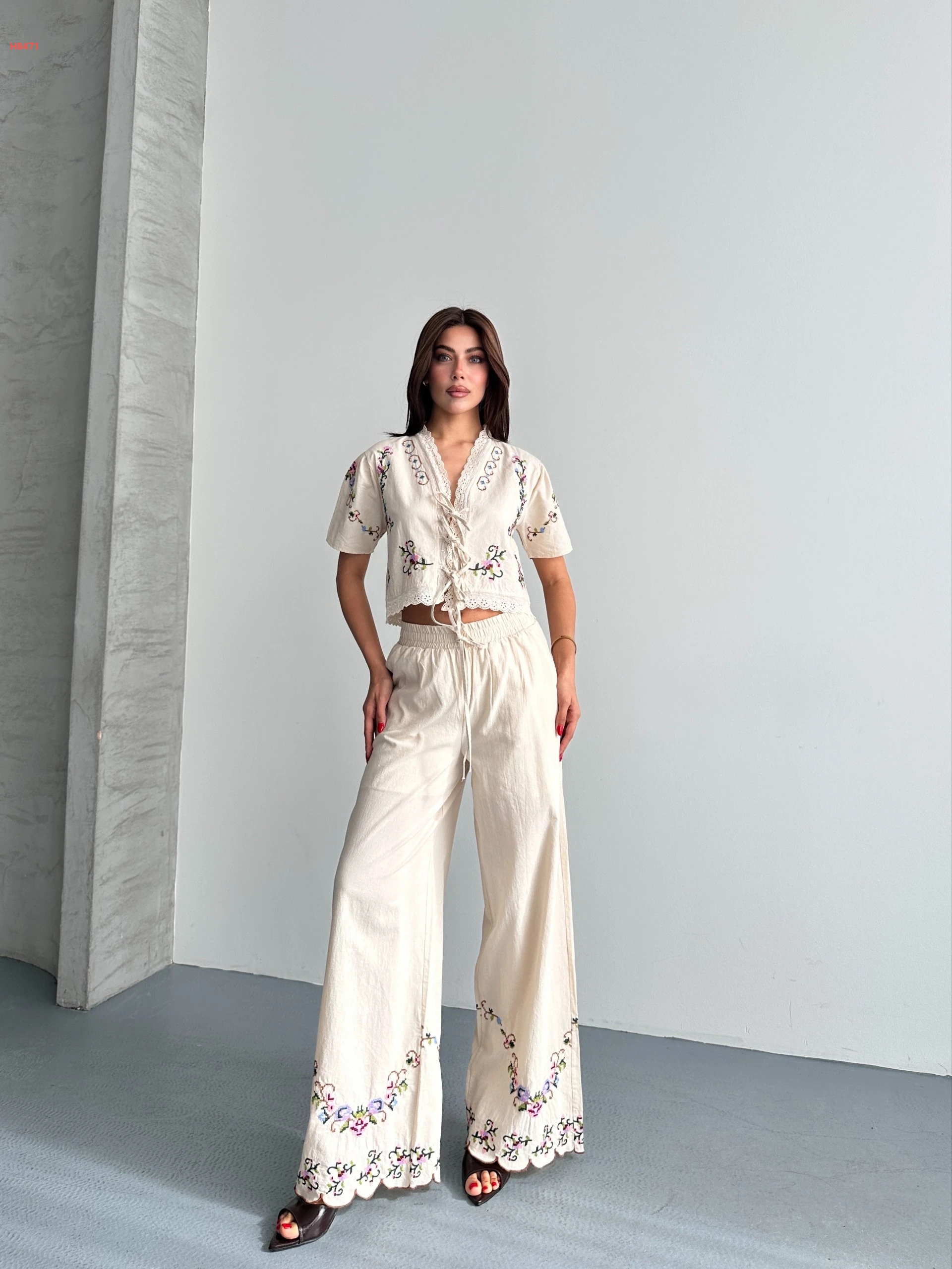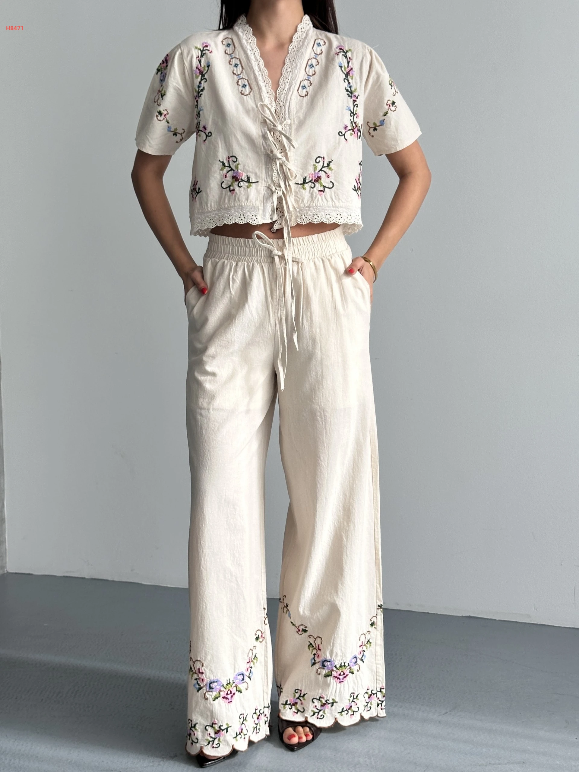 طقم بنطال صيفي مطرز مع بلوزة بربطات