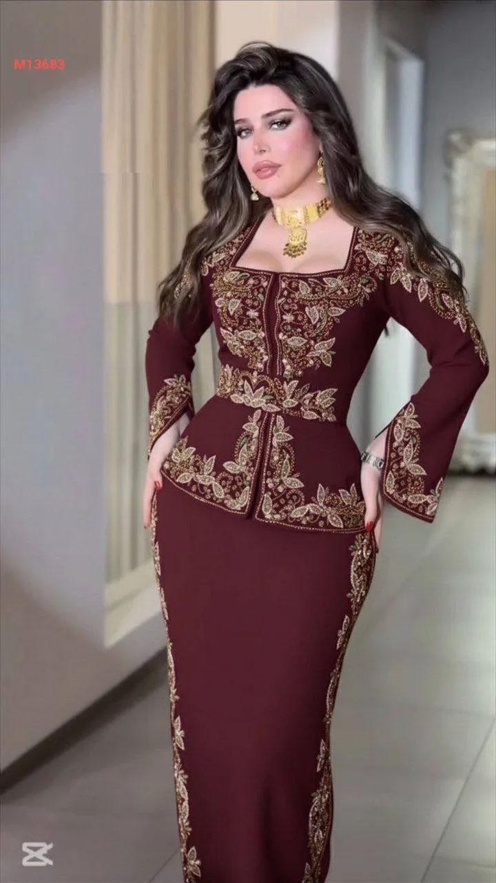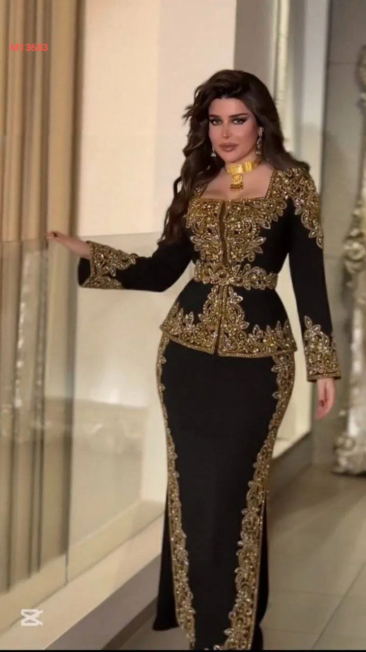 طقم قطعتين سهرة مطرز ، مرصع بالكريستال والألماس وشك الذهبي مع حزام