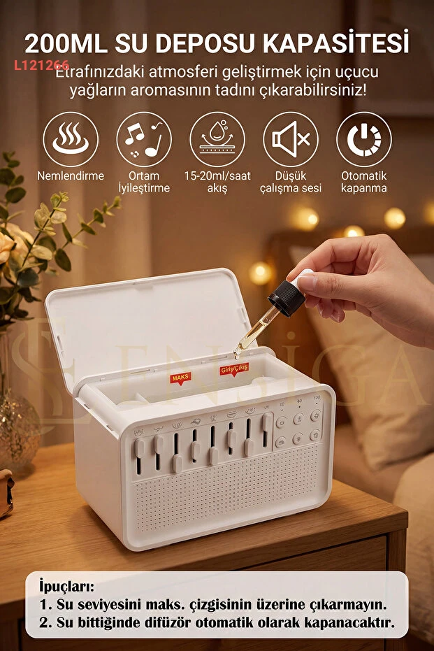استمتع بنوم هانئ وهادئ مع صندوق الصوت المرطب EN SİGA، الذي يقدم لك 8 أصوات محيطة مريحة تساعد على الاسترخاء والنوم. كما يتميز بإضاءة ليلية ناعمة توفر جوًا مريحًا في غرفتك، مما يجعله الرفيق المثالي لليالي الساكنة. جهز نفسك لرحلة استرخاء ساحرة مع كل غفوة!
