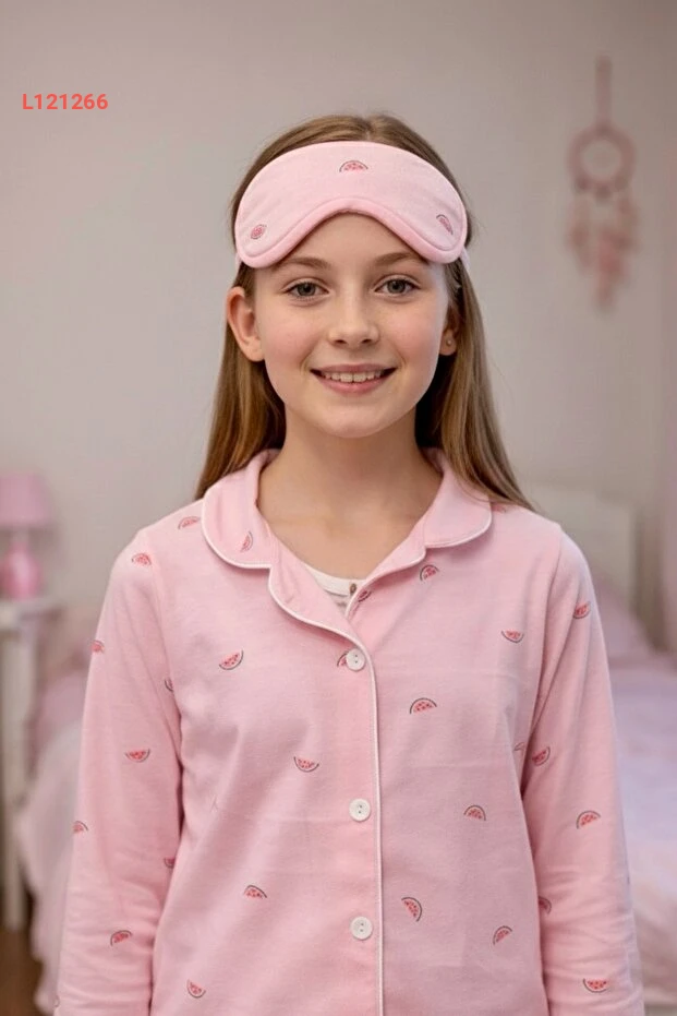 طقم بيجامة طويل الأكمام للأطفال من إنّي، قطن 100% بتصميم بطيخة + رباط عيون