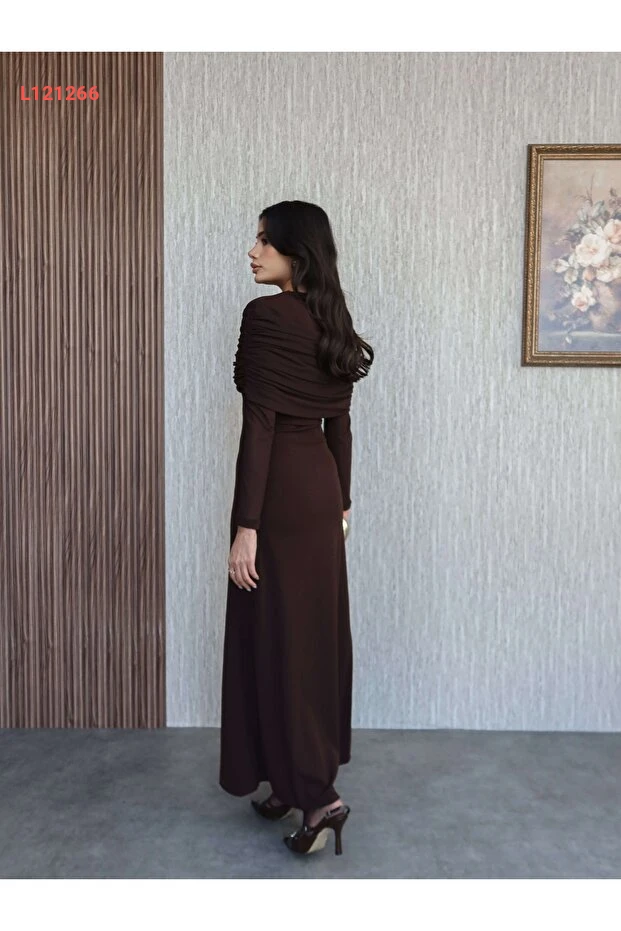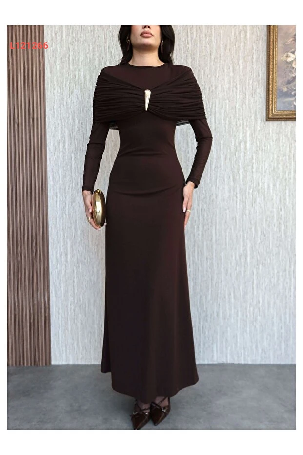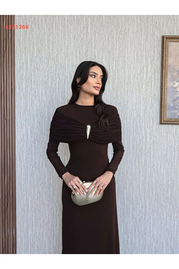 فستان طويل بأكمام مع أزرار تزيينية من إسراء هيلفاجي