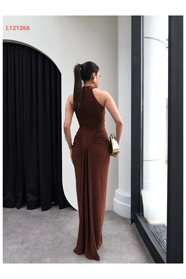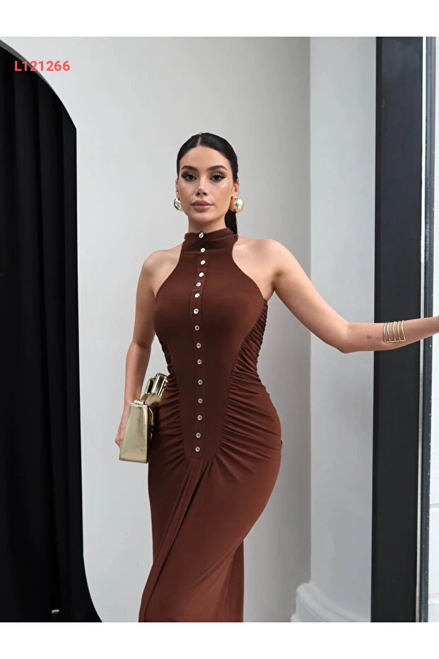 فستان طويل مزين بتفاصيل أزرار وجوانب مزمومة - إسراء هيلفاجي