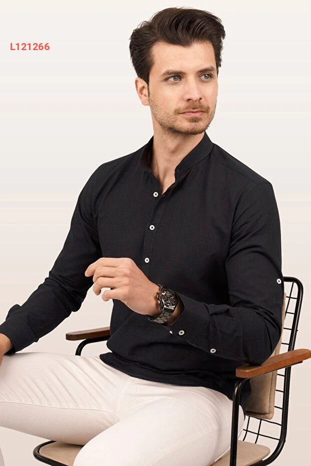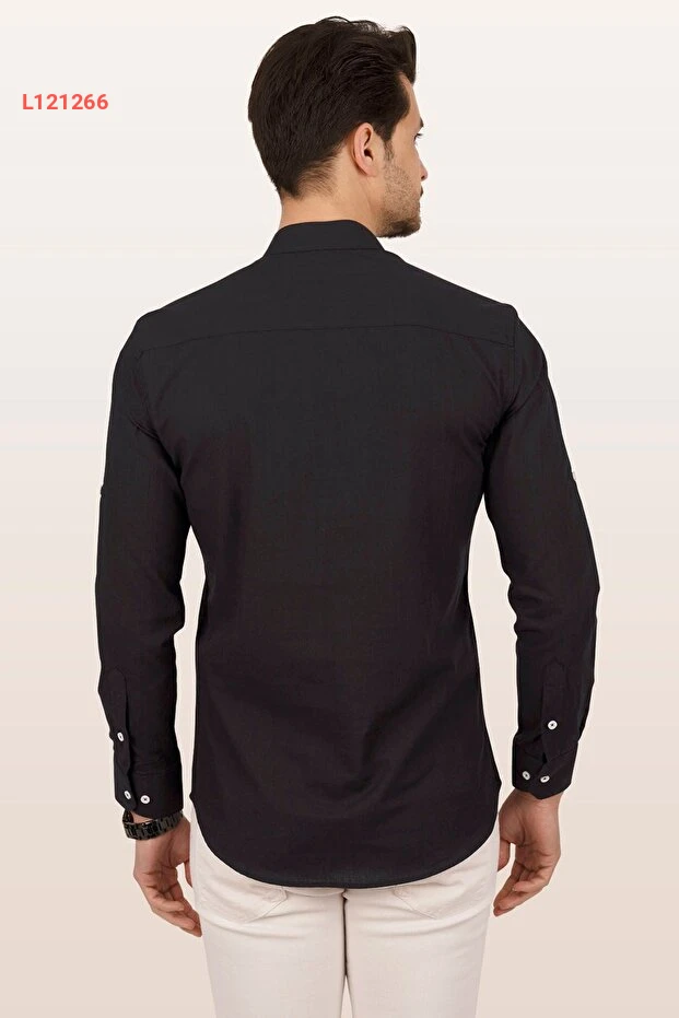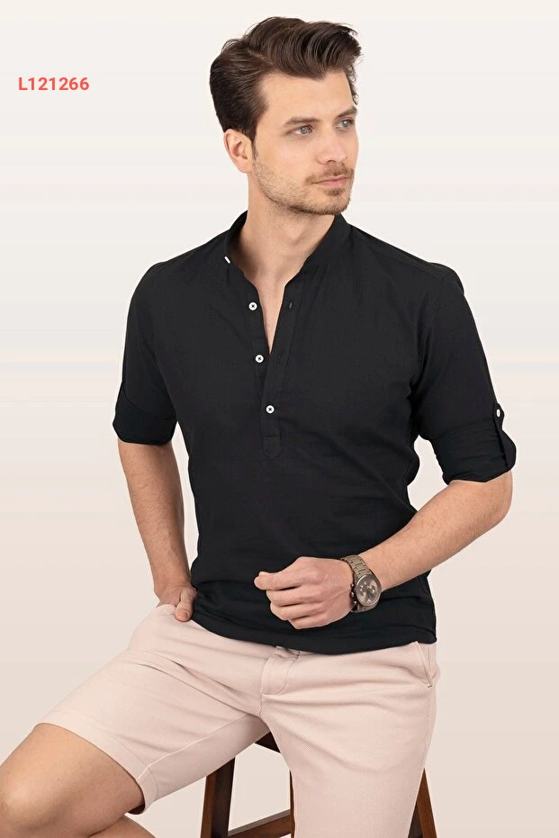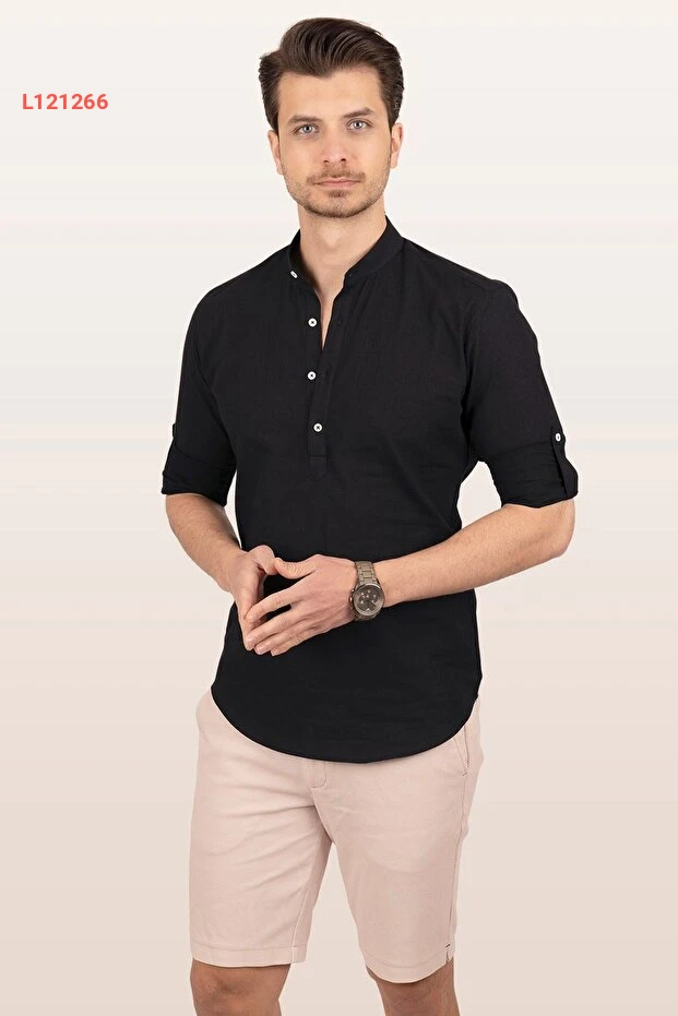 قميص رجال كتان أسود بحلّة حاكمية مزود بثلاثة أزرار