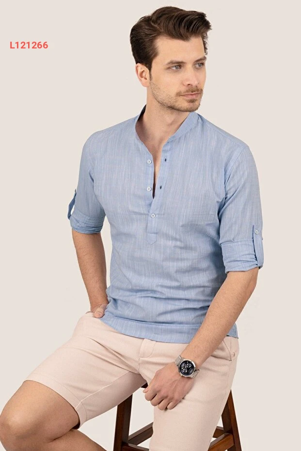 قميص بولو أزرق ثلاثي الأزرار للرجال من نسيج الكتان