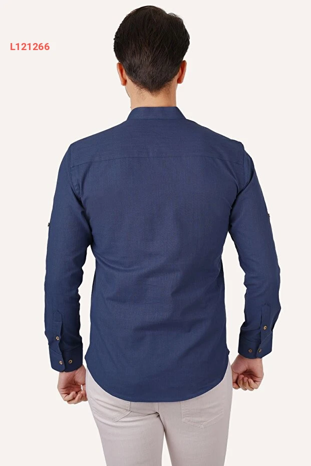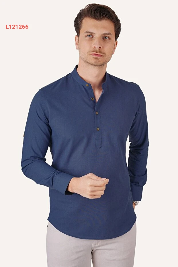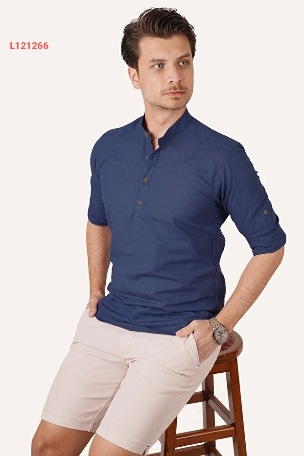 قميص رجالي كتان أزرق نافي بسحاب متميز ثلاثي الأزرار