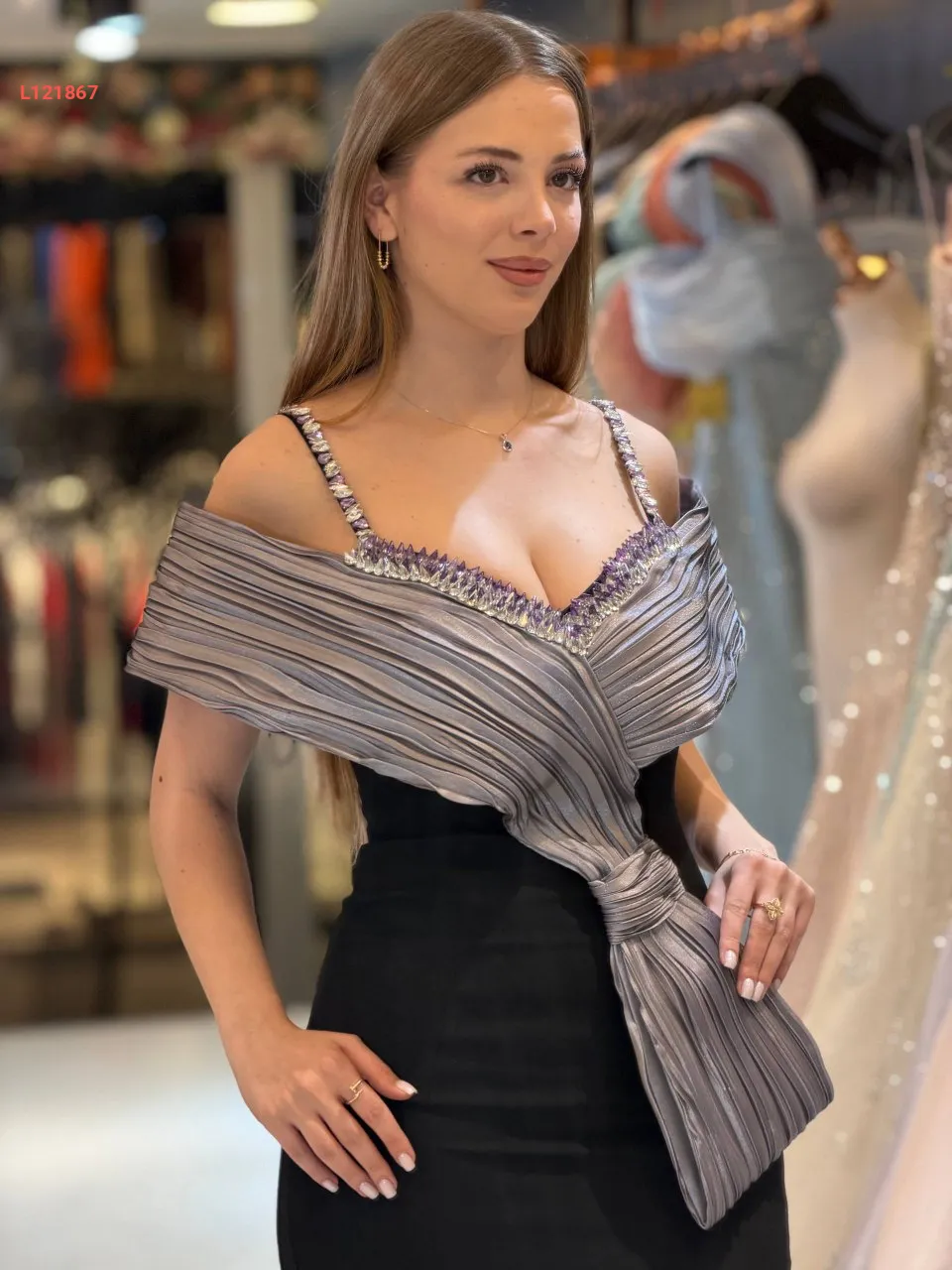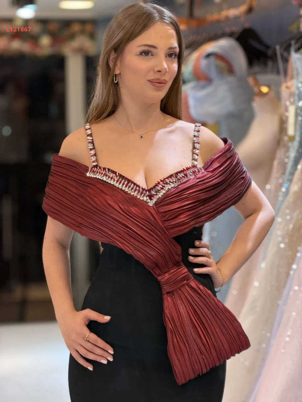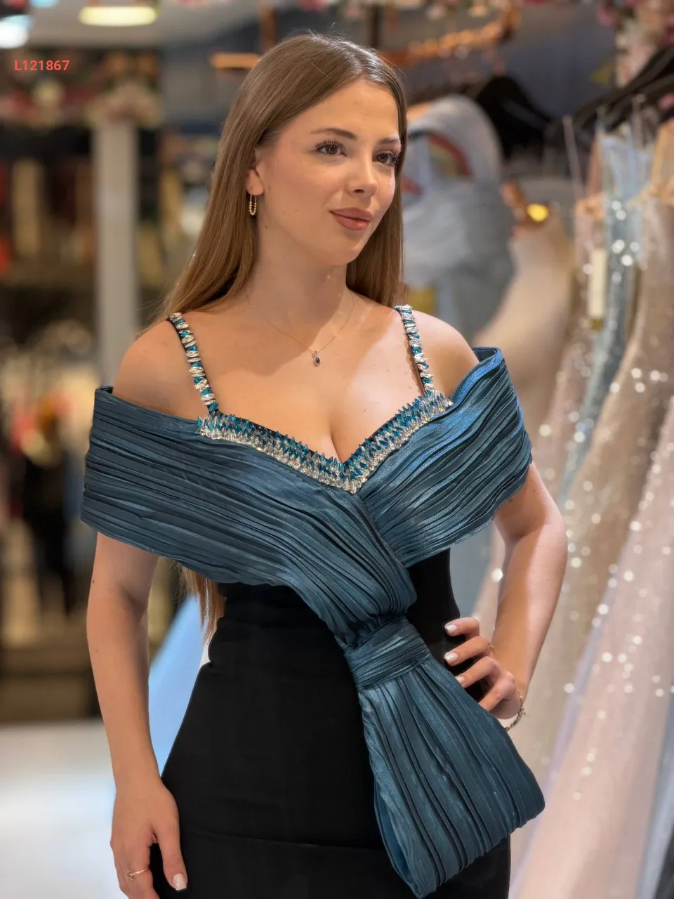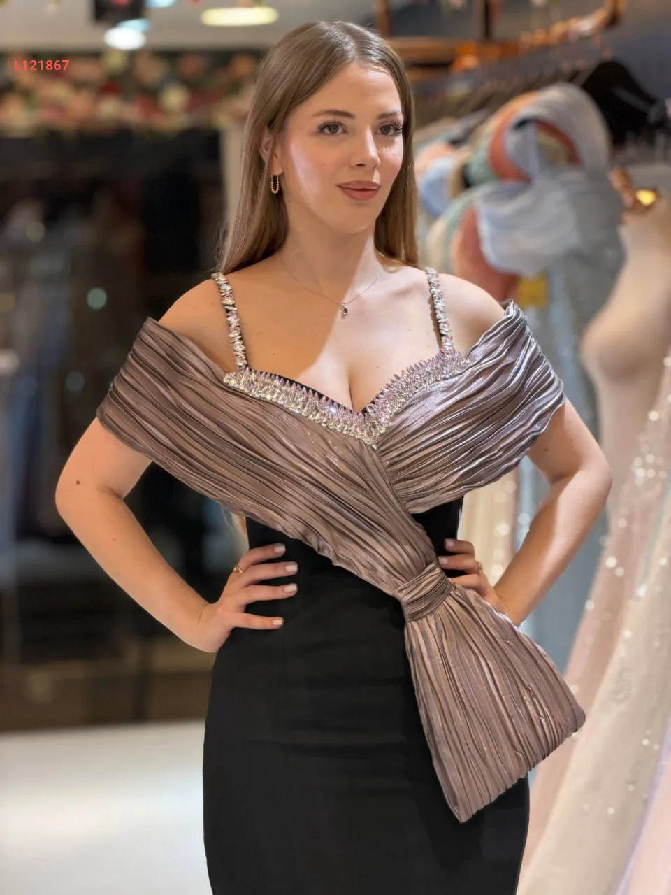 فستان سواريه ،موديل ضيق مكشوف الظهر والصدر ، مرصع بالكريستال