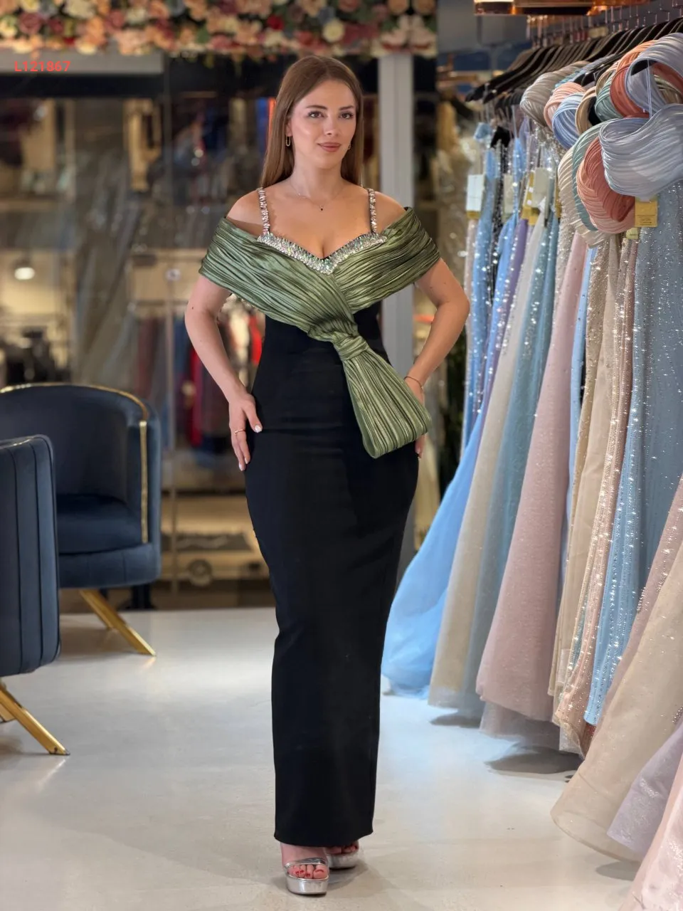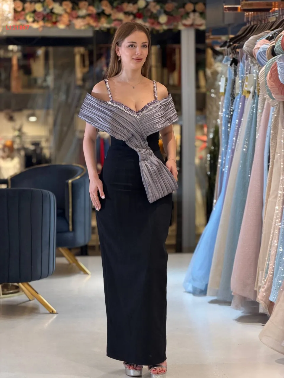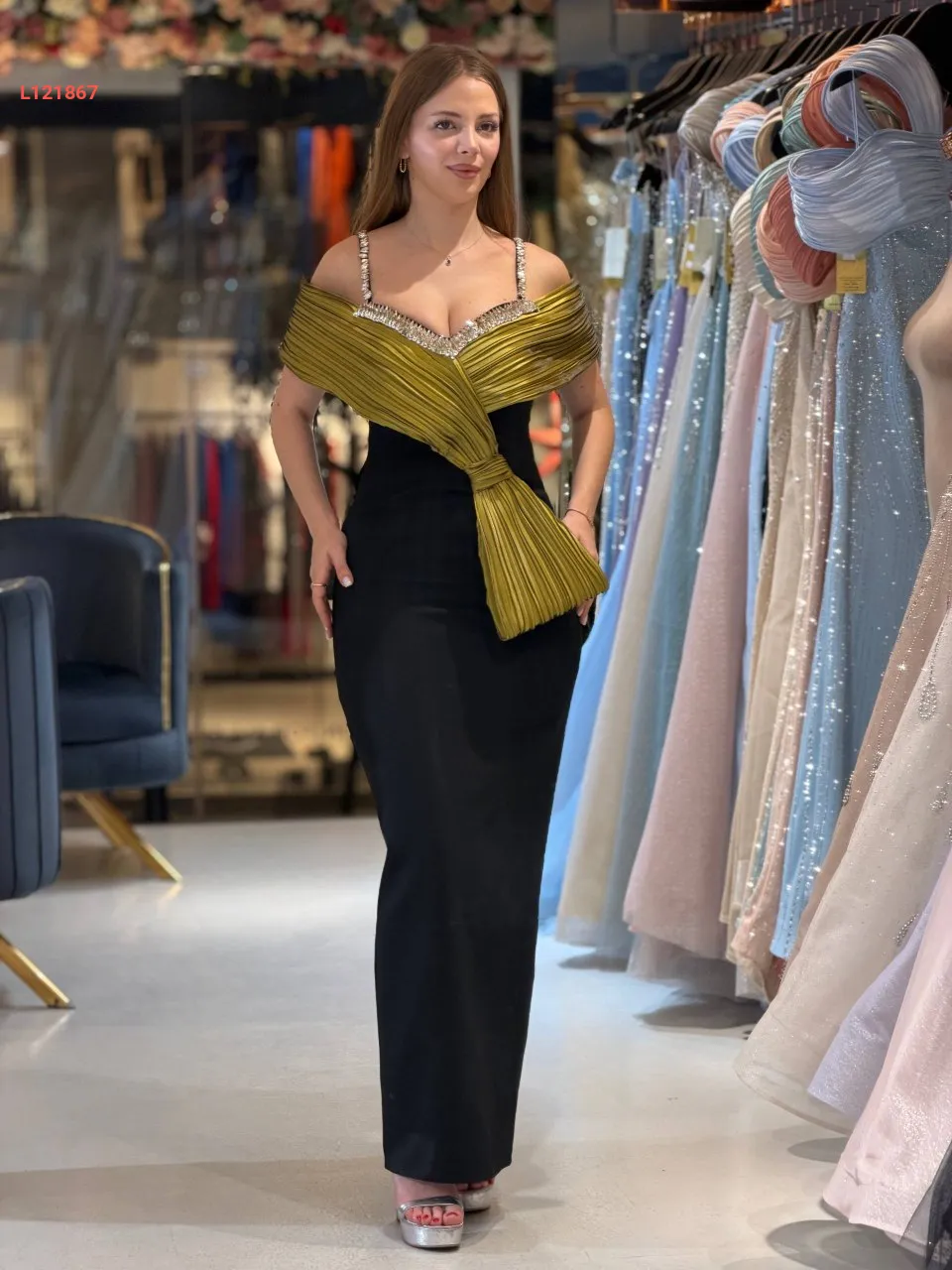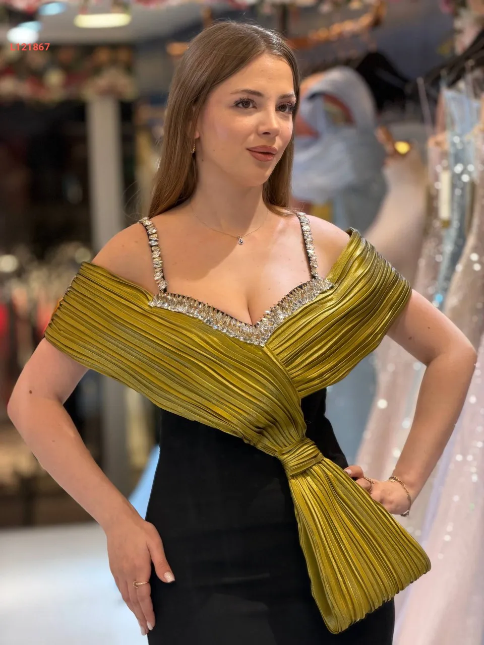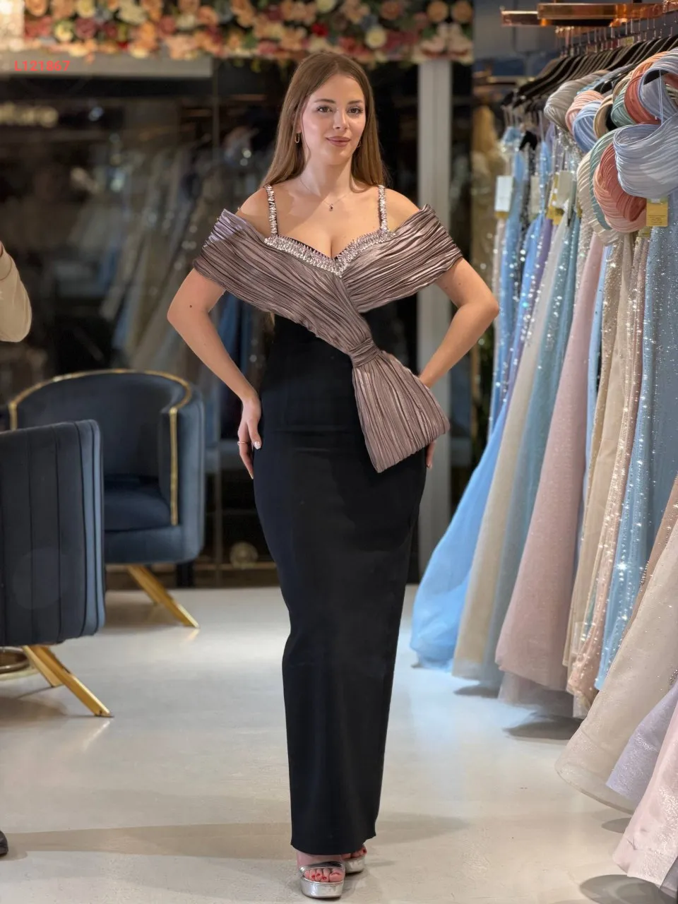 فستان سواريه ،موديل ضيق مكشوف الظهر والصدر ، مرصع بالكريستال