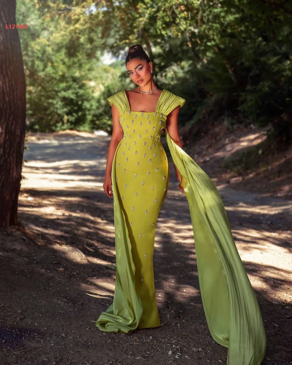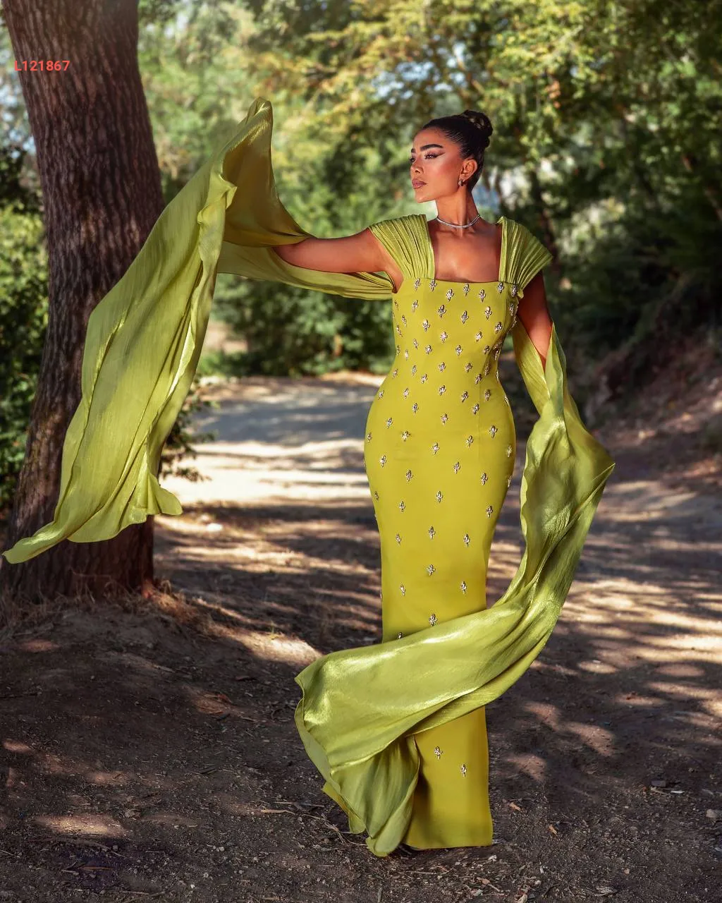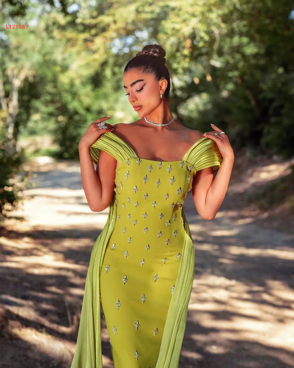 فستان سواريه، مزين بالكريستال، بقصة مشدودة مكشوف الصدر والظهر، بأكتاف ساتان مع شاحط