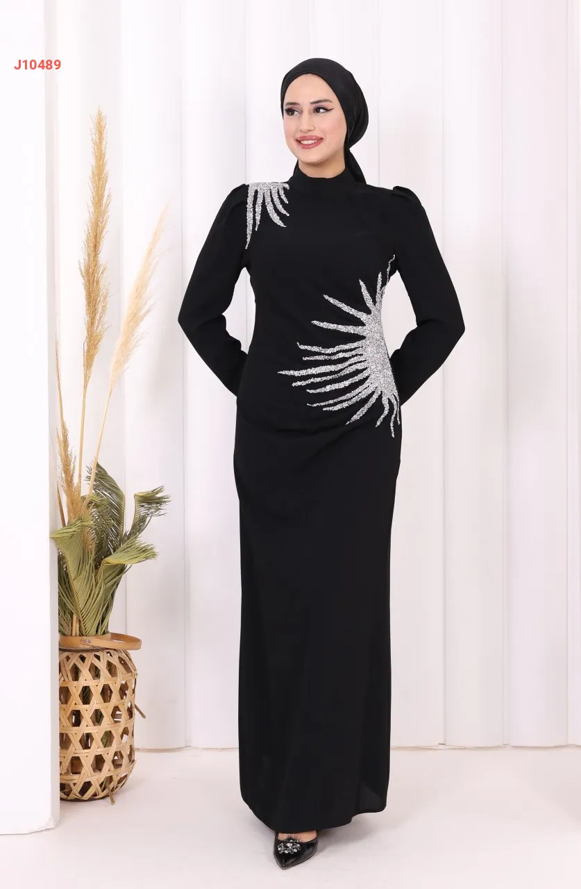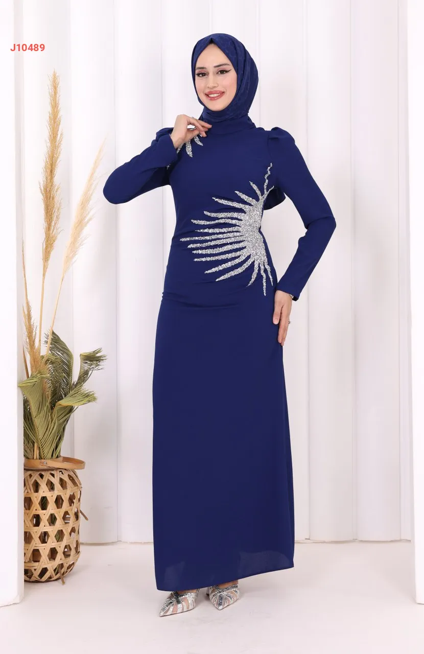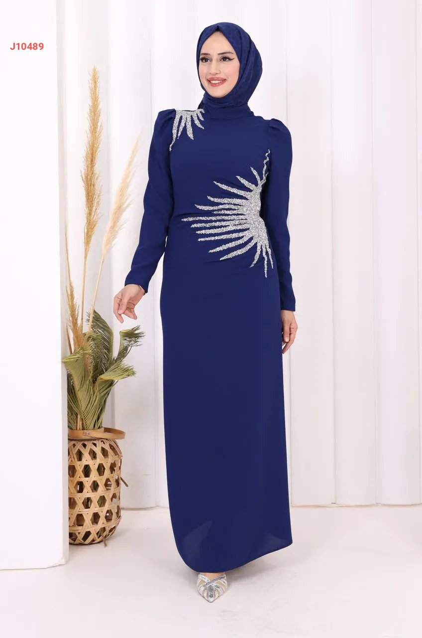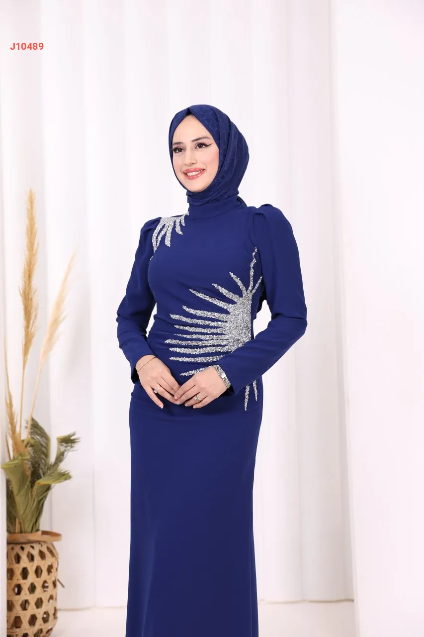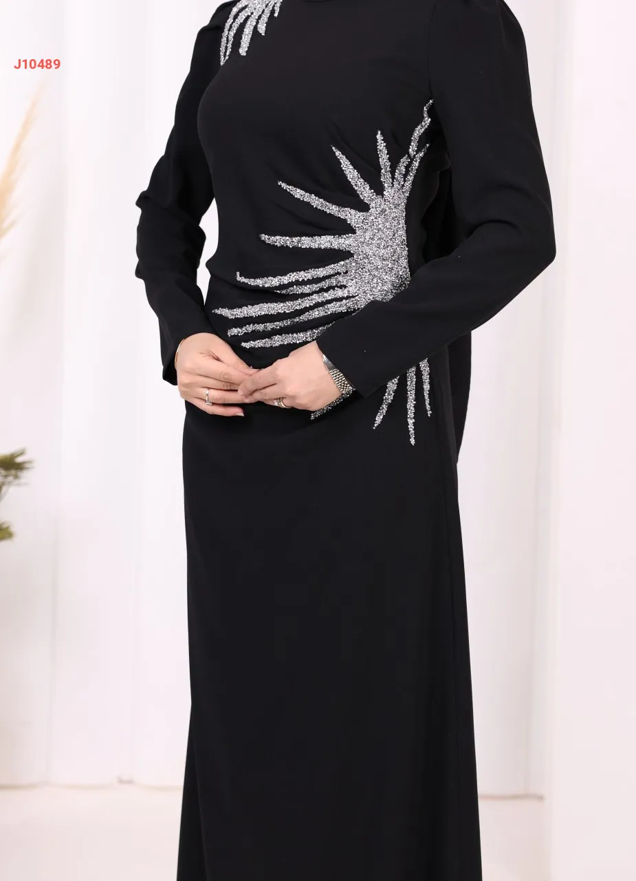 فستان سواريه للمحجبات بأكمام ضيق شك فضي عند الصدر والكتف