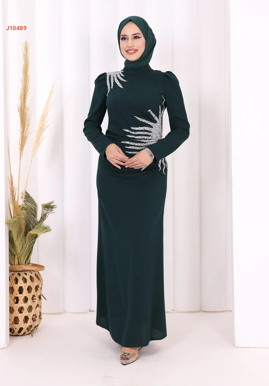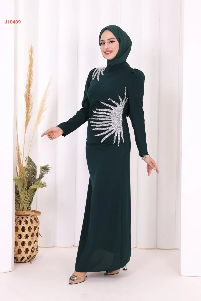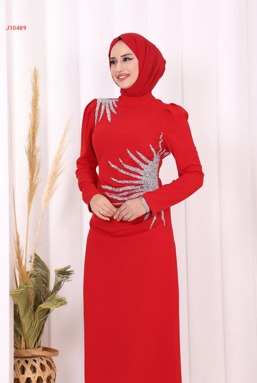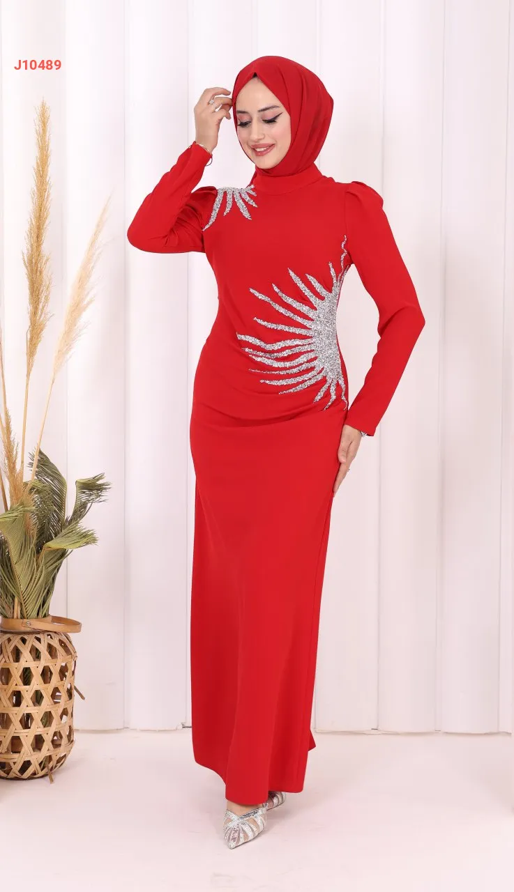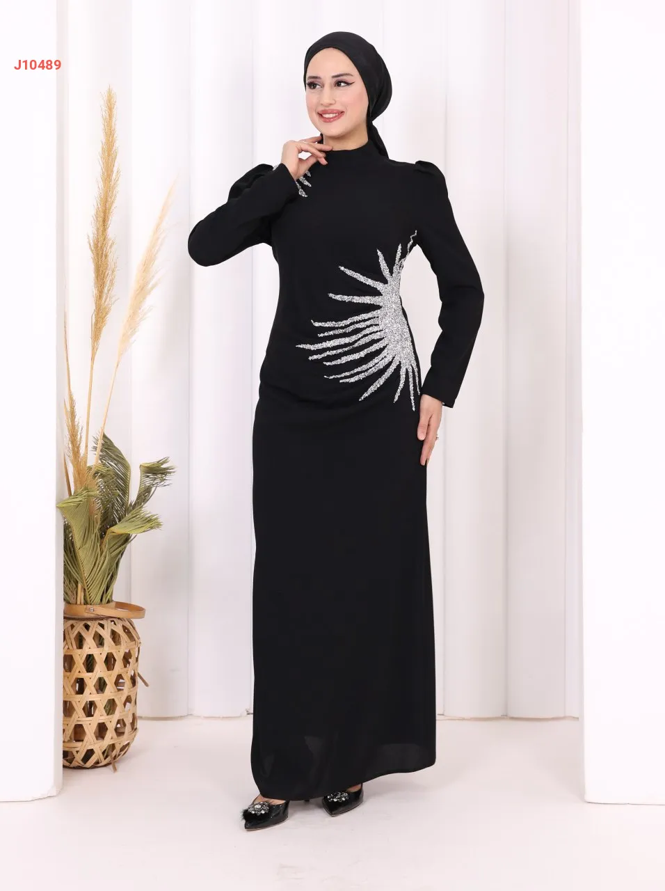 فستان سواريه للمحجبات بأكمام ضيق شك فضي عند الصدر والكتف