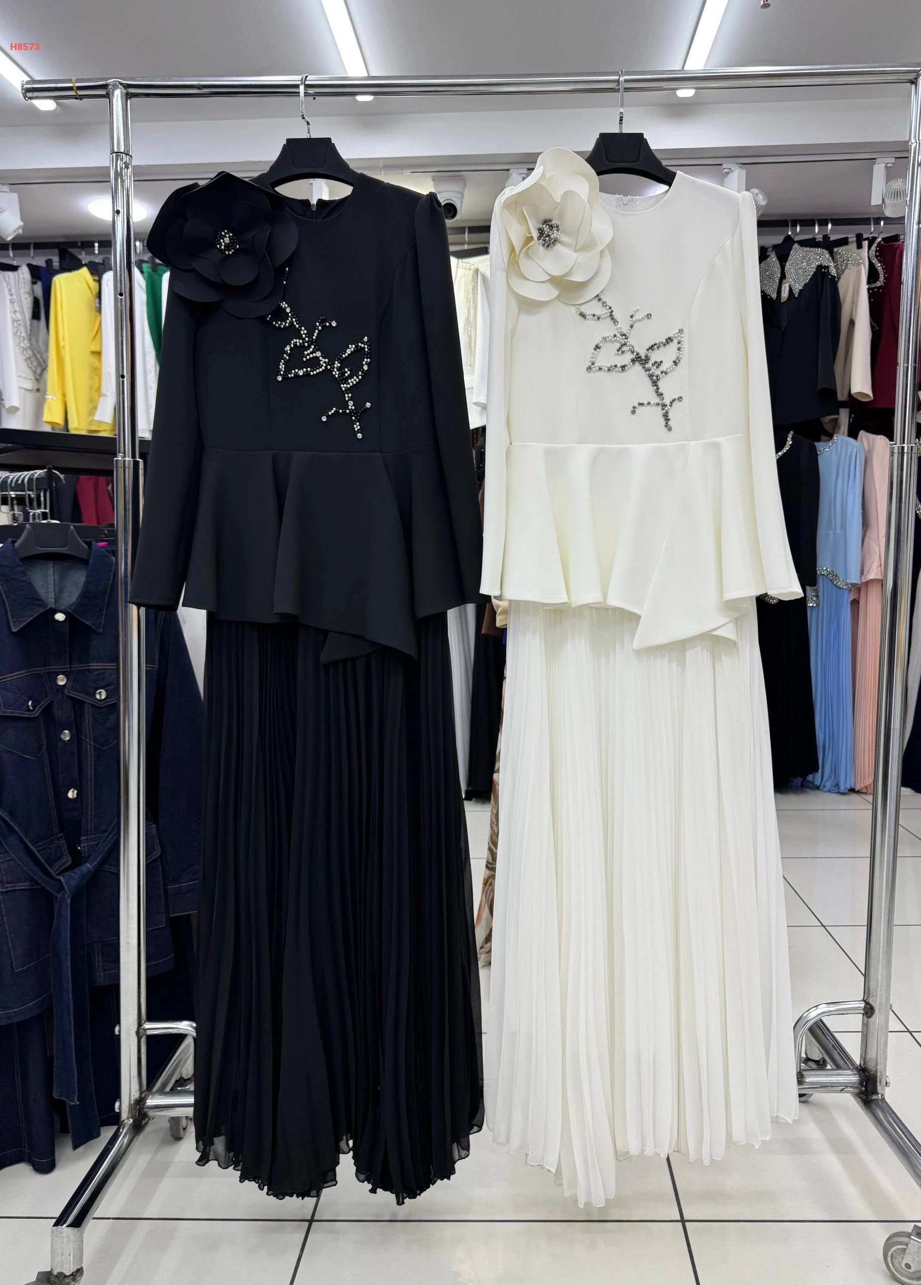 فستان سواريه بكسرات ، بياقة دائرية مزين بوردة مع تطريز شك خرز