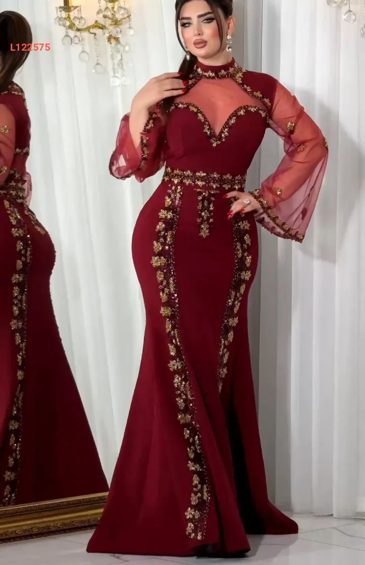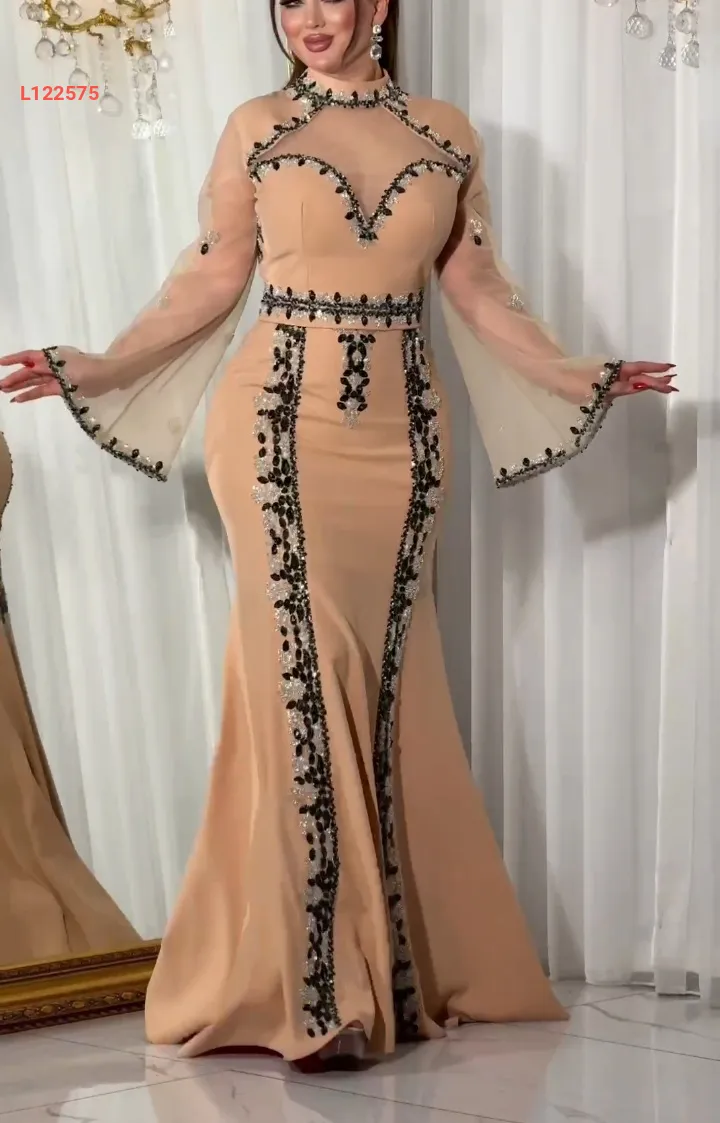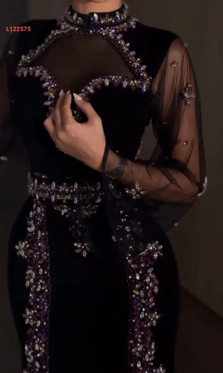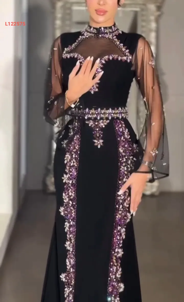 فستان سهرة بأكمام شفافة وأحجار ملونة