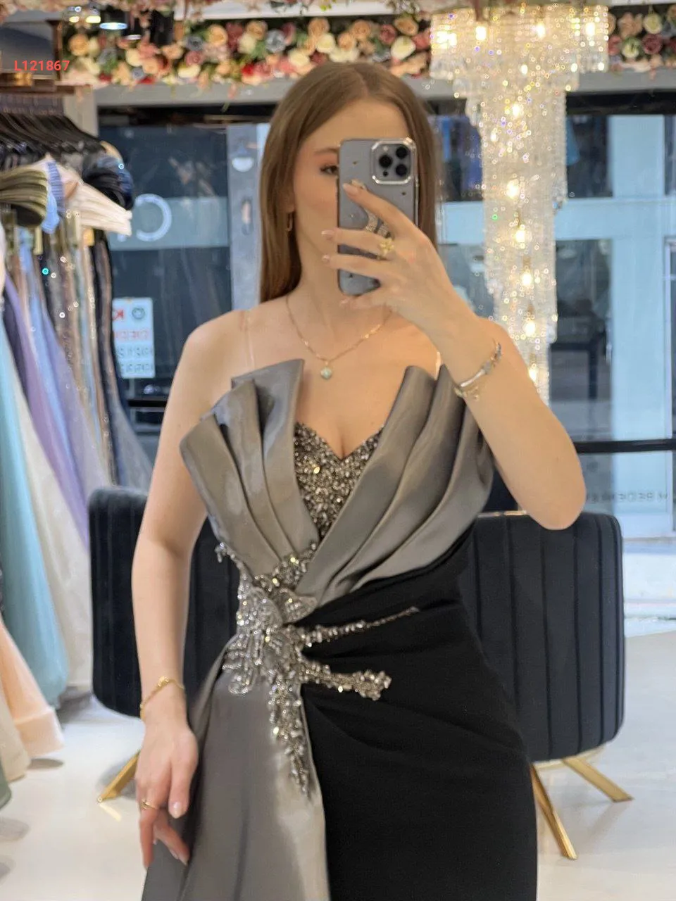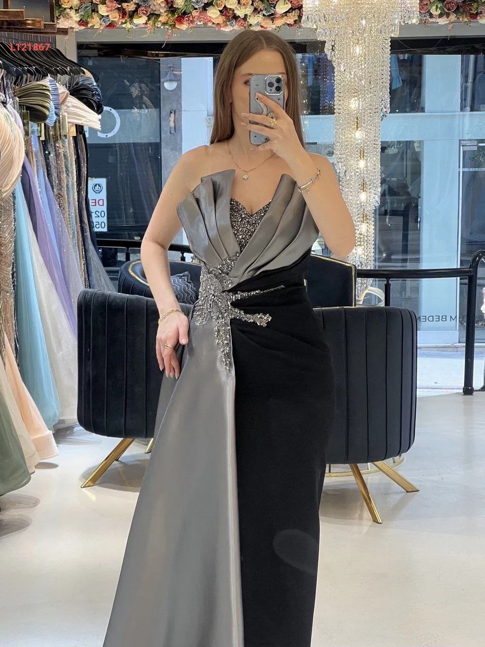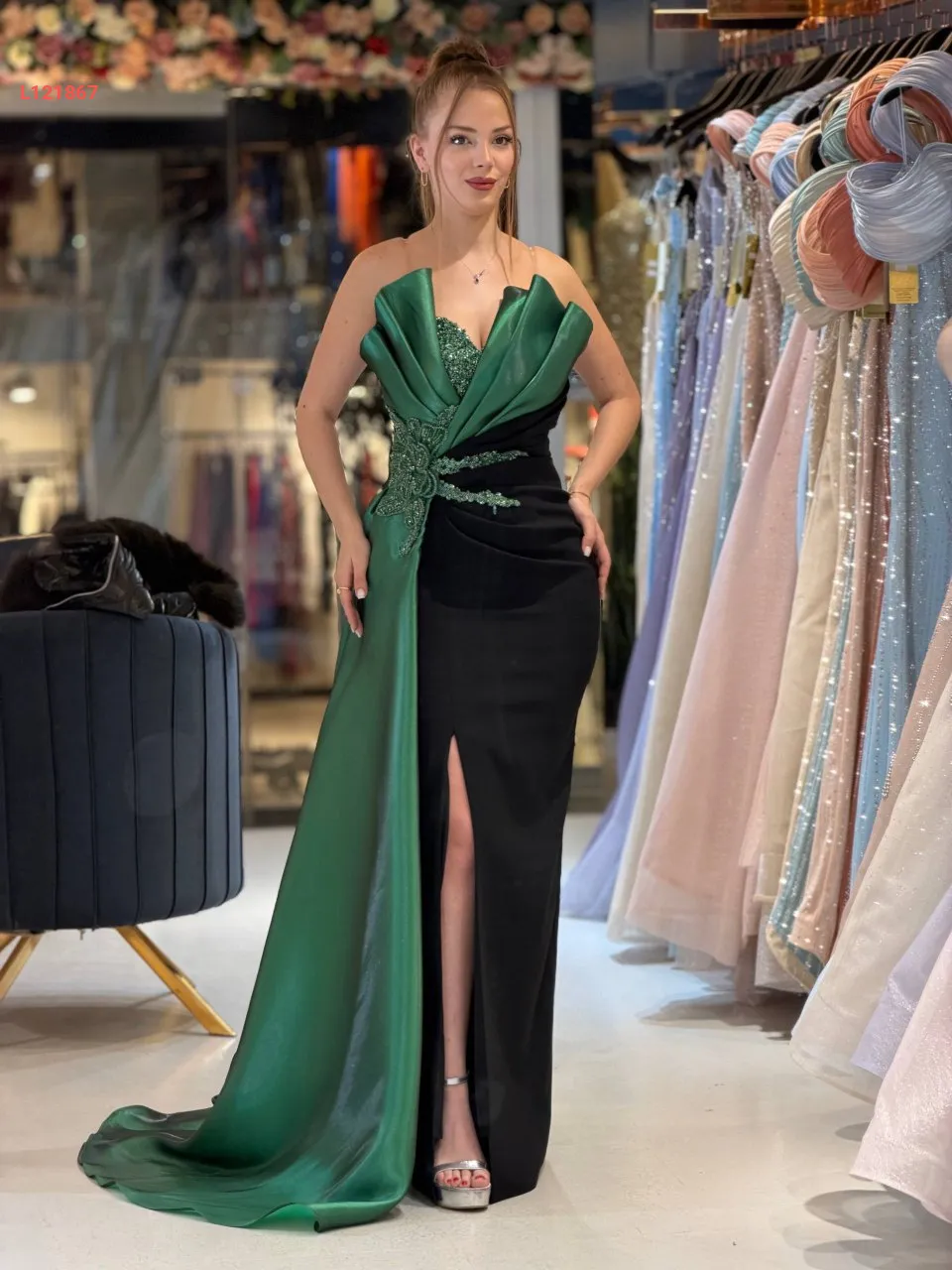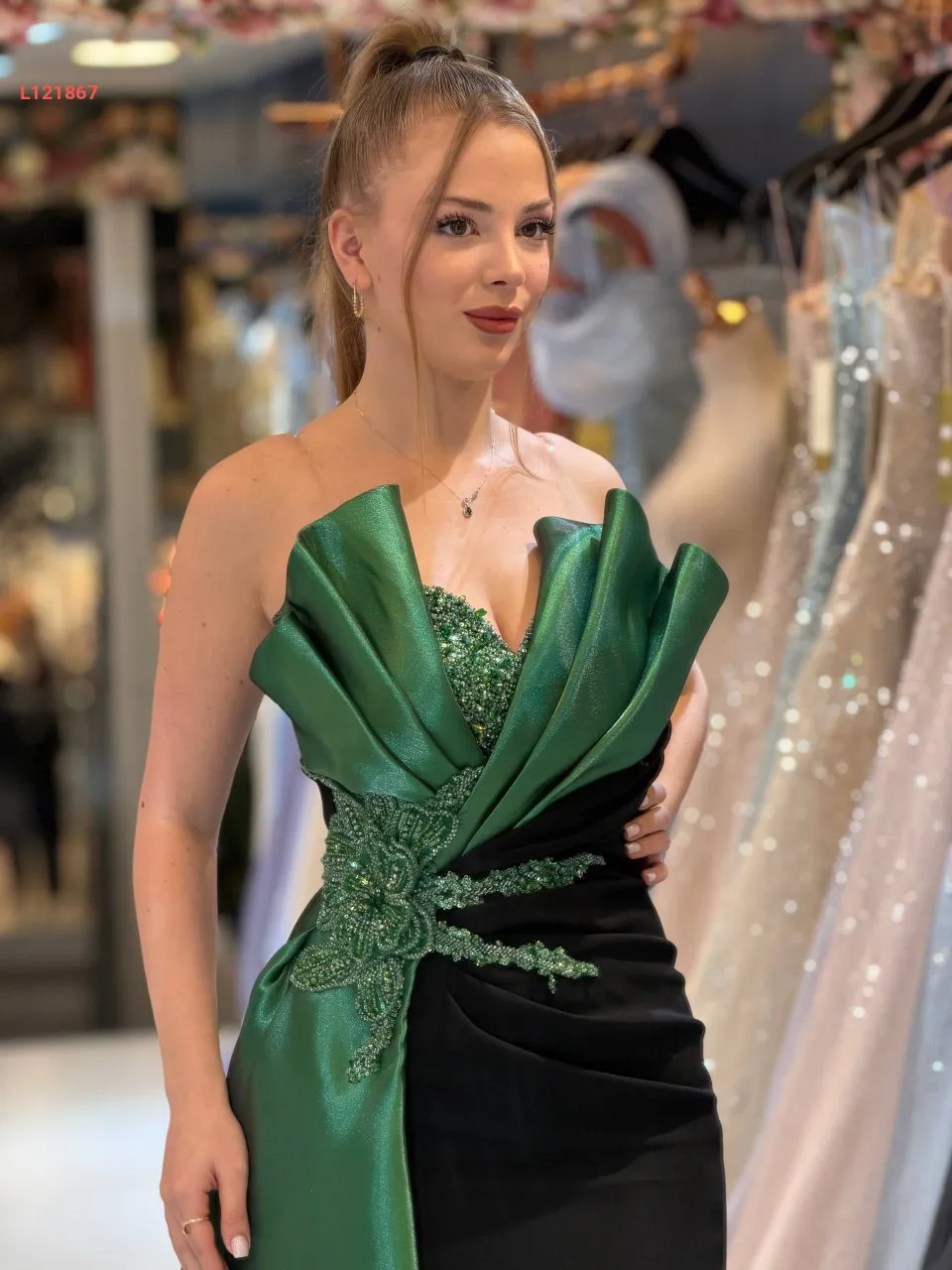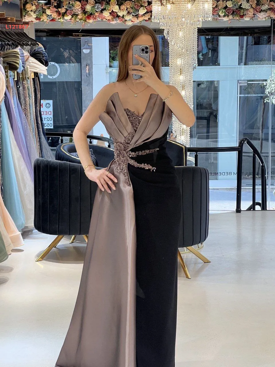 فستان سواريه مكشوف الصدر والظهر ، مع عرق شك عند الخصر والصدر مع شاحط ساتان جانبي