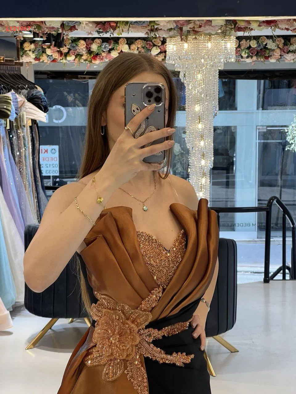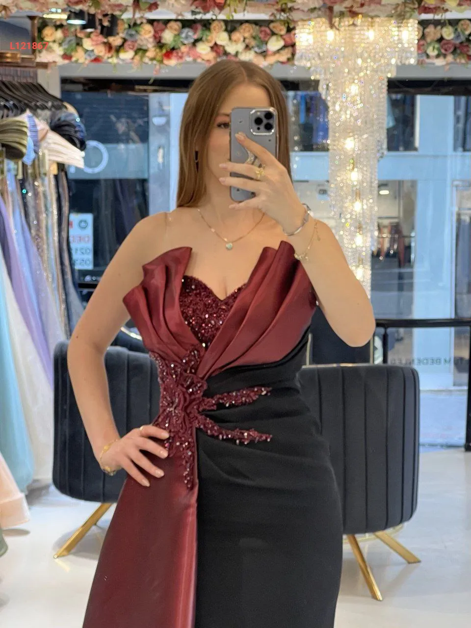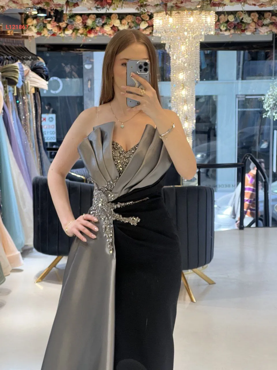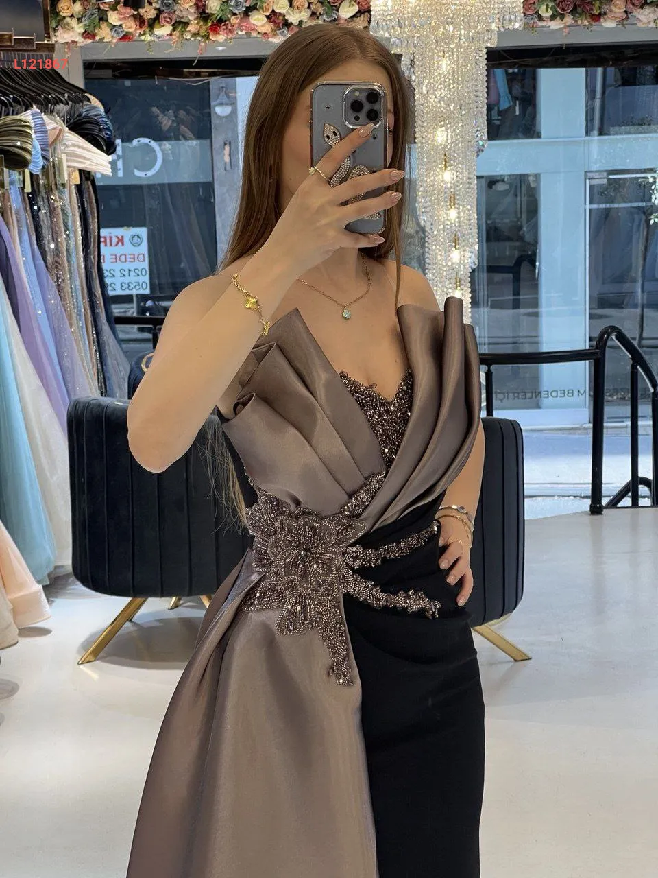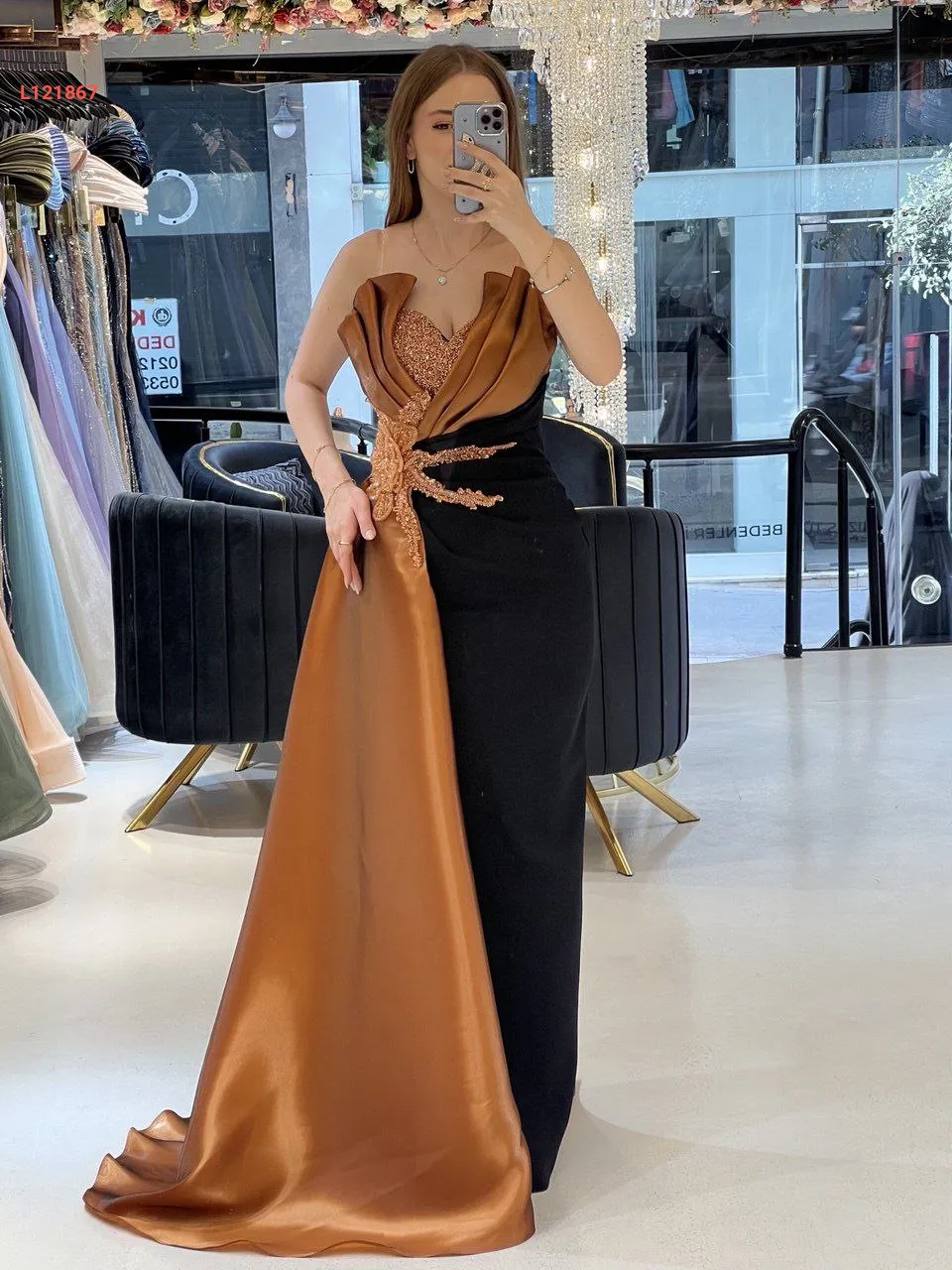 فستان سواريه مكشوف الصدر والظهر ، مع عرق شك عند الخصر والصدر مع شاحط ساتان جانبي