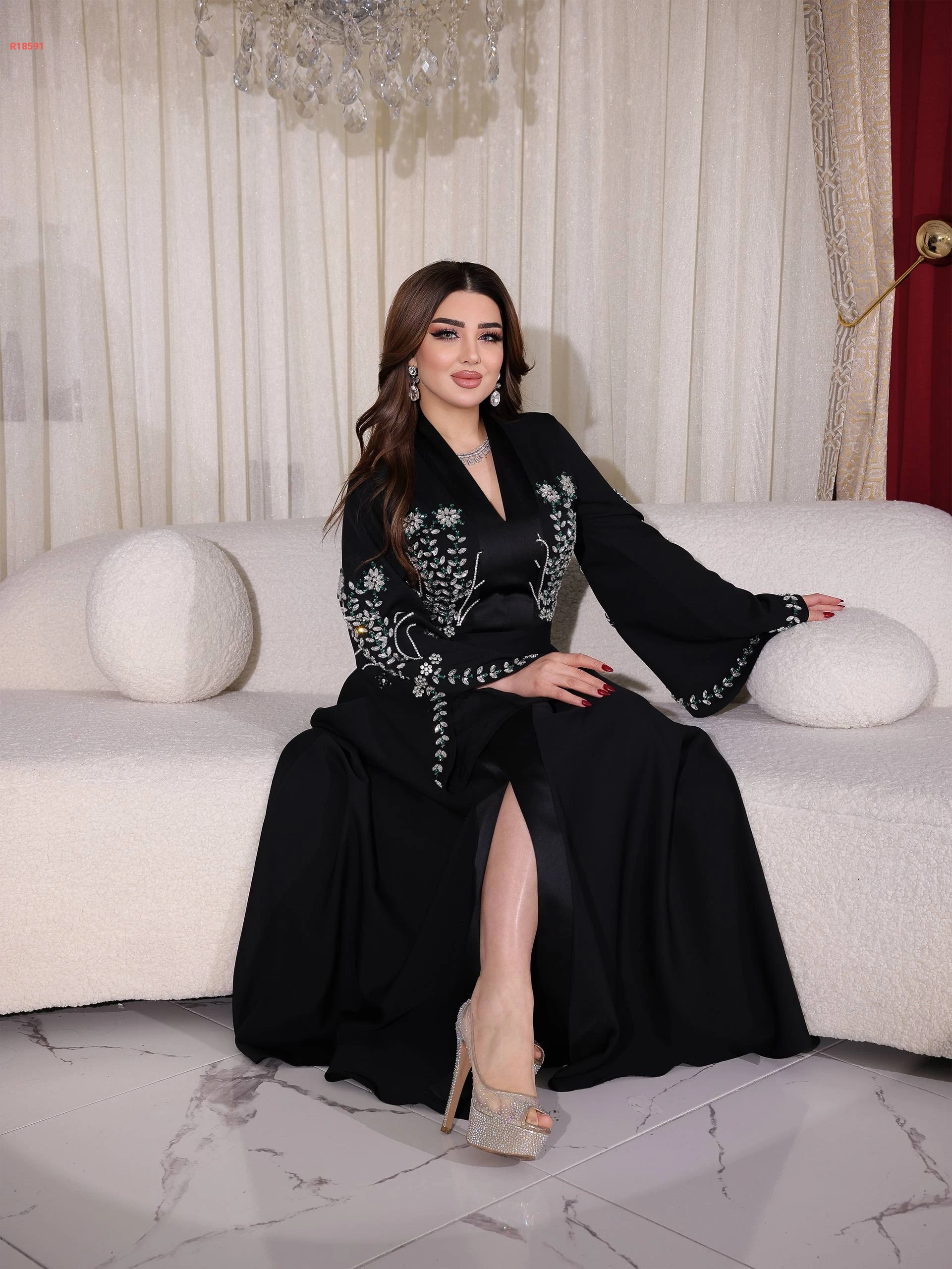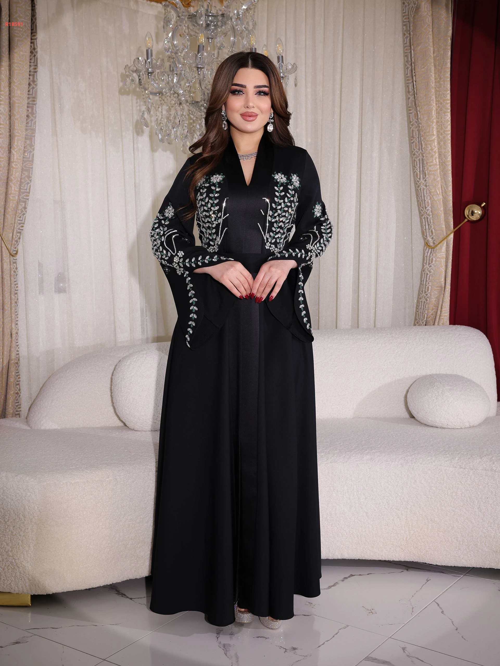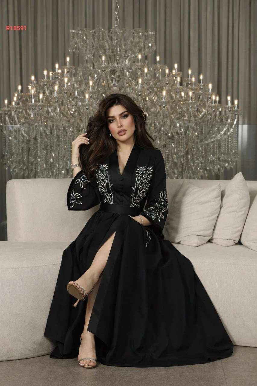 فستان سواريه بياقة فتح مرصع بالألماس عند الصدر و الأكمام بفتحة من الأمام