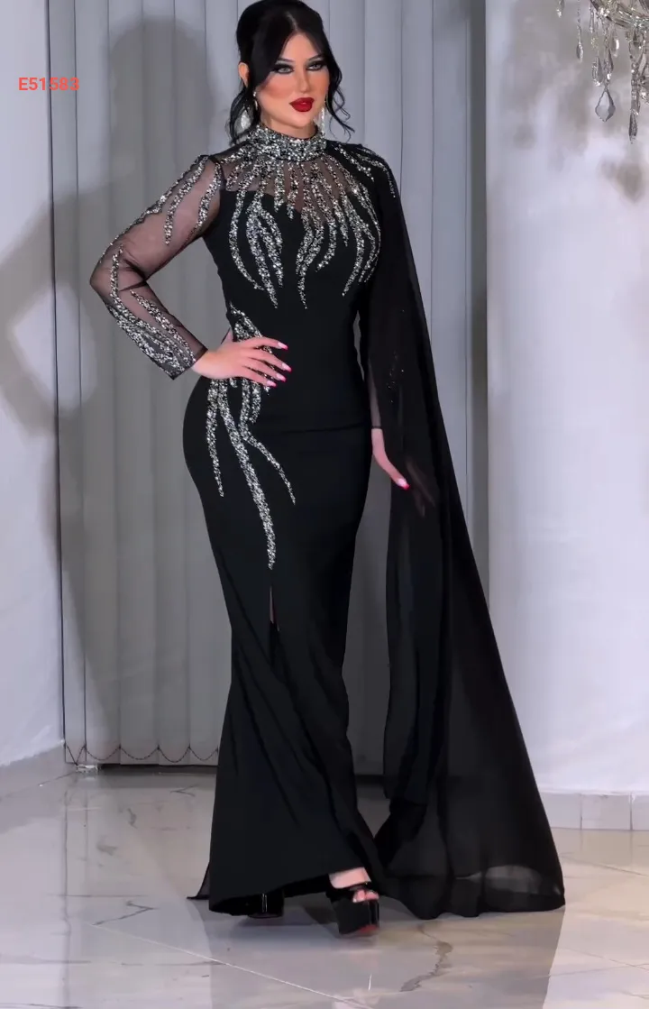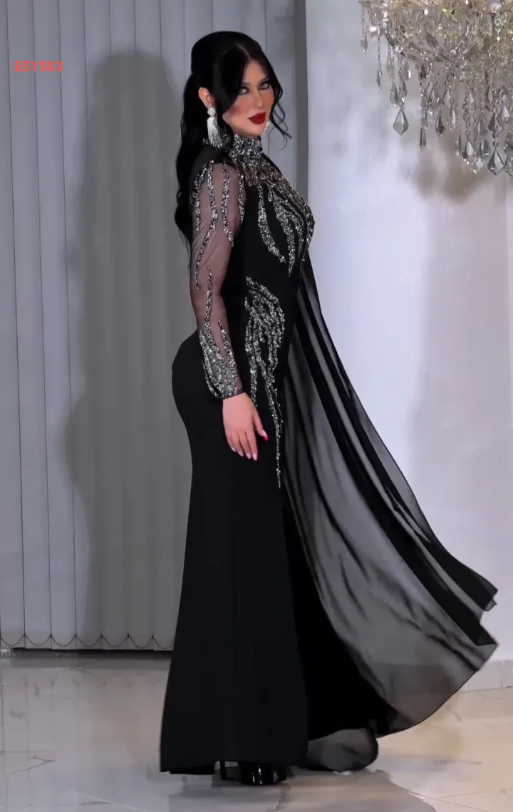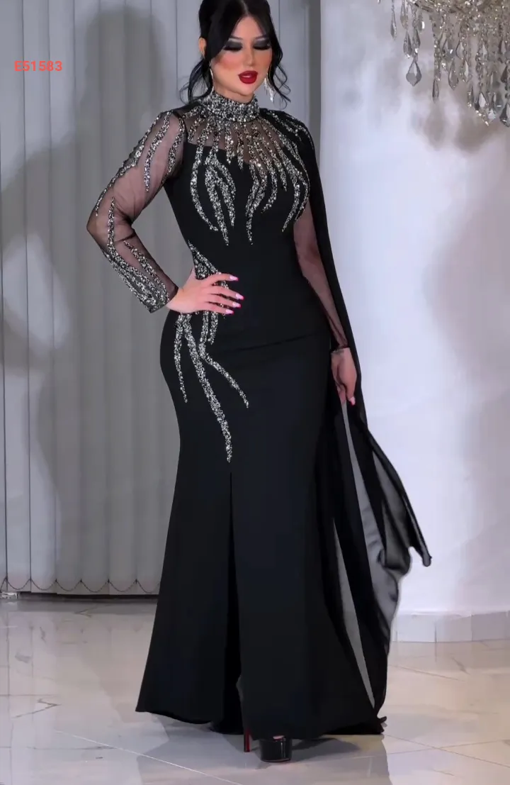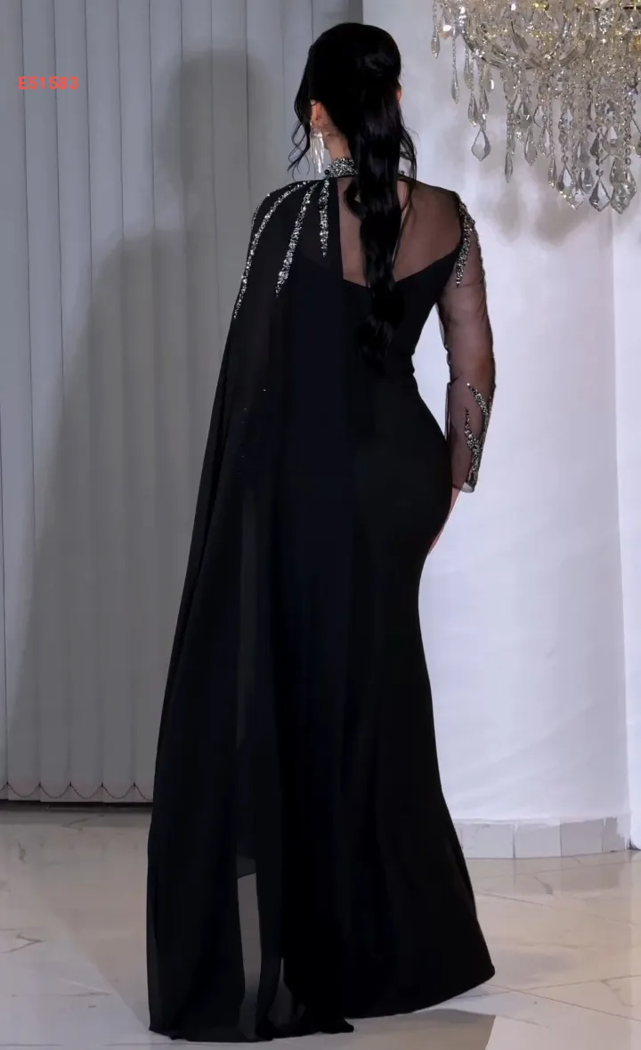فستان سهرة مرصع بكم شفاف